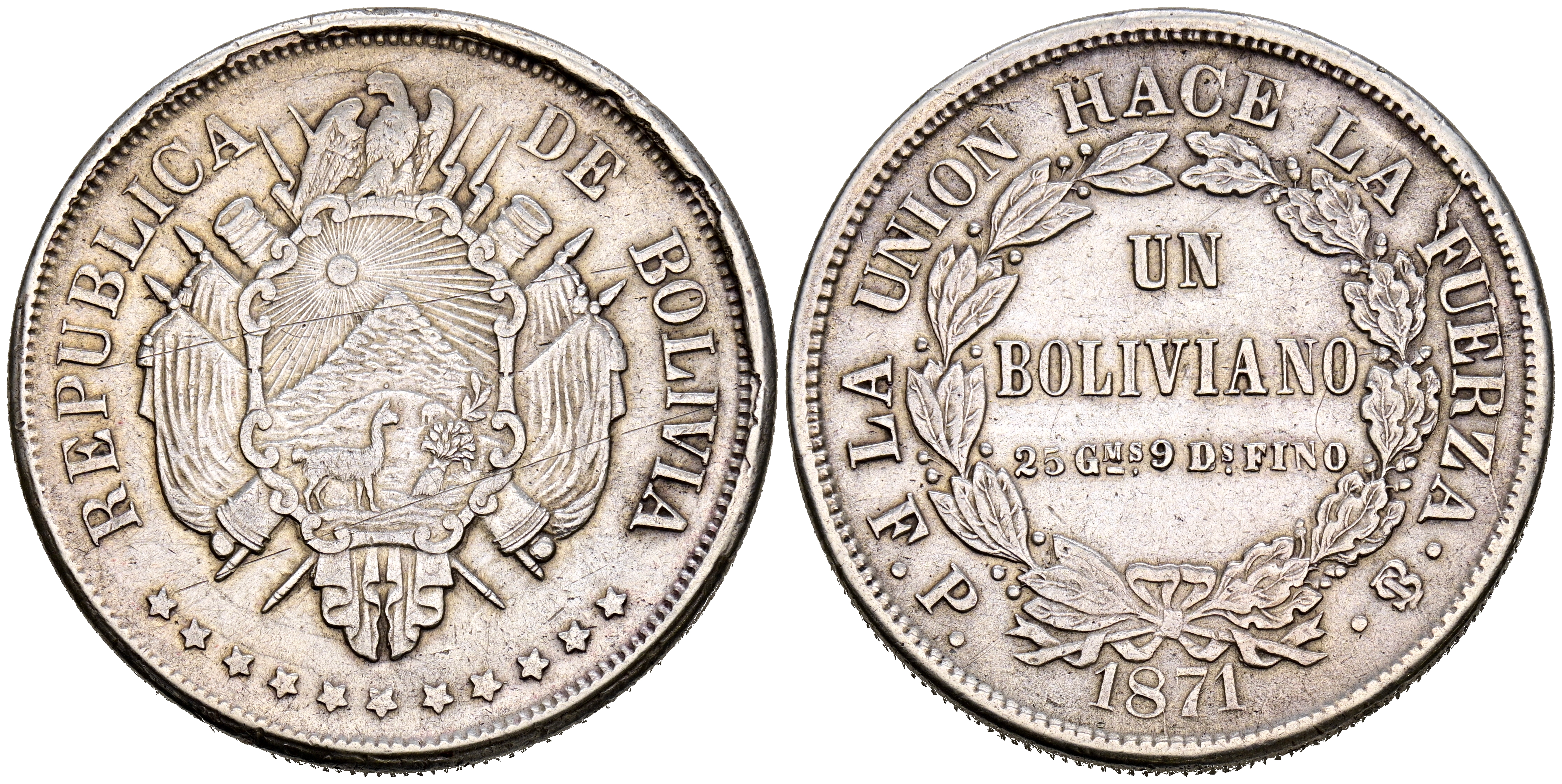 BOLIVIA. 1 Boliviano. (Ar. 24,84g/36mm). 1871. Potosí FP. (Km#155.3). MBC. Rayas en anverso.