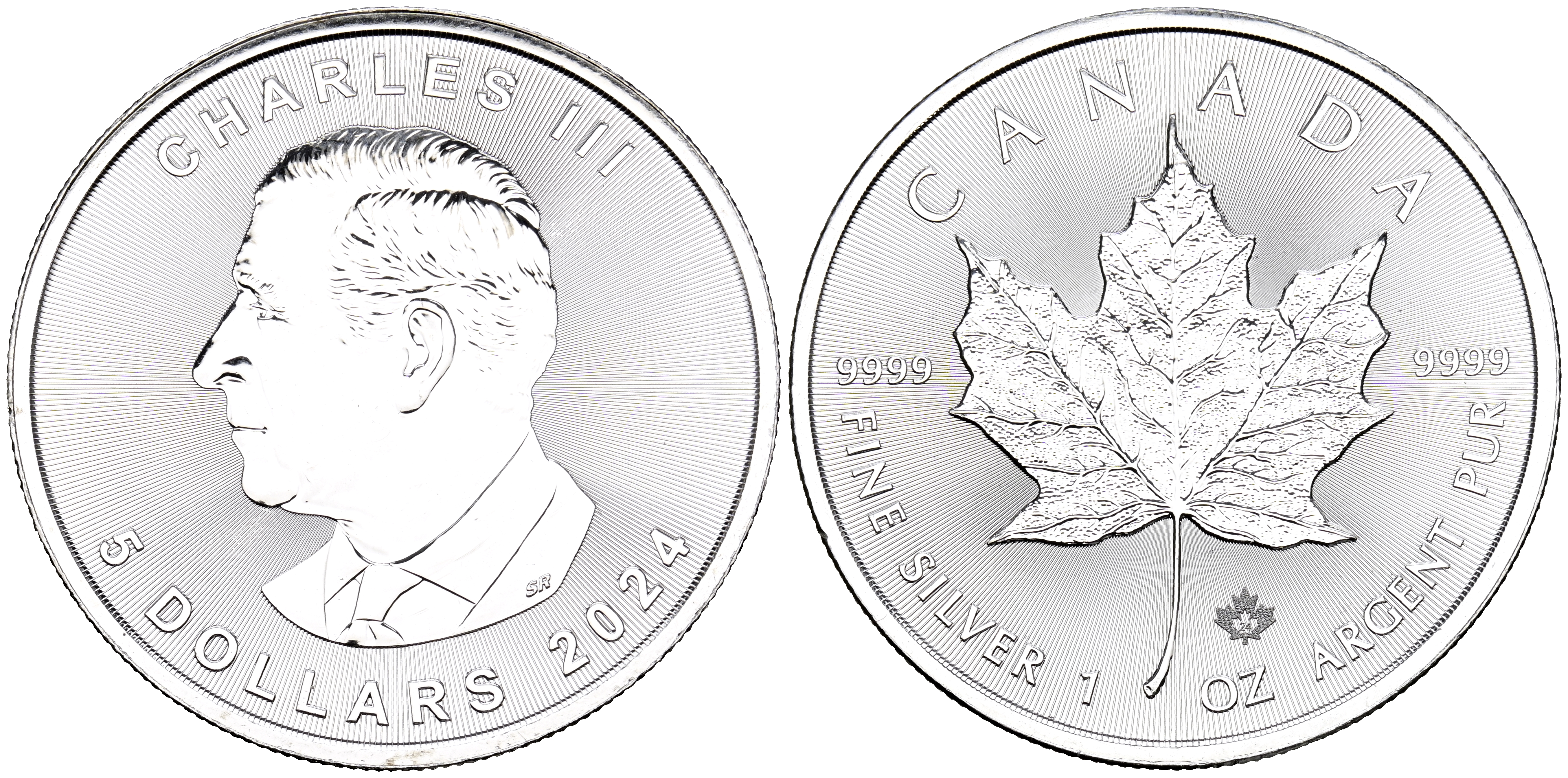 CANADÁ. 5 Dollars. (Ar. 31,12g/38mm). 2024. Hoja de arce pequeña y grande. Plata de 0,999 milésimas. SC.