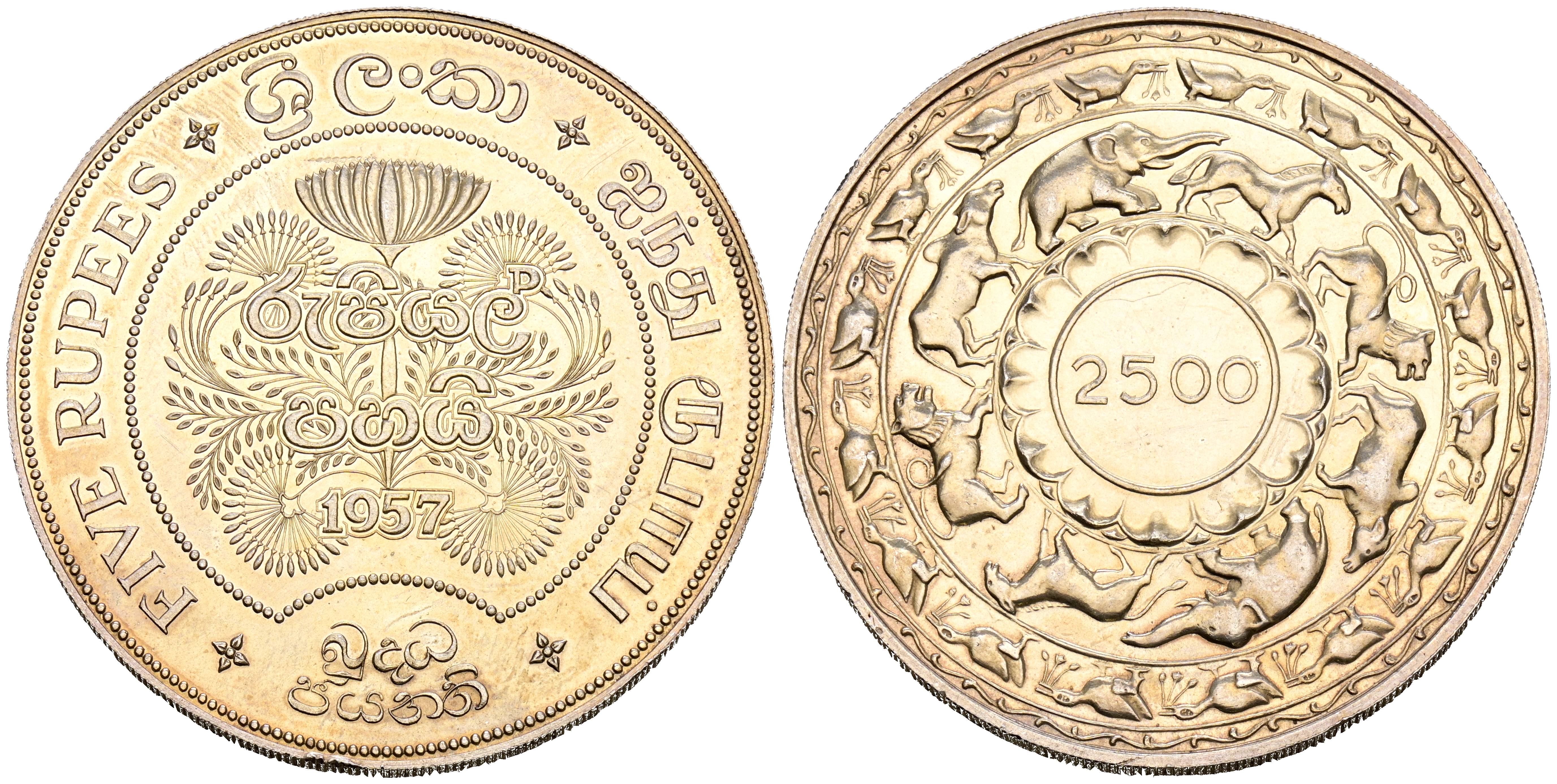 CEILÁN (Sri Lanka). 5 Rupias. (Ar. 27,62g/39mm). 1957. 2500 Aniversario de Budismo. (Km#126). EBC+.