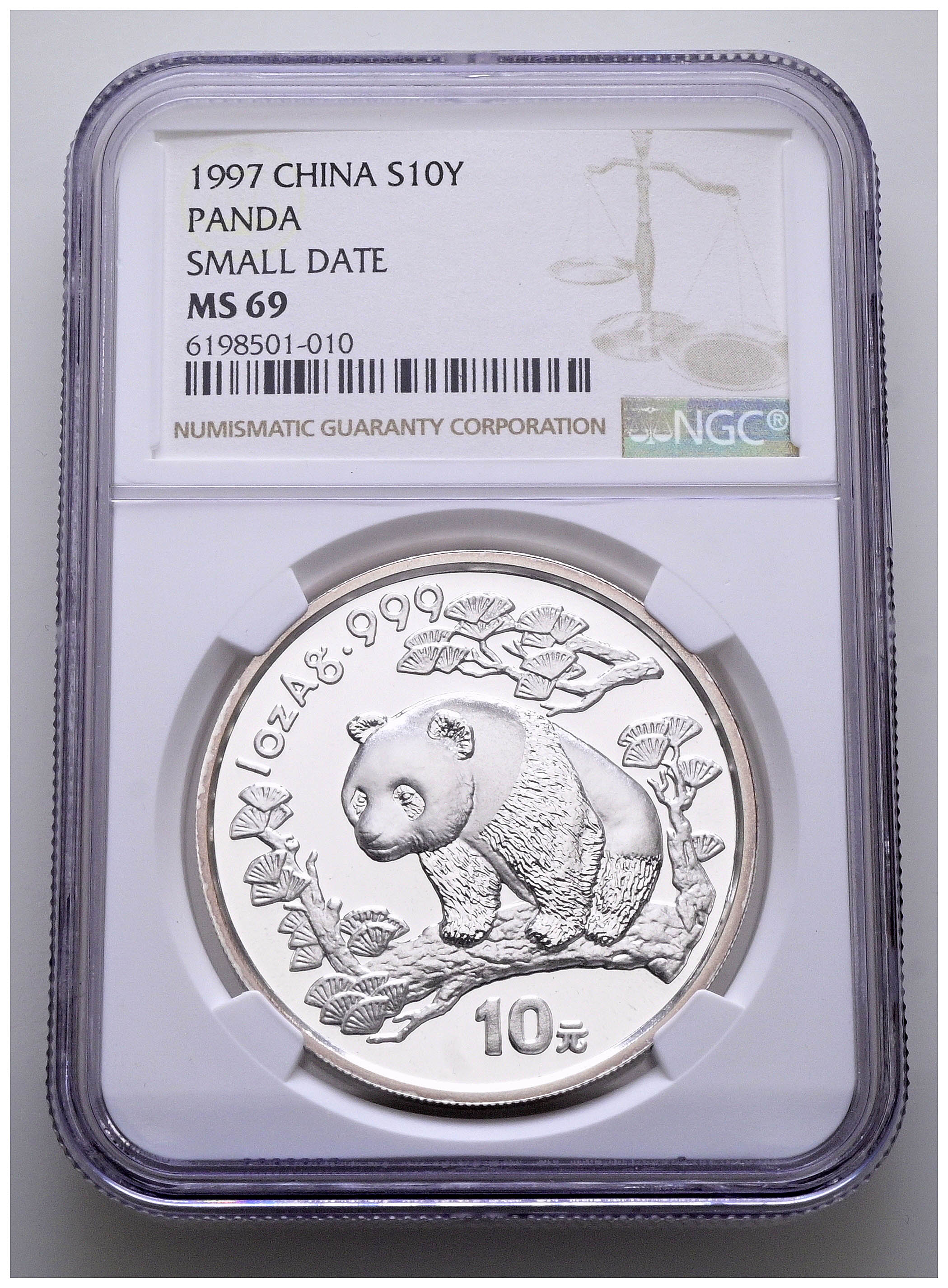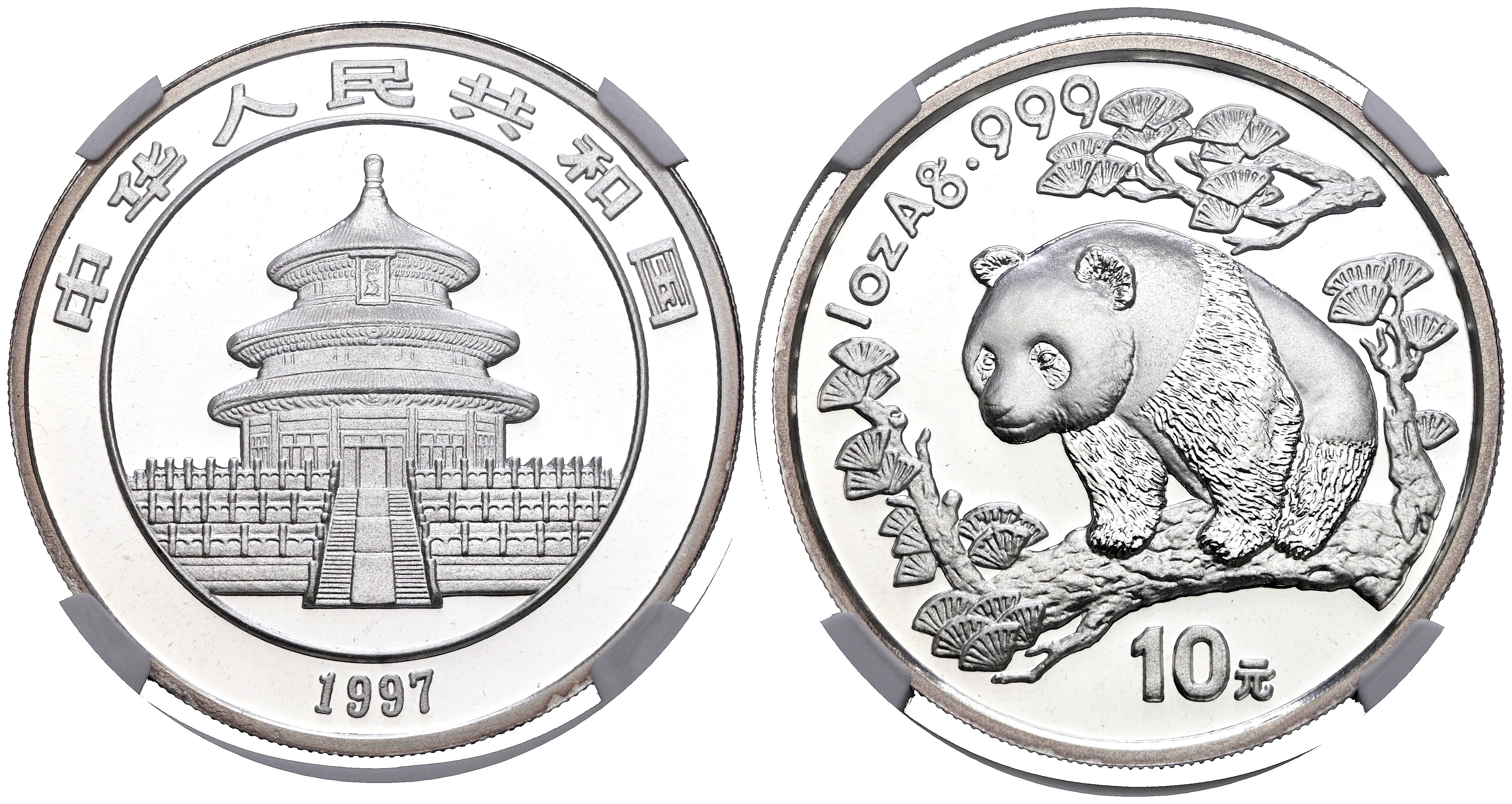 CHINA. 10 Yuan. (Ar. 31,10g/40mm)*. 1997. Serie Panda. Encapsulado por NGC MS 69, Small date. *Peso y medida teóricos