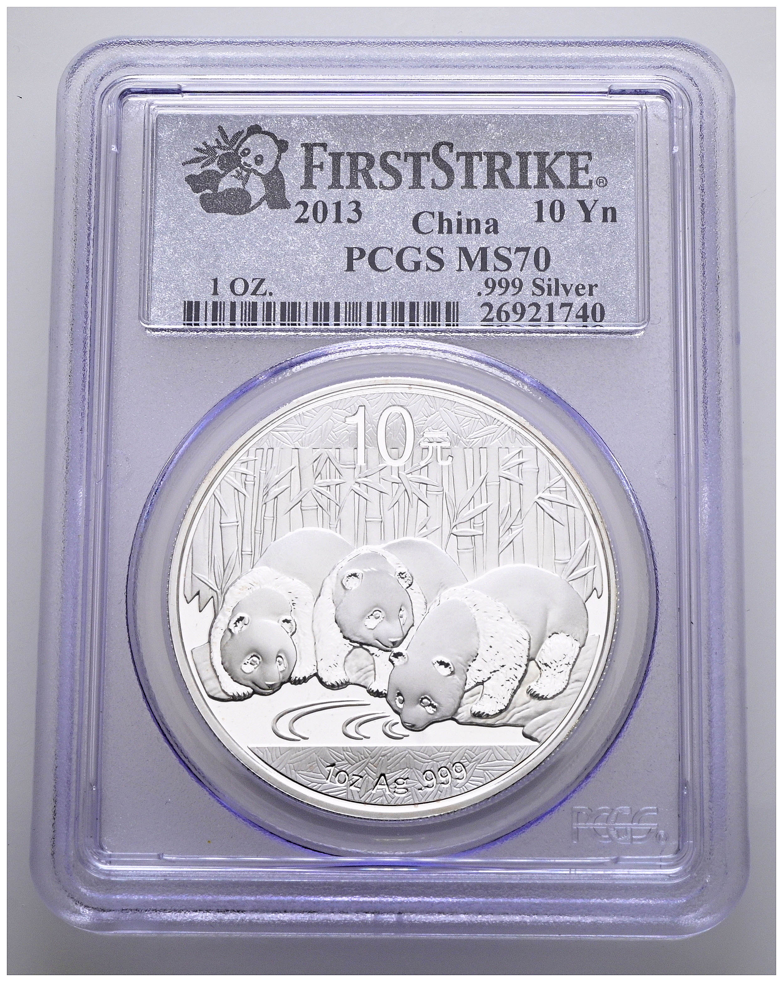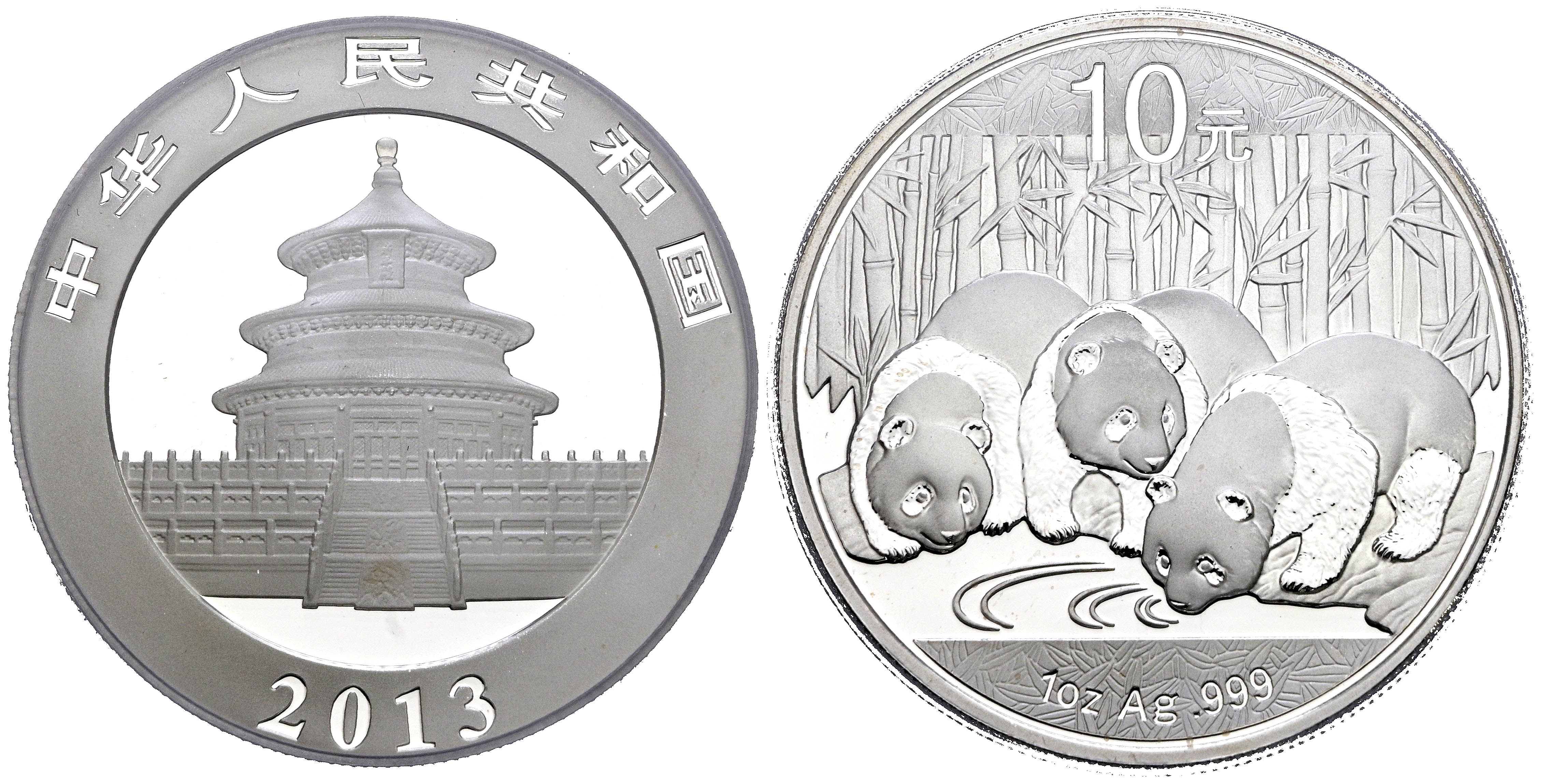 CHINA. 10 Yuan. (Ar. 30,00g/40mm)*. 2013. Serie Panda. First Strike. Encapsulado por PCGS MS 70. *Peso y medidas teóricos.