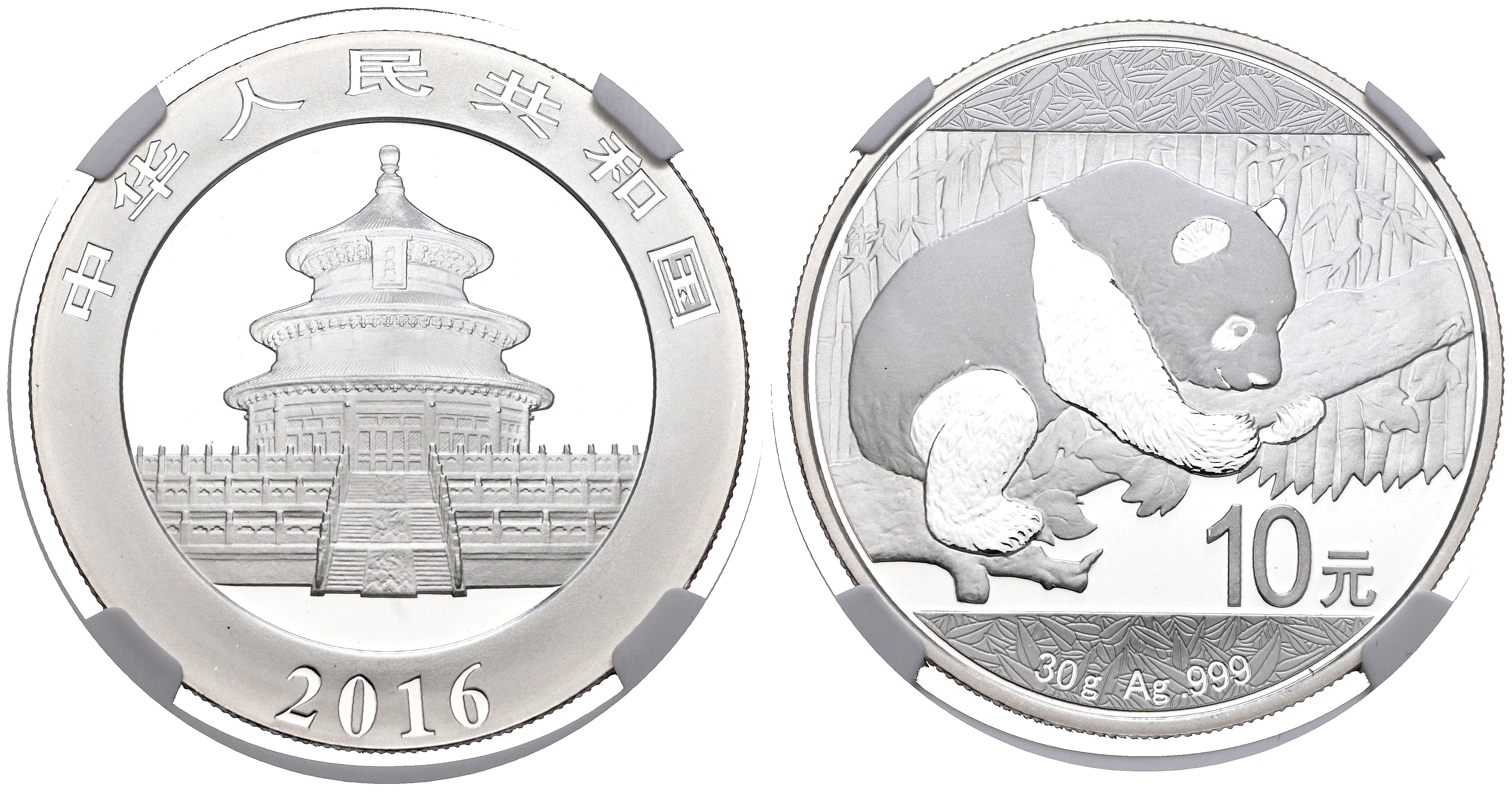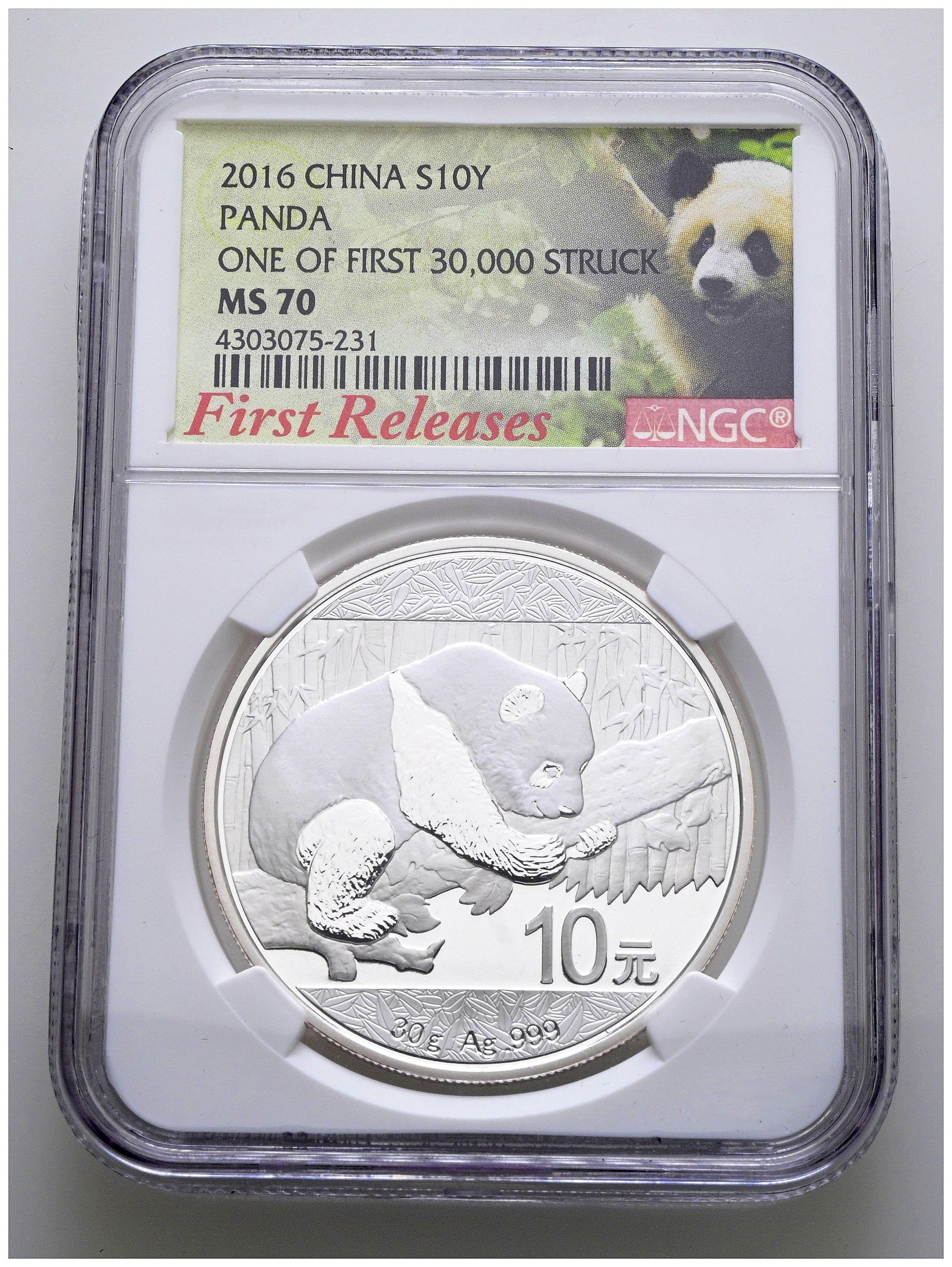 CHINA. 10 Yuan. (Ar. 30,00g/40mm)*. 2016. Serie Panda. First Releases. Encapsulado por NGC MS 70. *Peso y medidas teóricos.