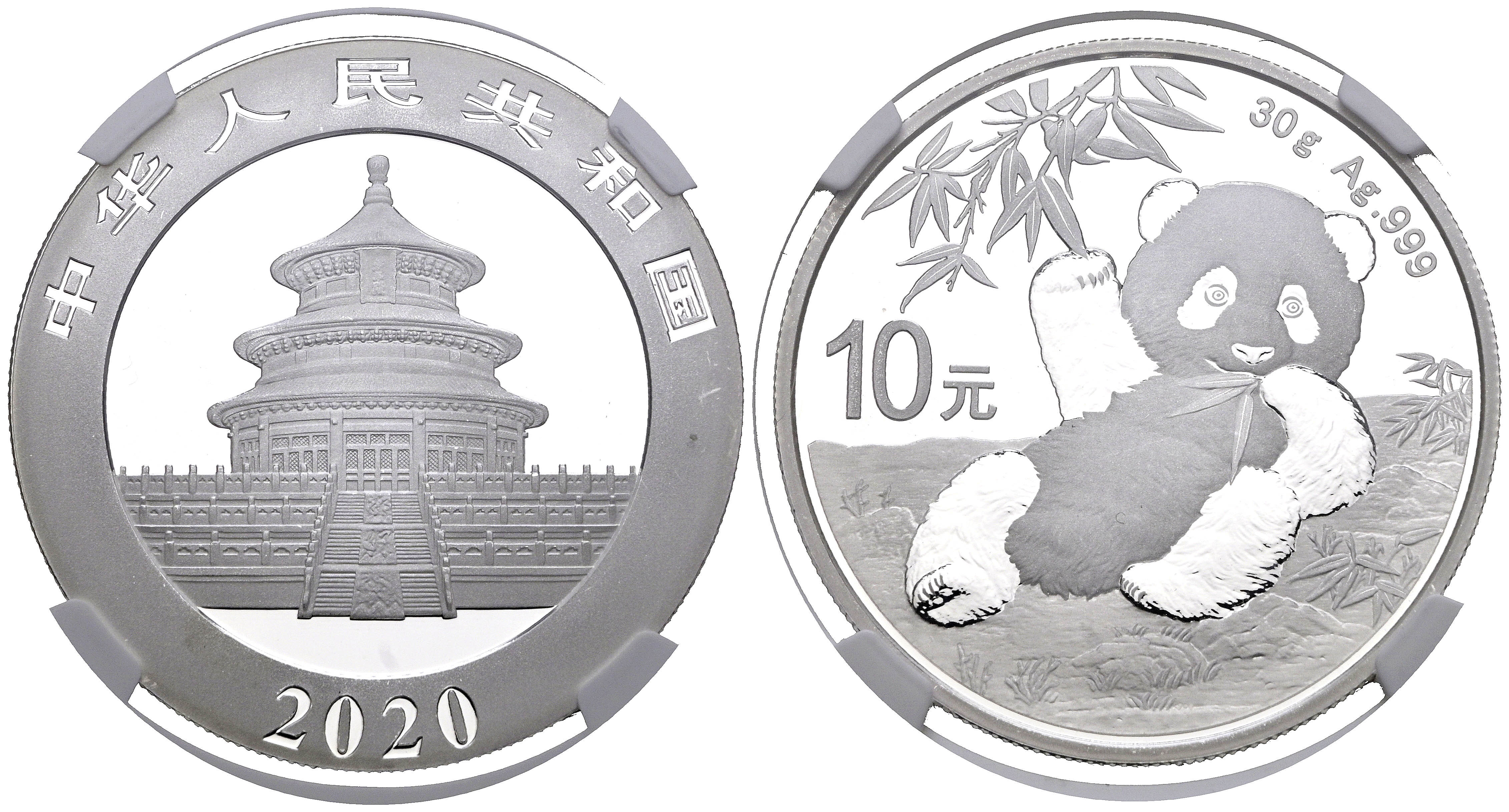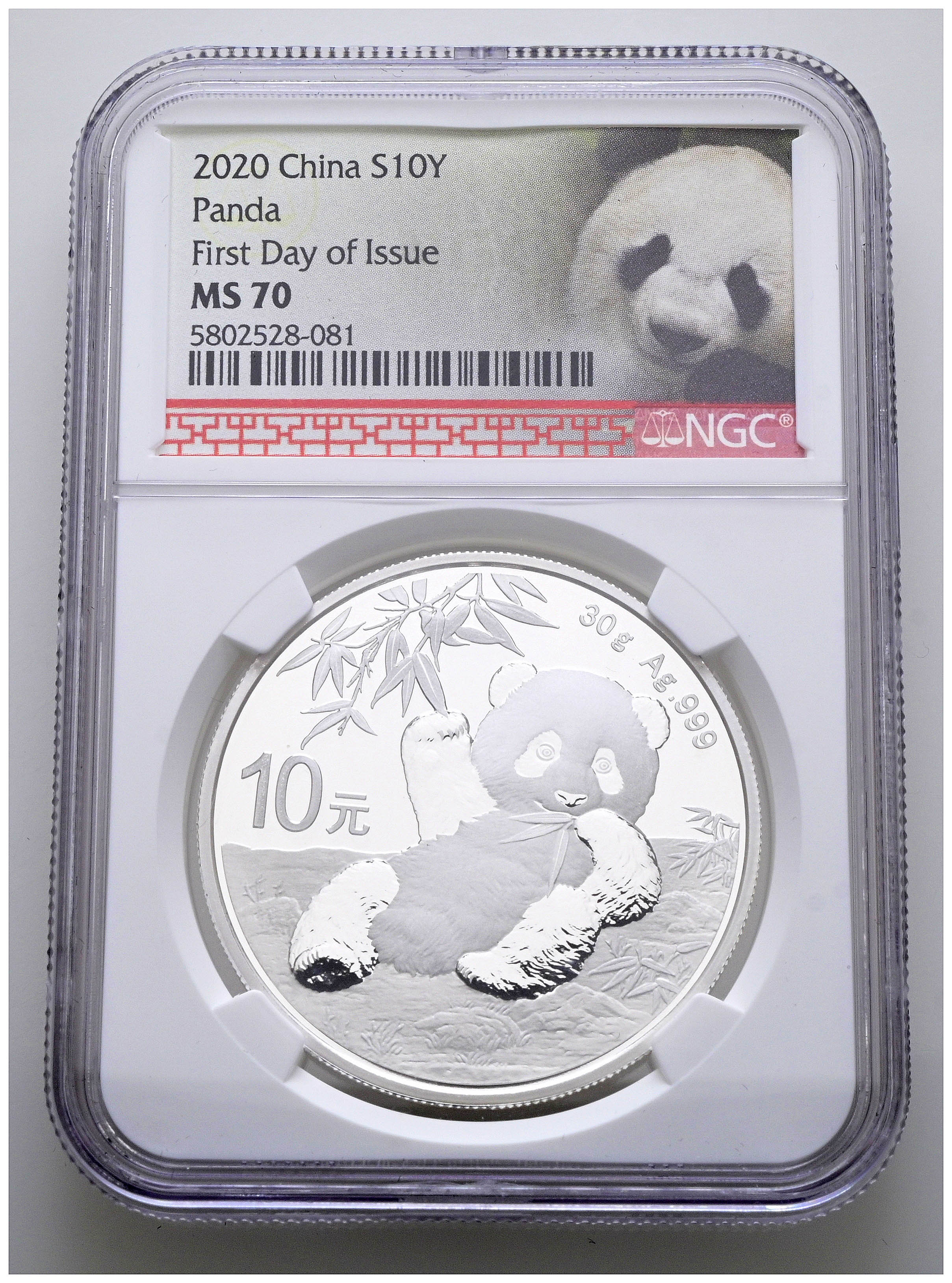 CHINA. 10 Yuan. (Ar. 30,00g/40mm)*. 2020. Serie Panda. First Day of Issue. Encapsulado por NGC MS 70. *Peso y medidas teóricos.