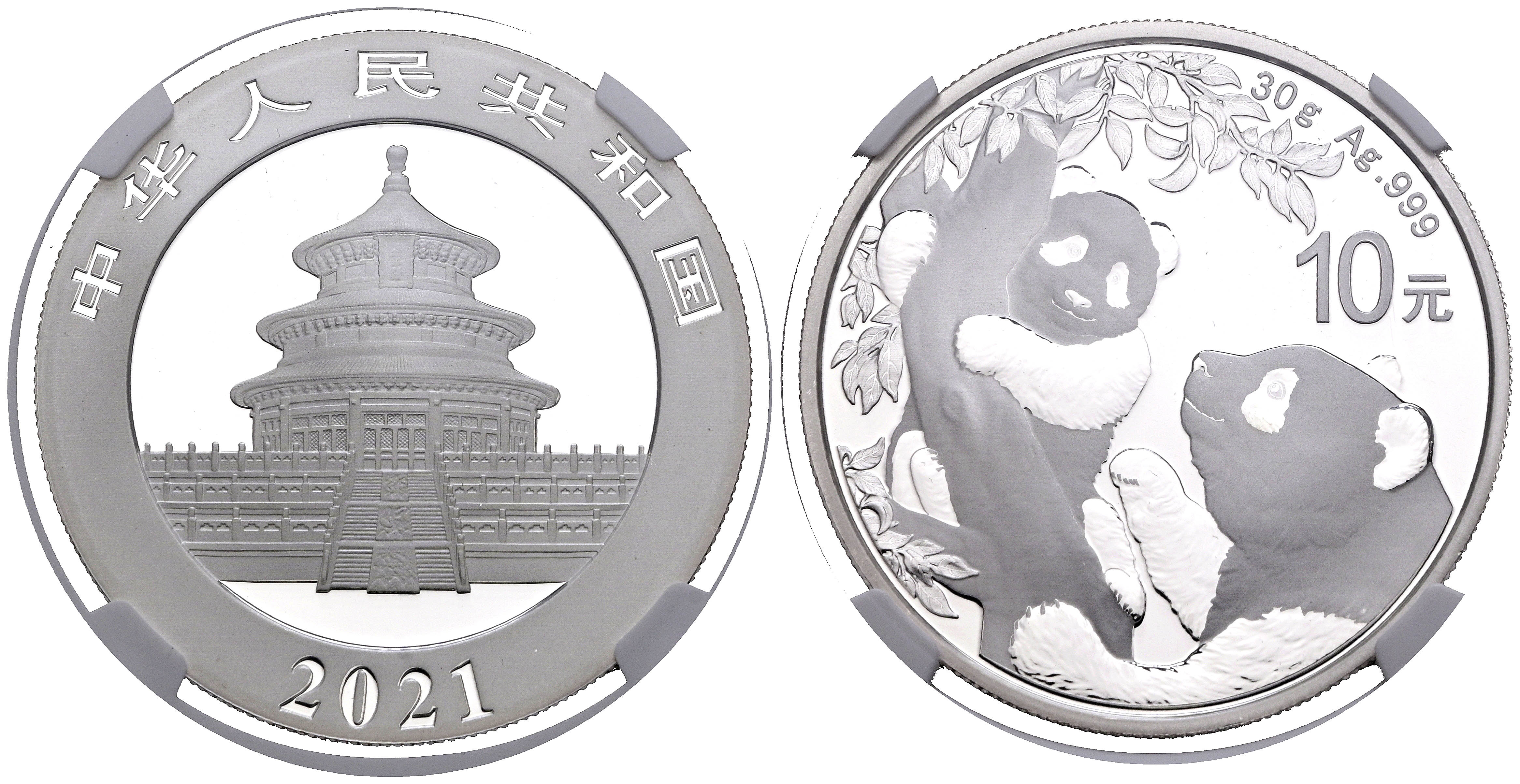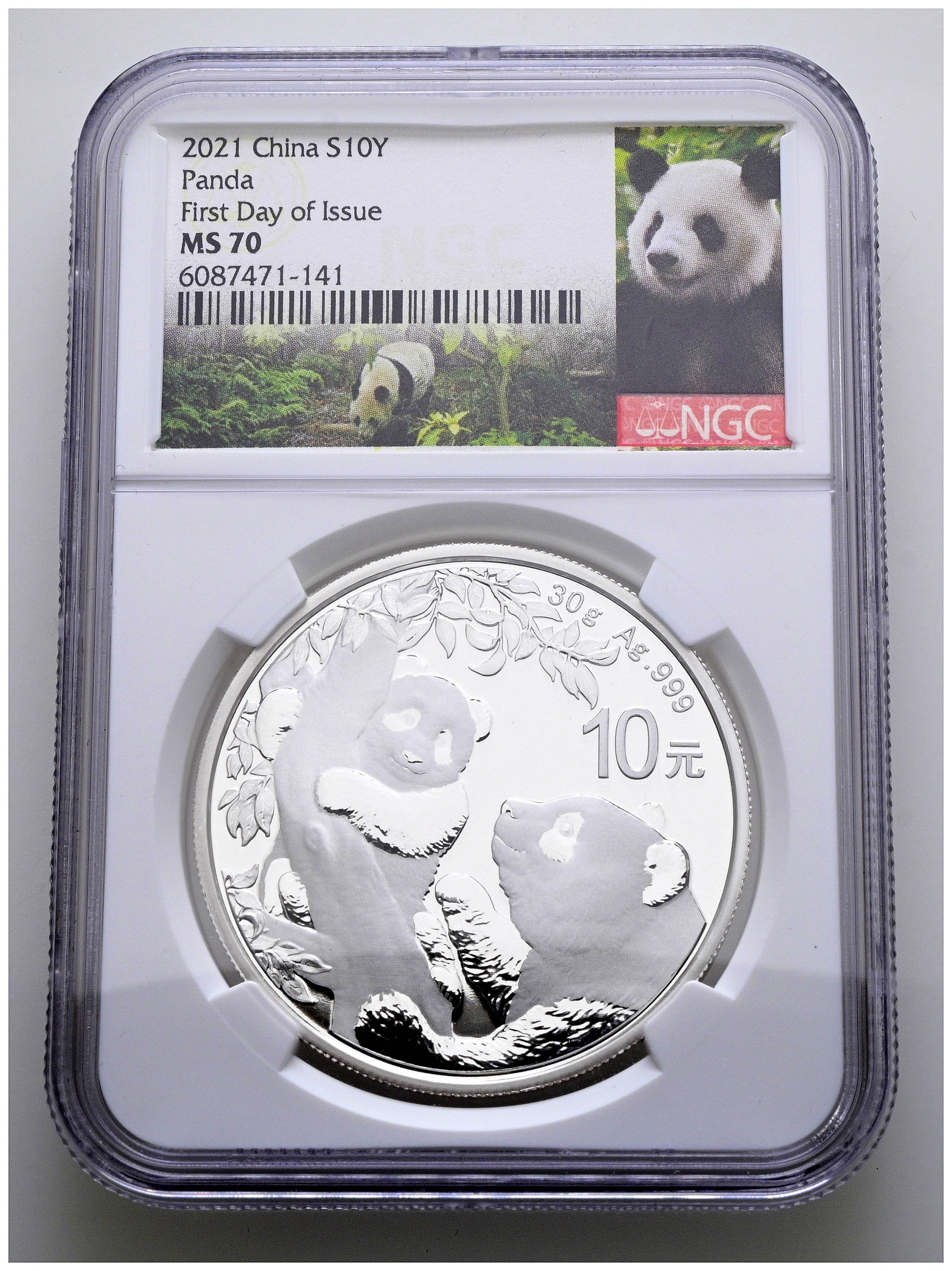 CHINA. 10 Yuan. (Ar. 30,00g/40mm)*. 2021. Serie Panda. First Day of Issue. Encapsulado por NGC MS 70. *Peso y medidas teóricos.