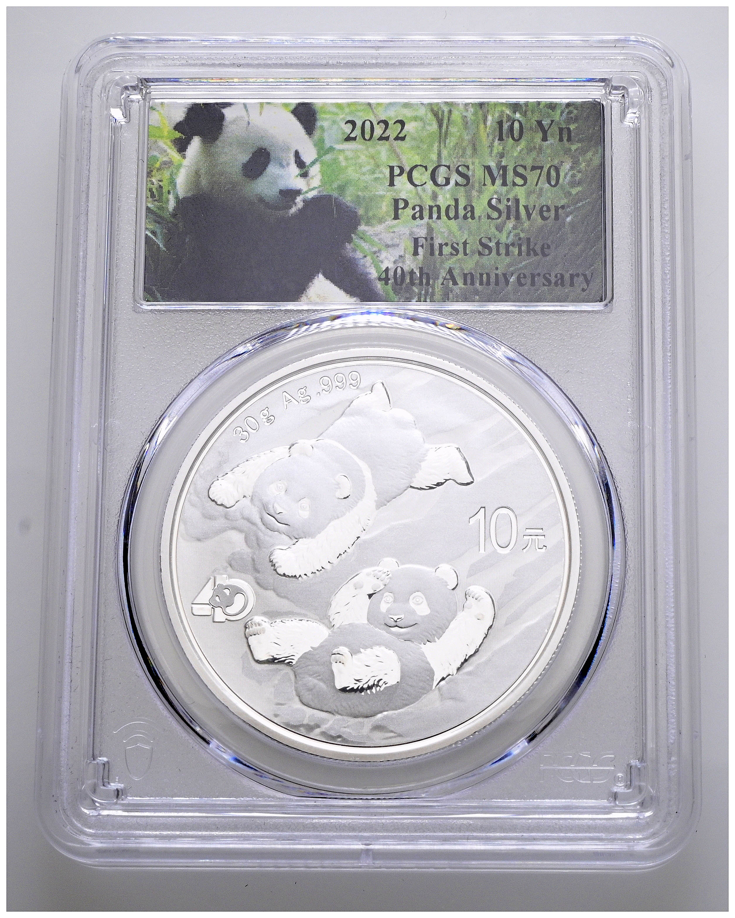 CHINA. 10 Yuan. (Ar. 30,00g/40mm)*. 2022. Serie Panda. First Strike-40 Anniversary. Encapsulado por PCGS MS 70. *Peso y medidas teóricos.