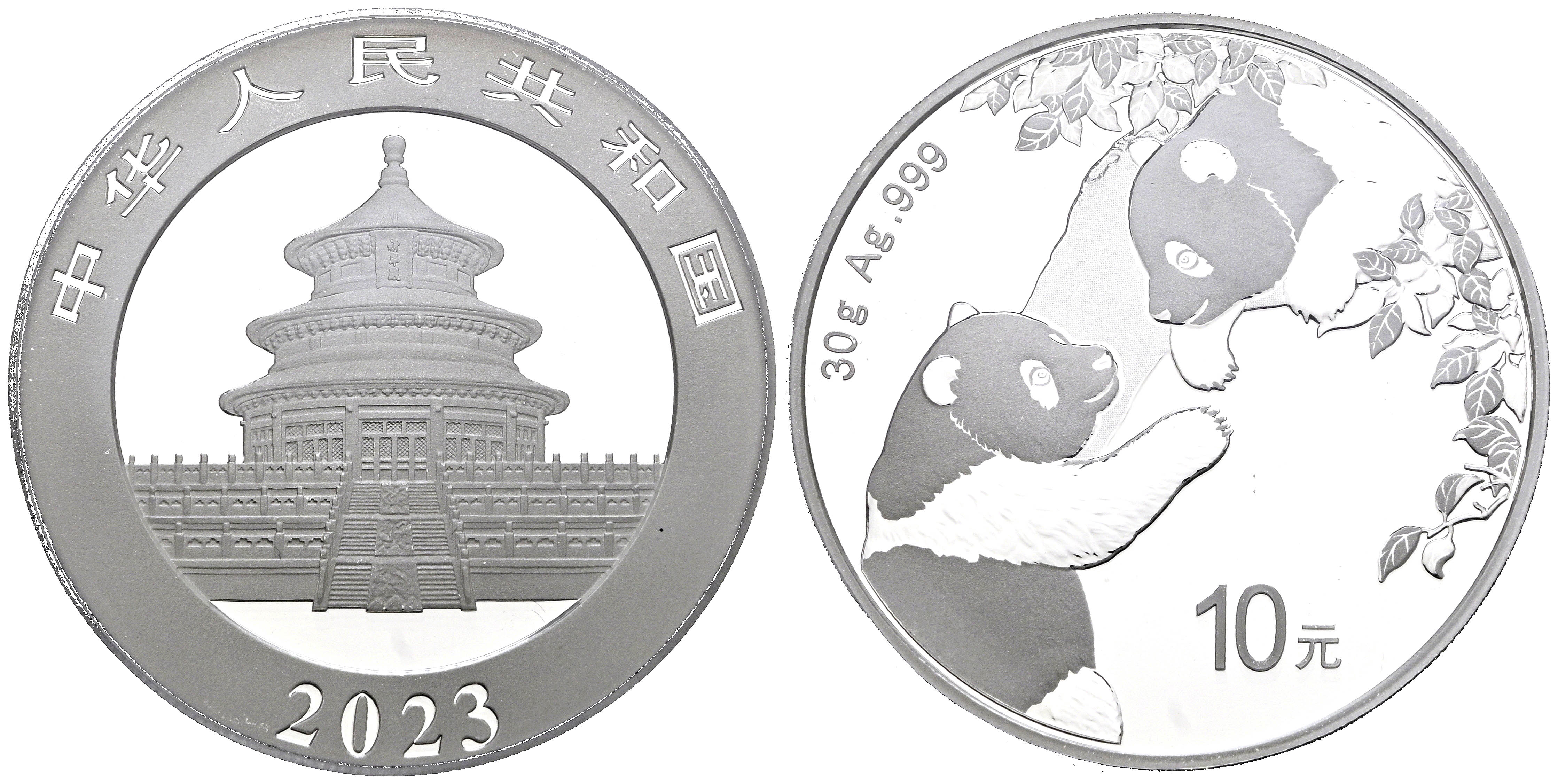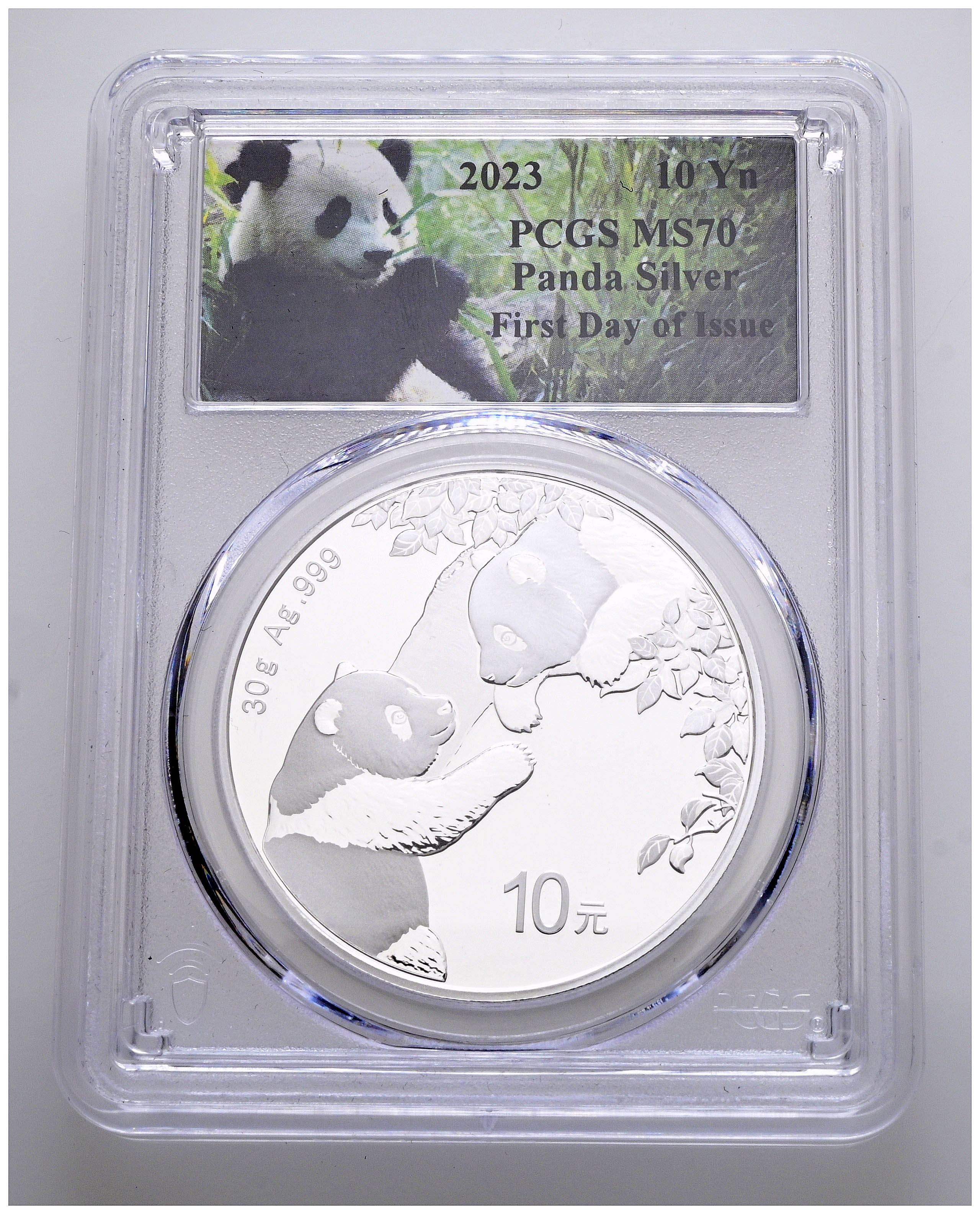 CHINA. 10 Yuan. (Ar. 30,00g/40mm)*. 2023. Serie Panda. First Strike. Encapsulado por PCGS MS 70. *Peso y medidas teóricos.