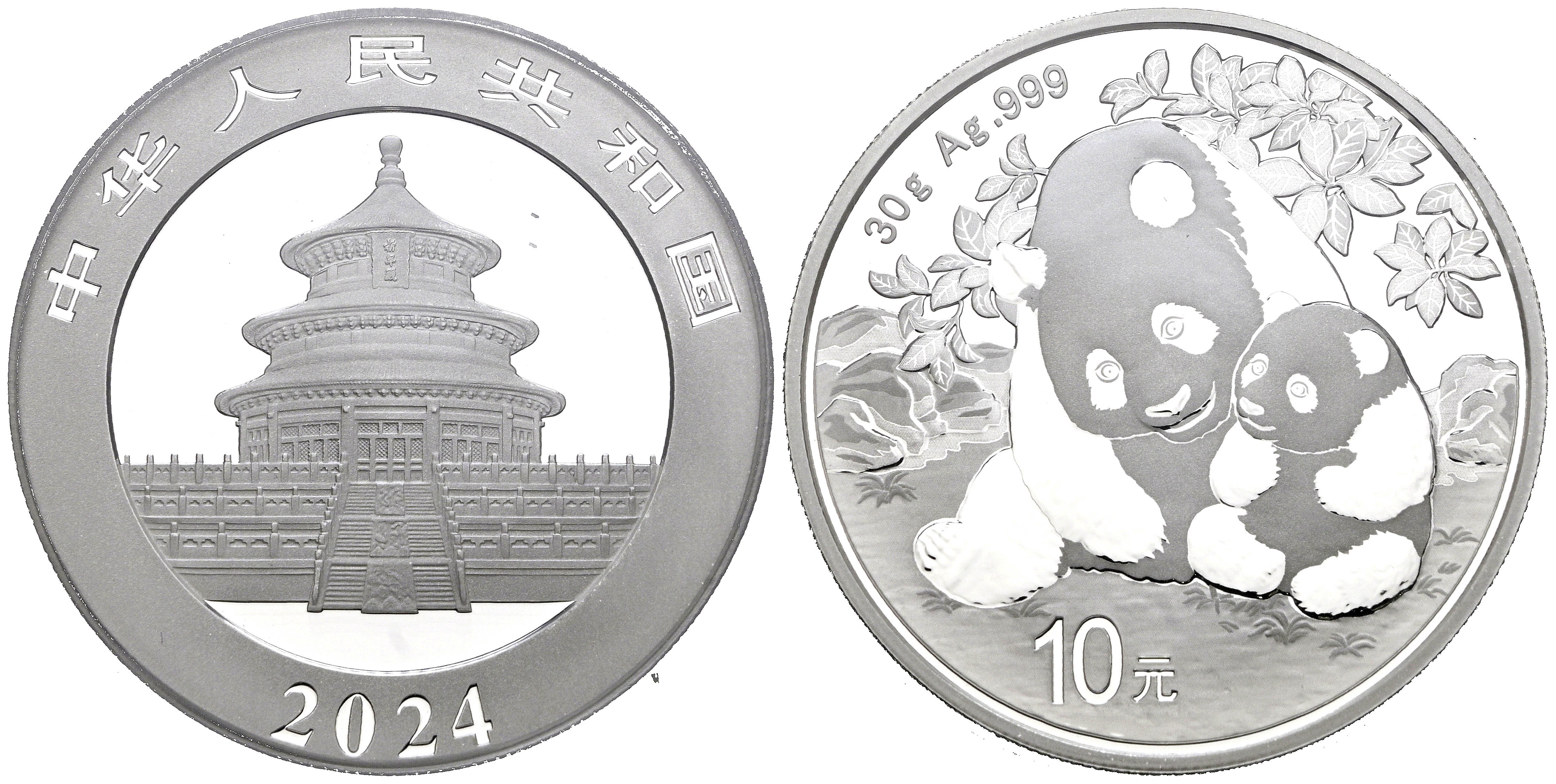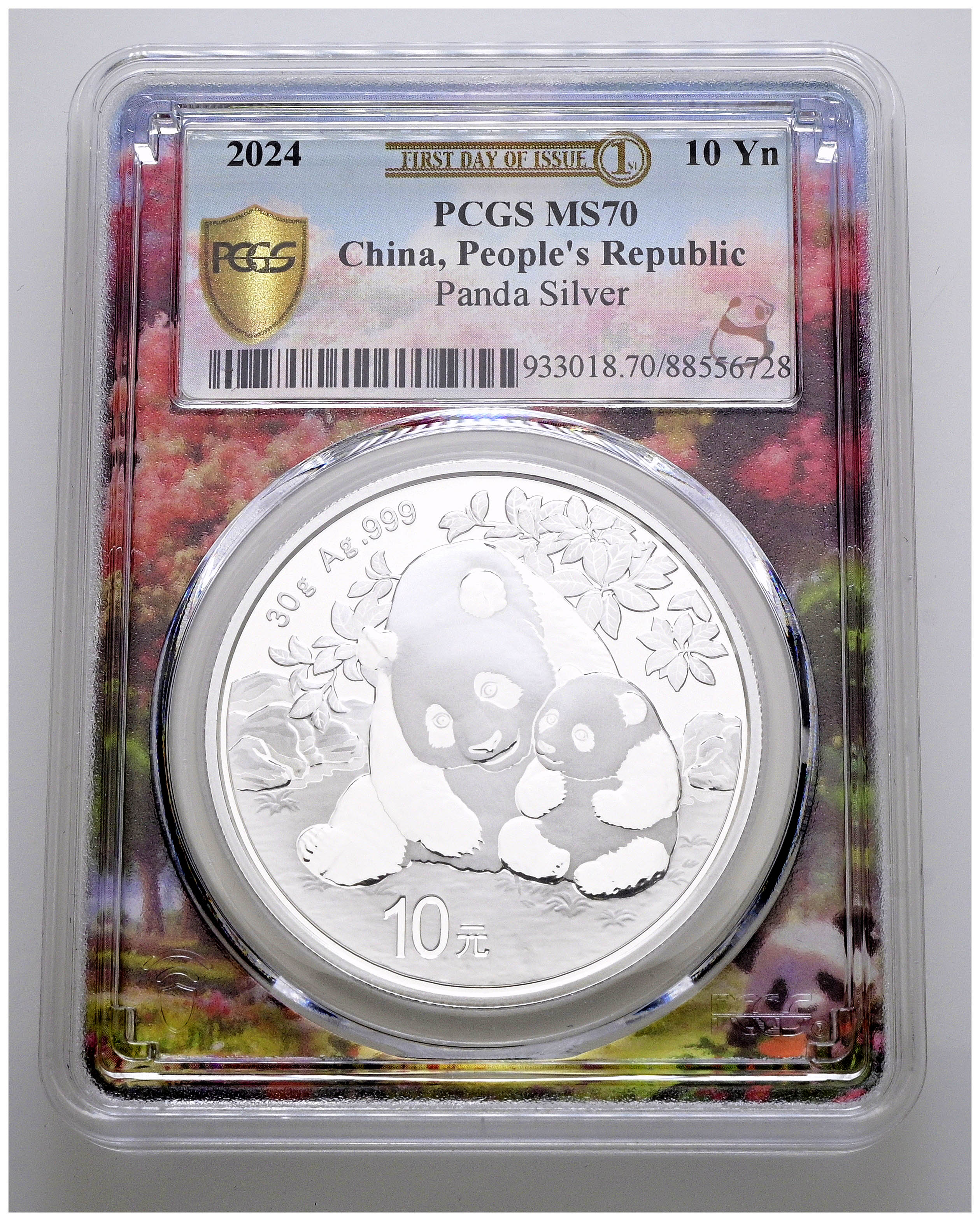 CHINA. 10 Yuan. (Ar. 30,00g/40mm)*. 2024. Serie Panda. First Day of Issue. Encapsulado por PCGS. MS 70. *Peso y medidas teóricos.
