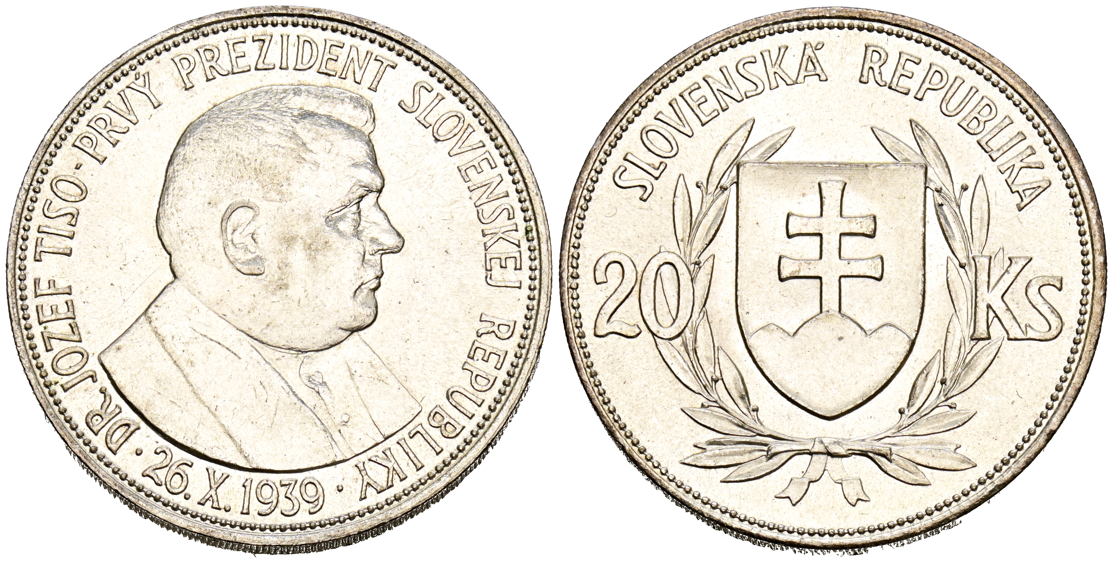 ESLOVAQUIA, Jozef Tiso. 20 Korun. (Ar. 15,02g/31mm). 1939. (Km#3). EBC+.