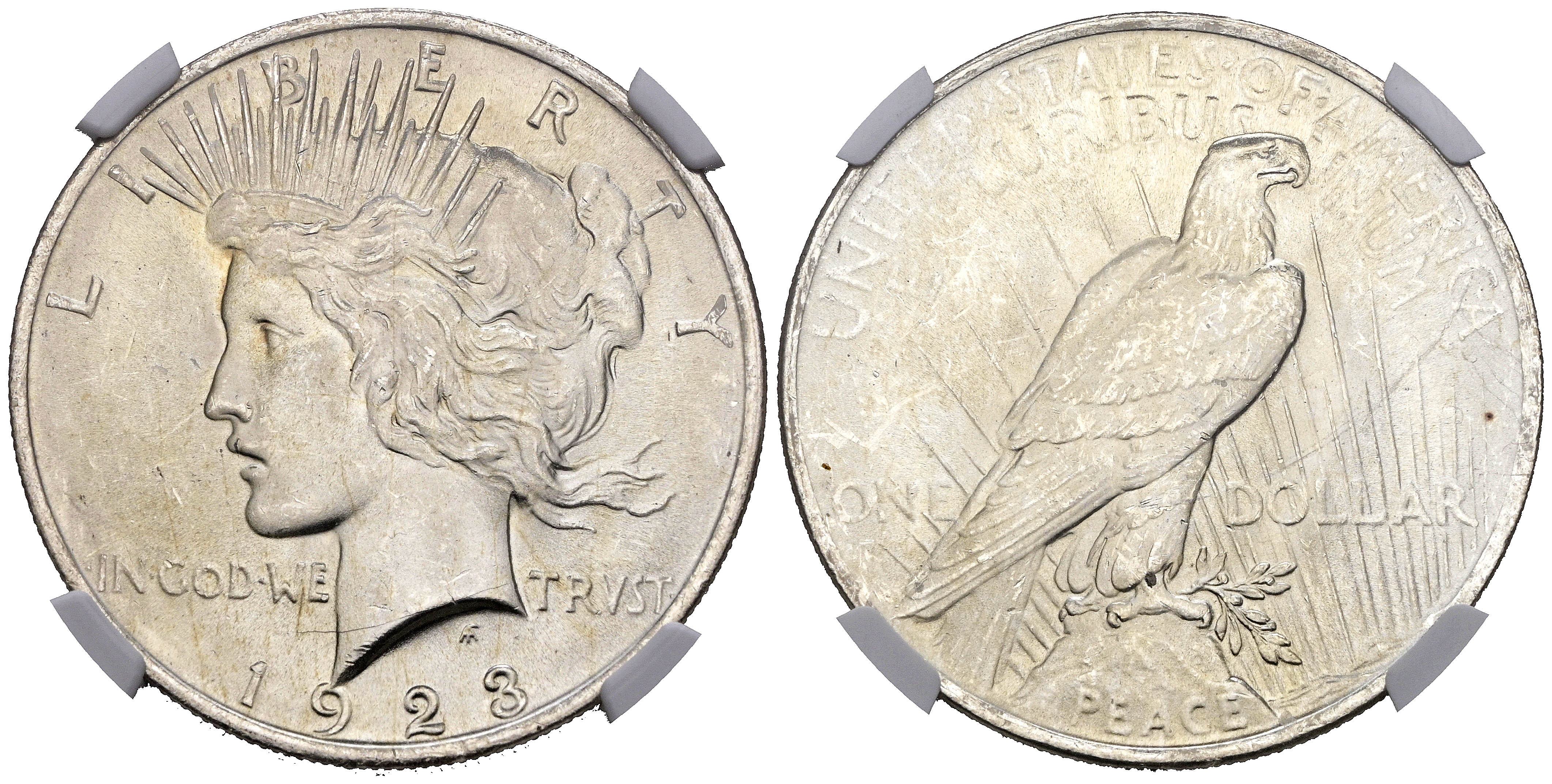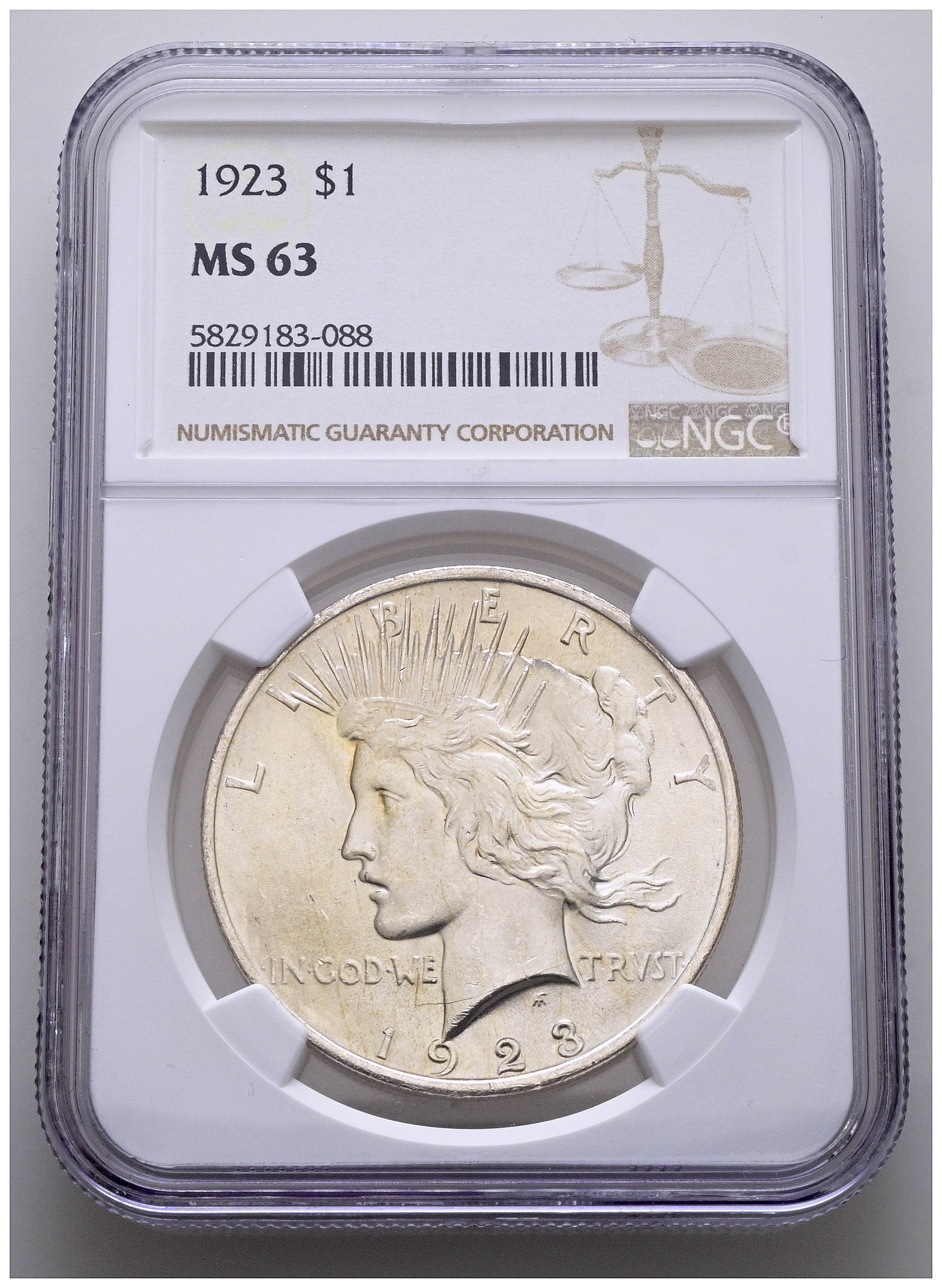 ESTADOS UNIDOS. 1 Dollar. (Ar. 27,00g/38mm)*. 1923. Philadelphia. (Km#150). Encapsulado por NGC MS 63. *Peso y medidas teóricos.