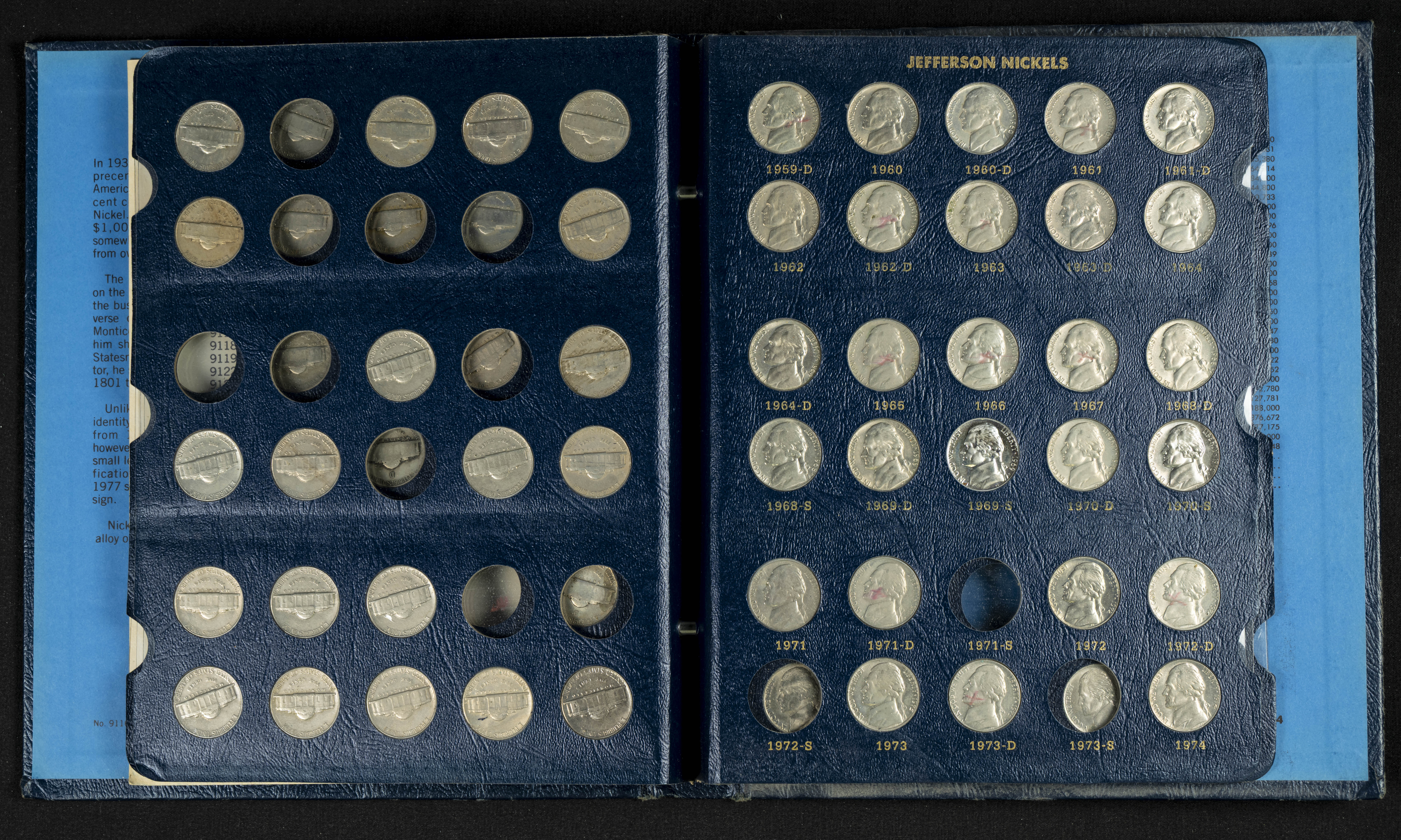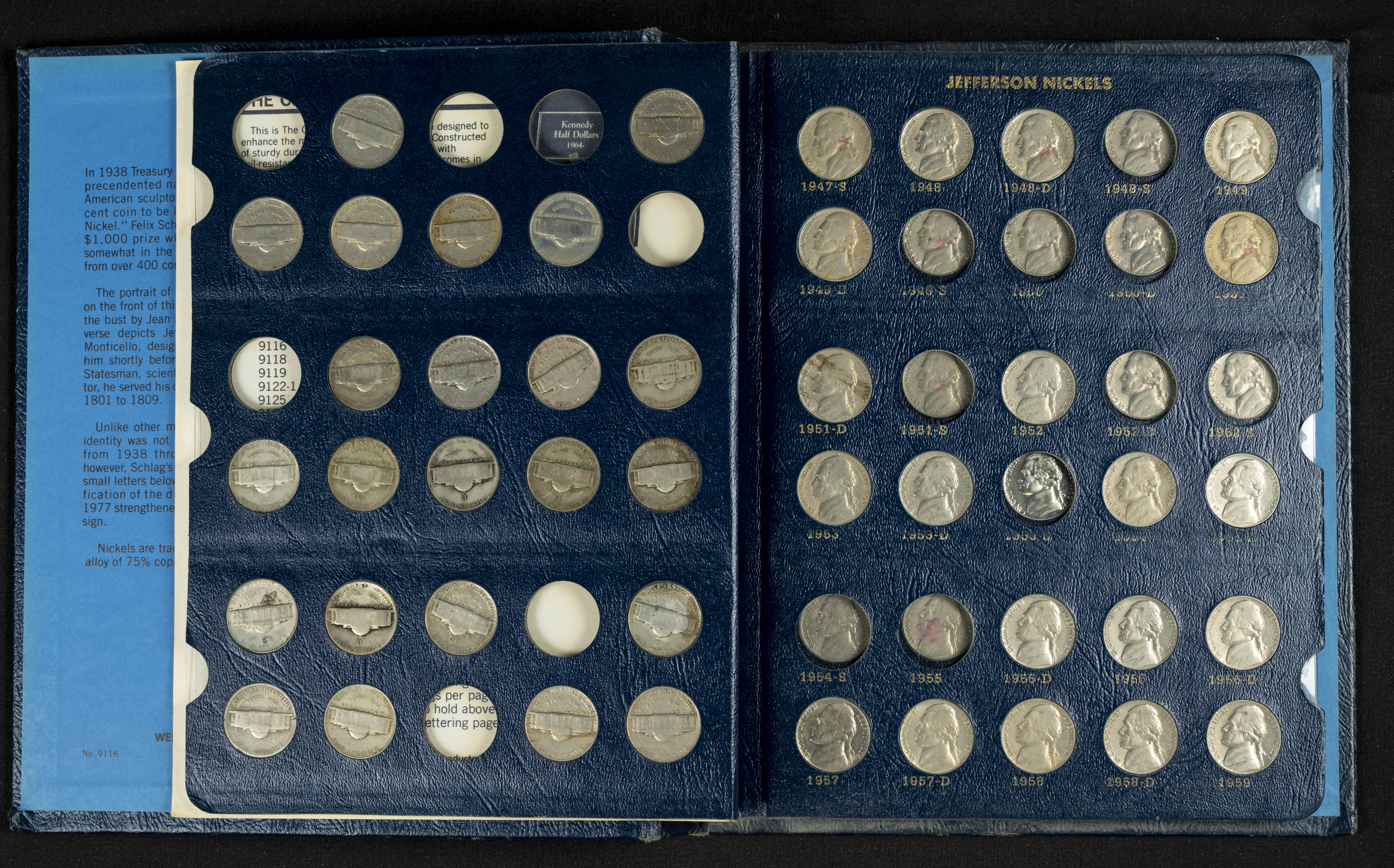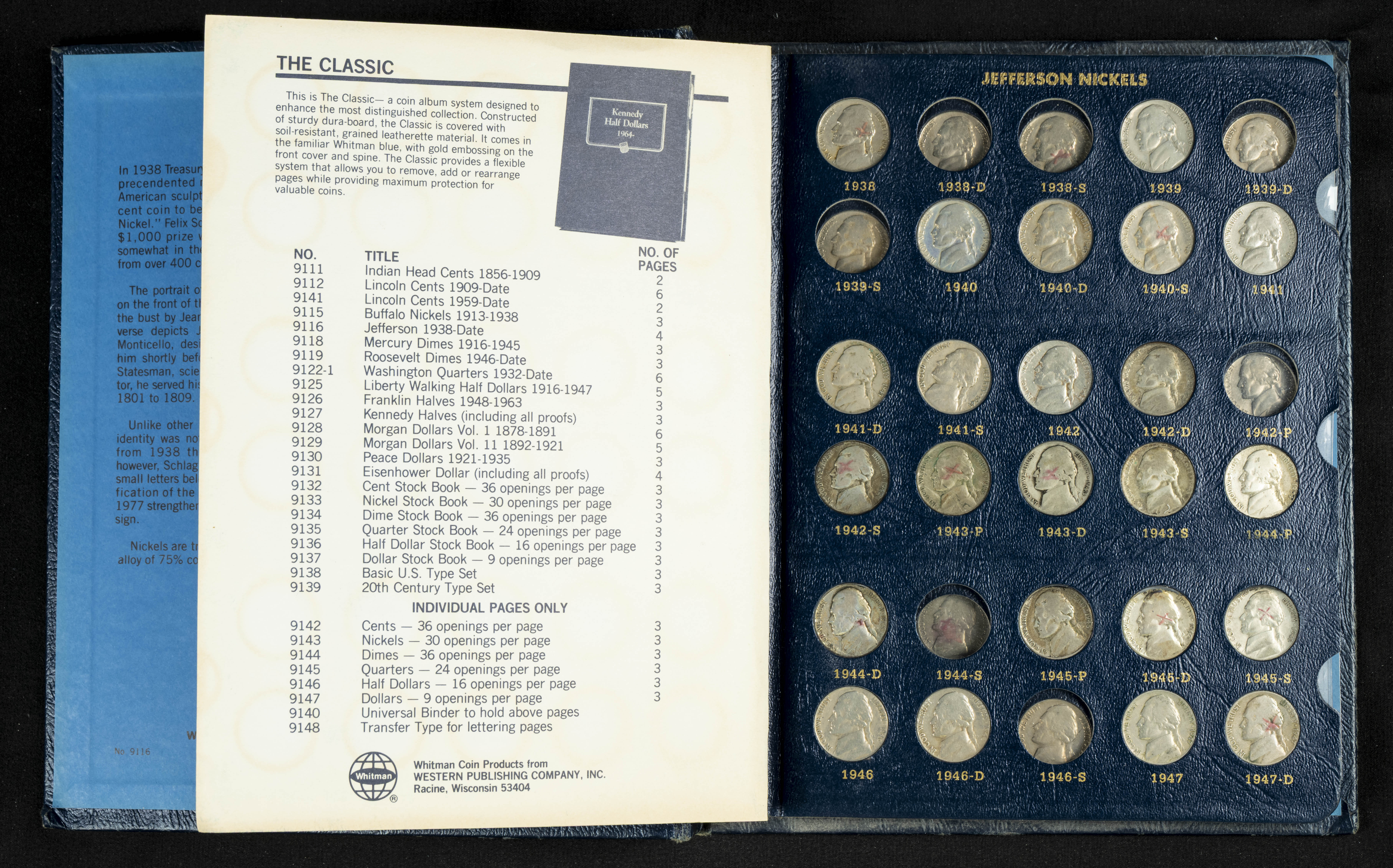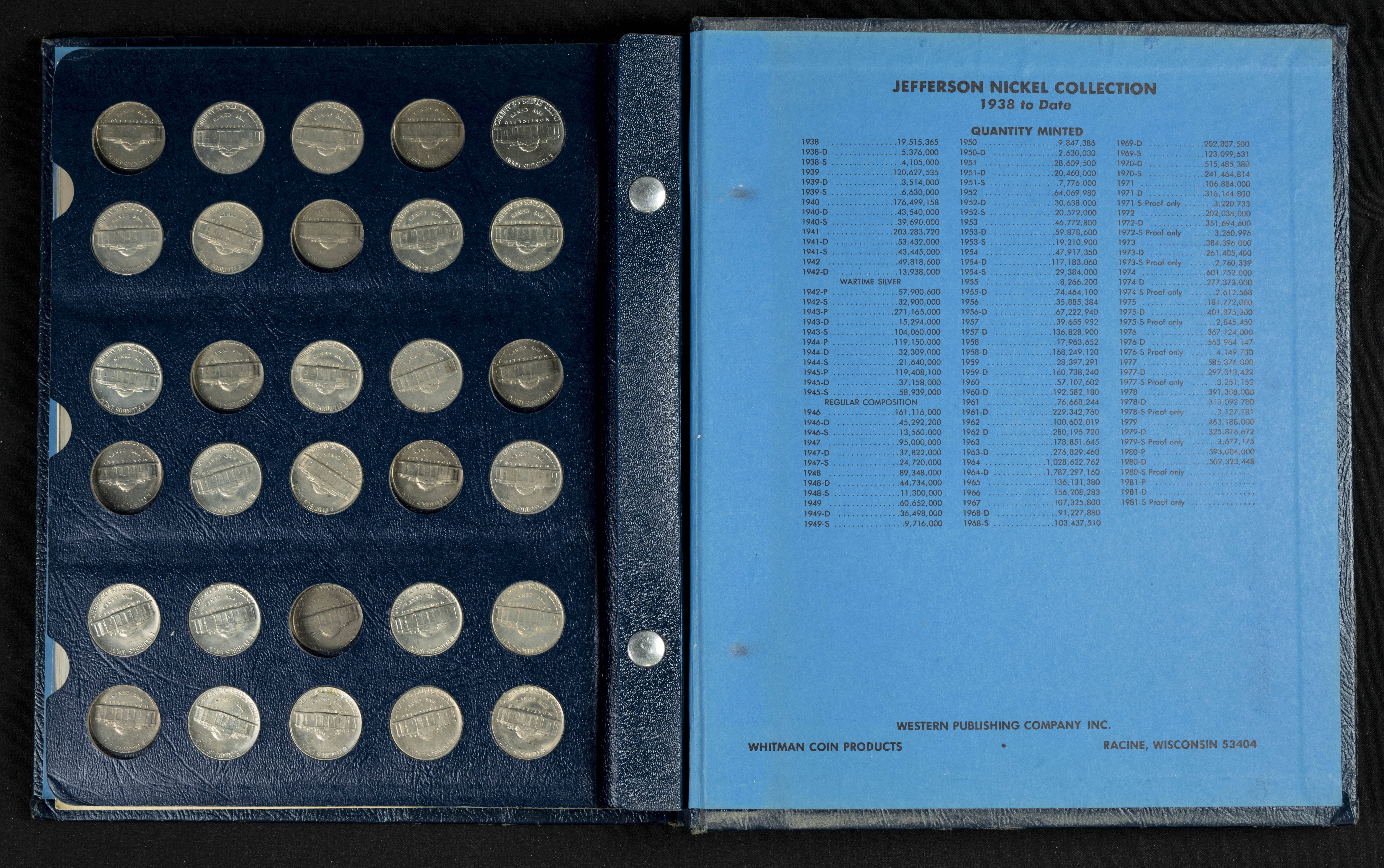 ESTADOS UNIDOS. Jefferson Nickel Collection. Álbum Whitman (no completo) con alrededor de 90 piezas de 5 Cents acuñados entre 1938 y 1981. Diferentes estados de conservación. A EXAMINAR.