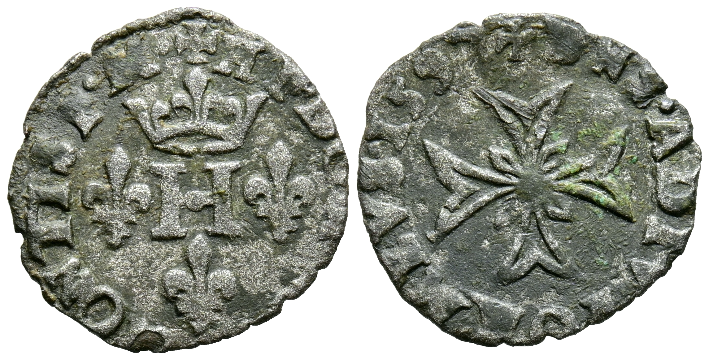 FRANCIA, Henrique II de Montpensier (1592-1608). Liard. (Ve. 0,69g/16mm). 1597. Dombes. (Bd. 1072; Divo 109). Anv: H coronado, rodeada por lirios, alrededor leyenda: H P DOMBAR D MONTISP M. Rev: Cruz cuartelada, alrededor leyenda: DNS ADIVT Y REDEM MEVS. MBC-.