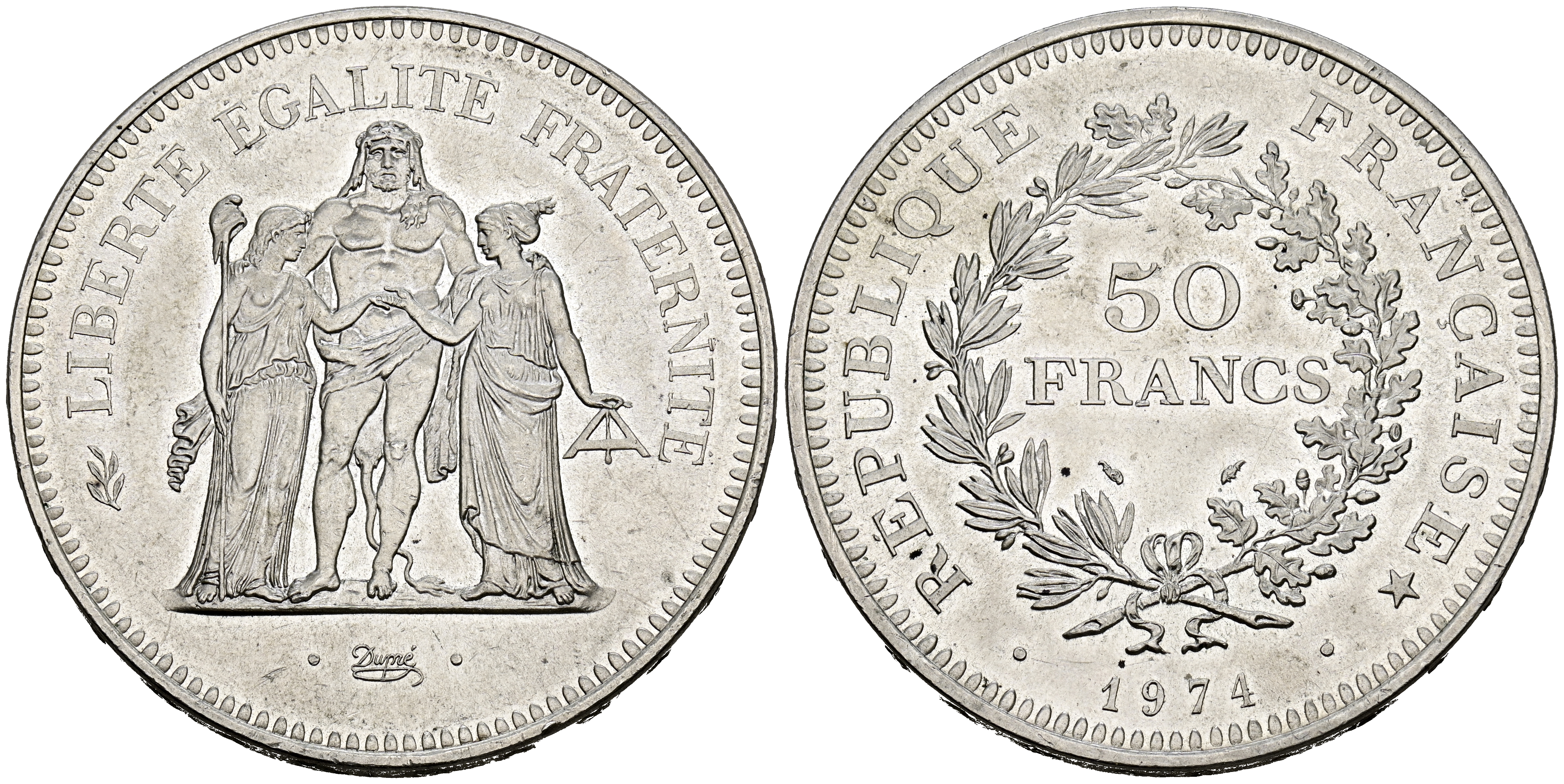 FRANCIA. 50 Francs. (Ar. 29,97g/41mm). 1974. Hércules. (Km#941). EBC-.