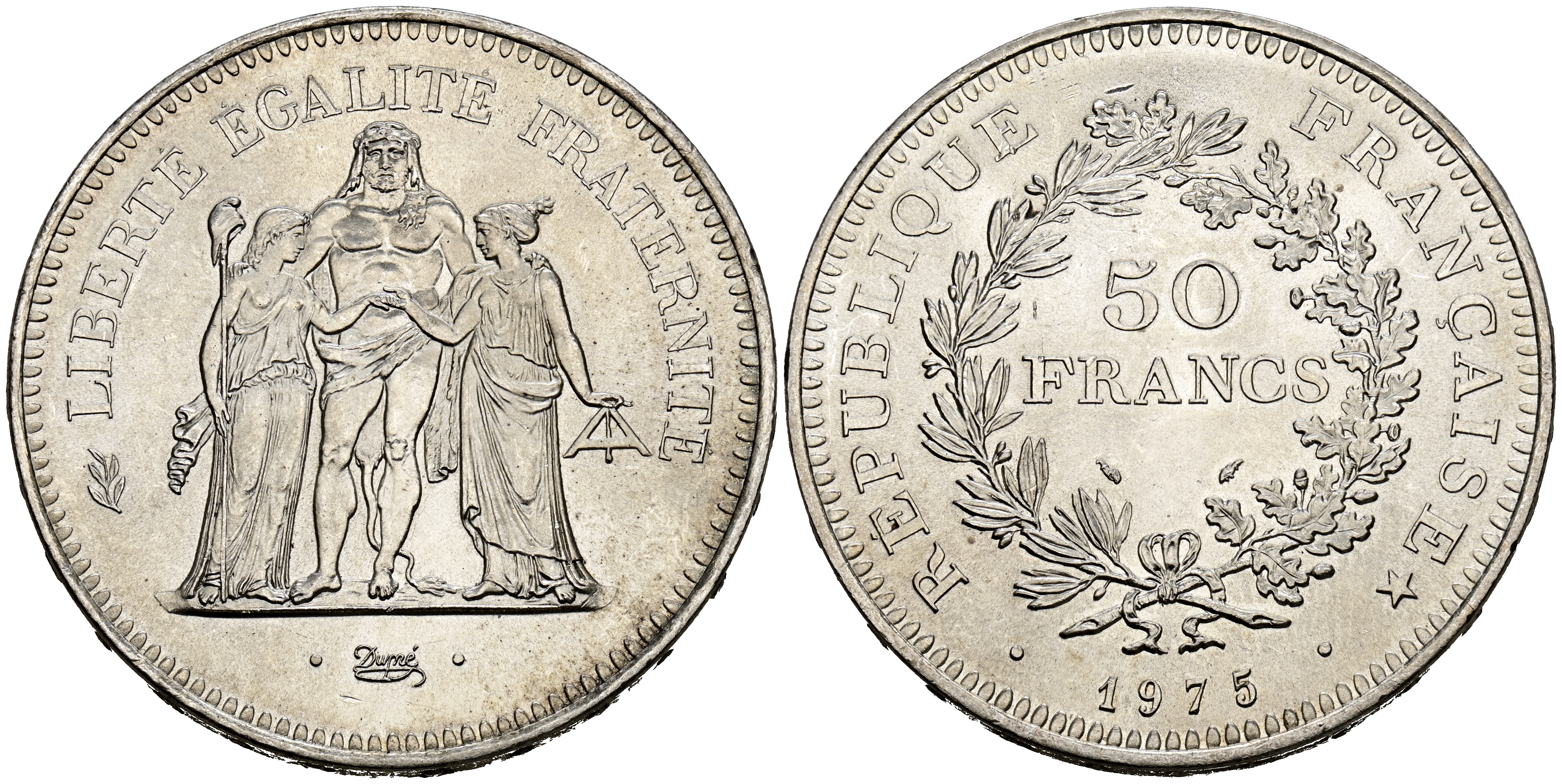 FRANCIA. 50 Francs. (Ar. 30,07g/41mm). 1975. Hércules. (Km#941). EBC+.