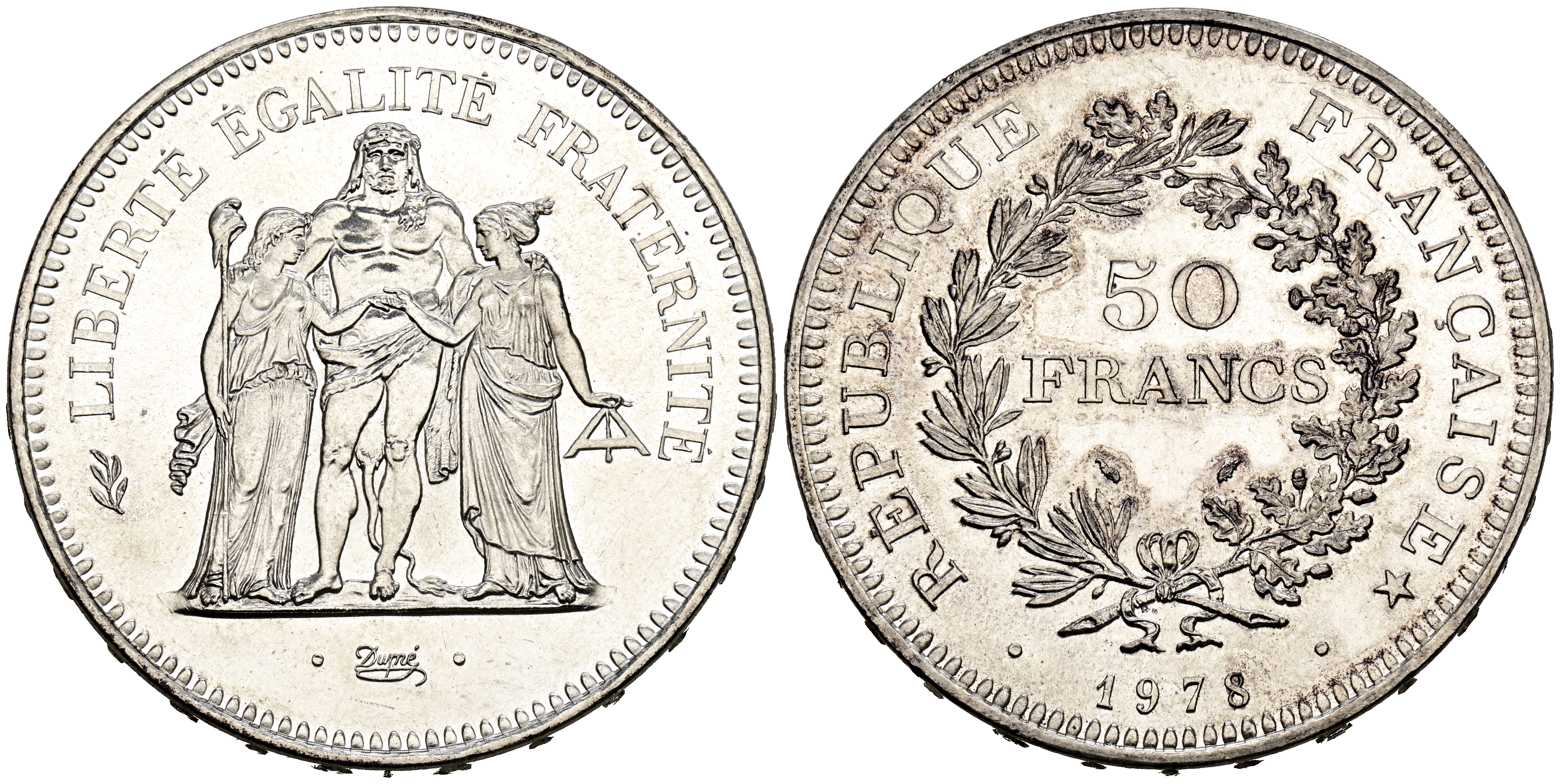 FRANCIA. 50 Francs. (Ar. 29,90g/41mm). 1978. Hércules. (Km#941). EBC.