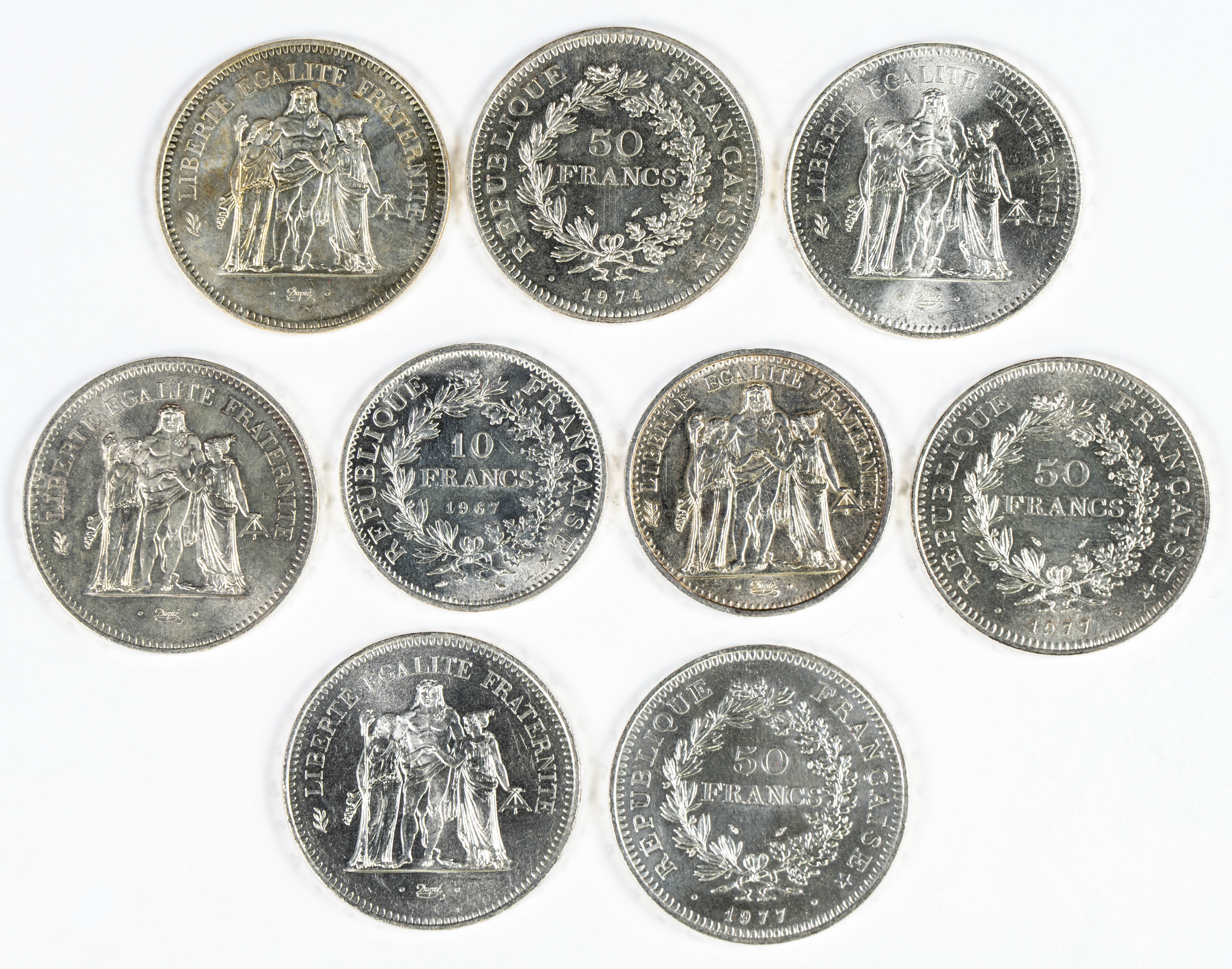 FRANCIA. Interesante y bonito conjunto de 9 monedas en plata de 10 (2) y 50 Francs (7). Tipo Hércules. Excelente estado de conservación general. A EXAMINAR.