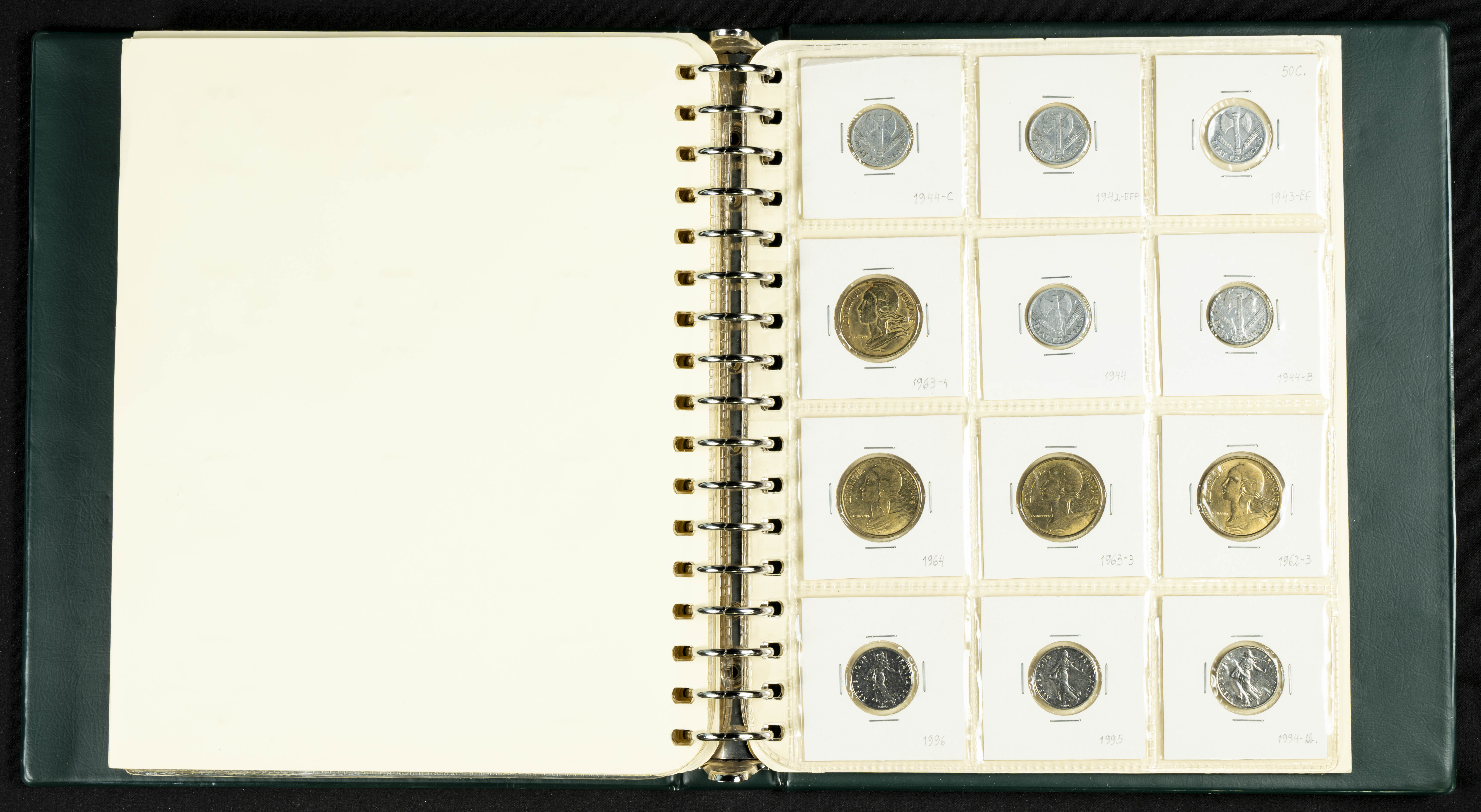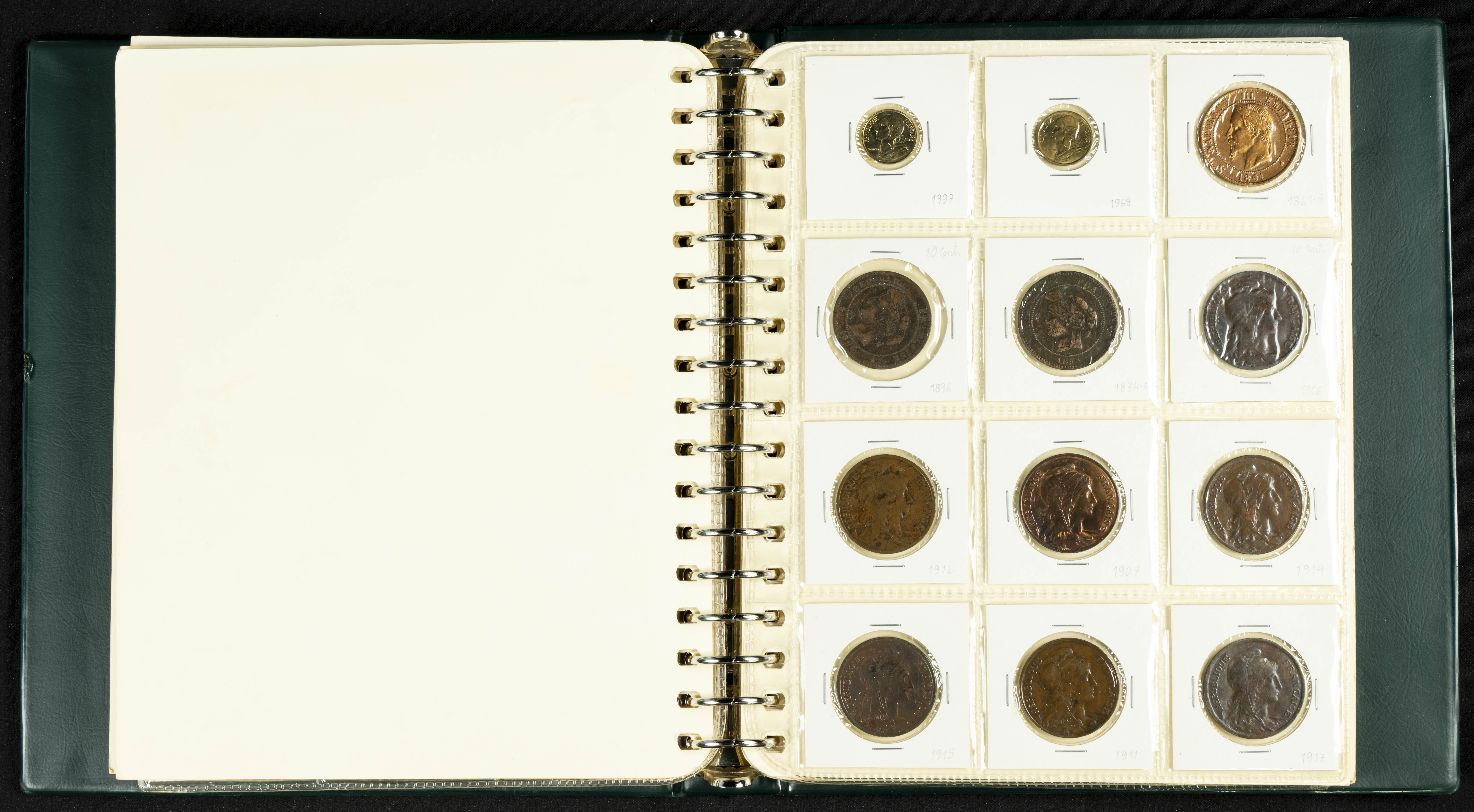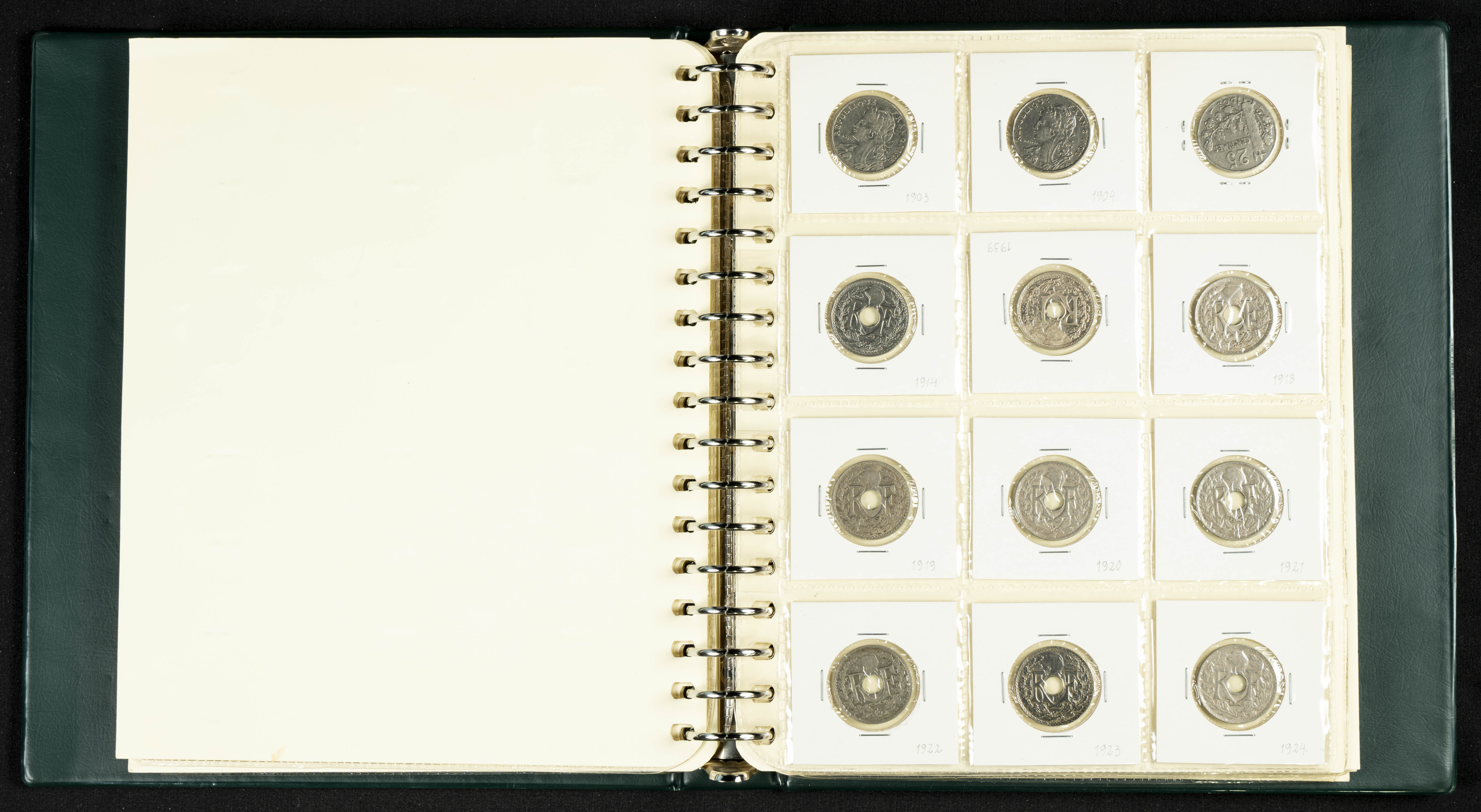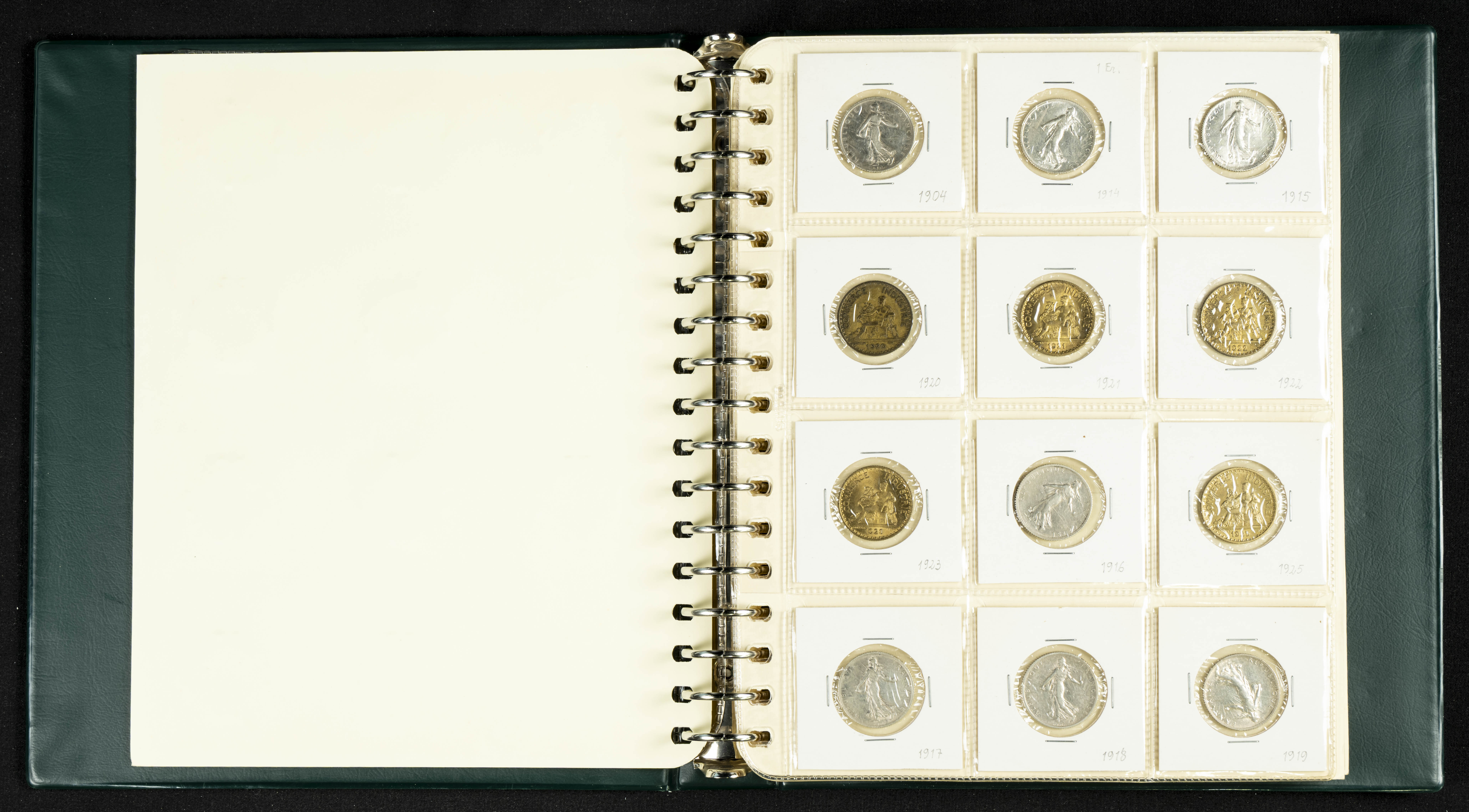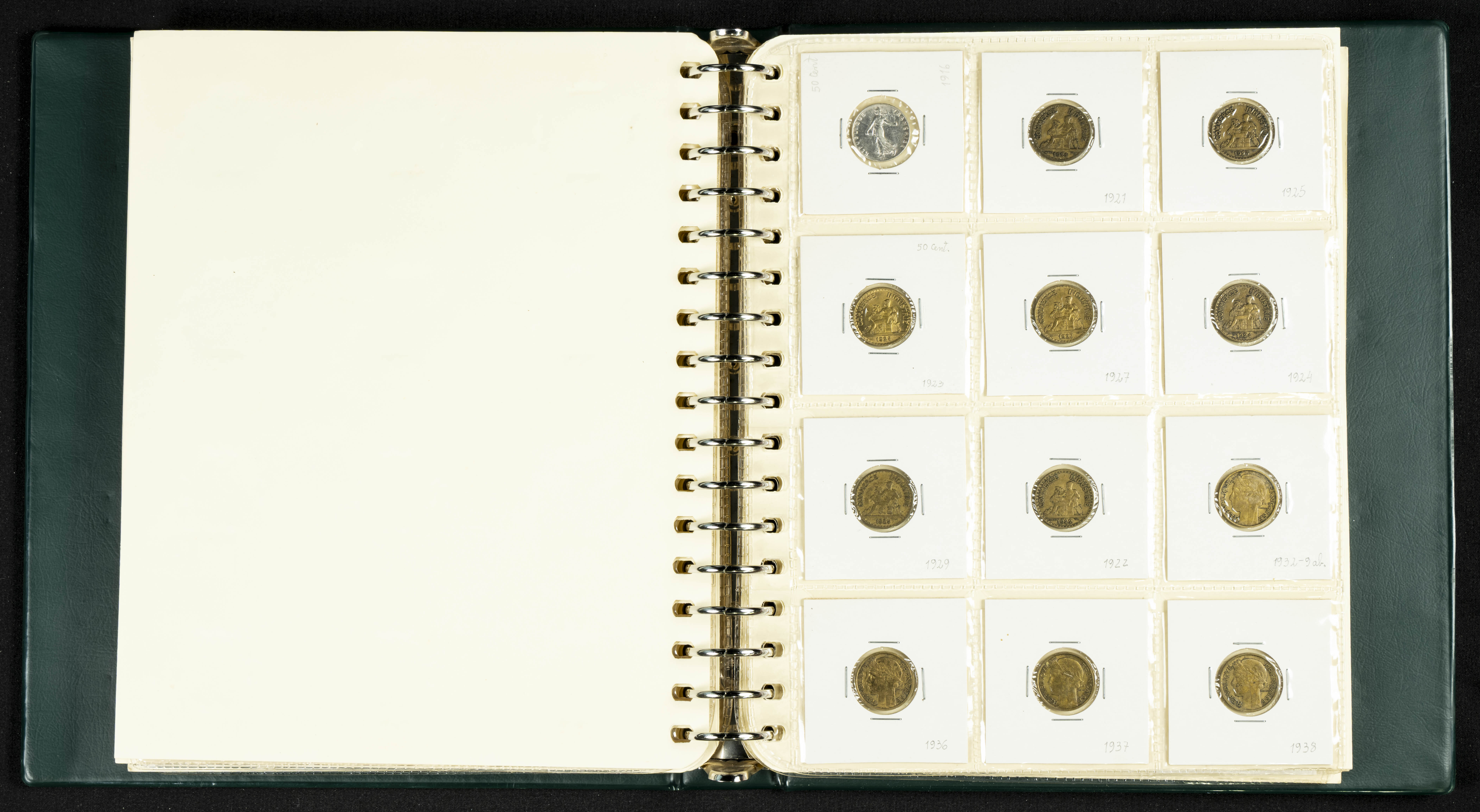 FRANCIA. Interesante y extenso conjunto formado por más de 500 monedas y expuestas en 4 álbumes con acuñaciones comprendidas entre finales de los siglos XIX y XX. Gran variedad de módulos, materiales y fechas así como de estados de conservación. A EXAMINAR.