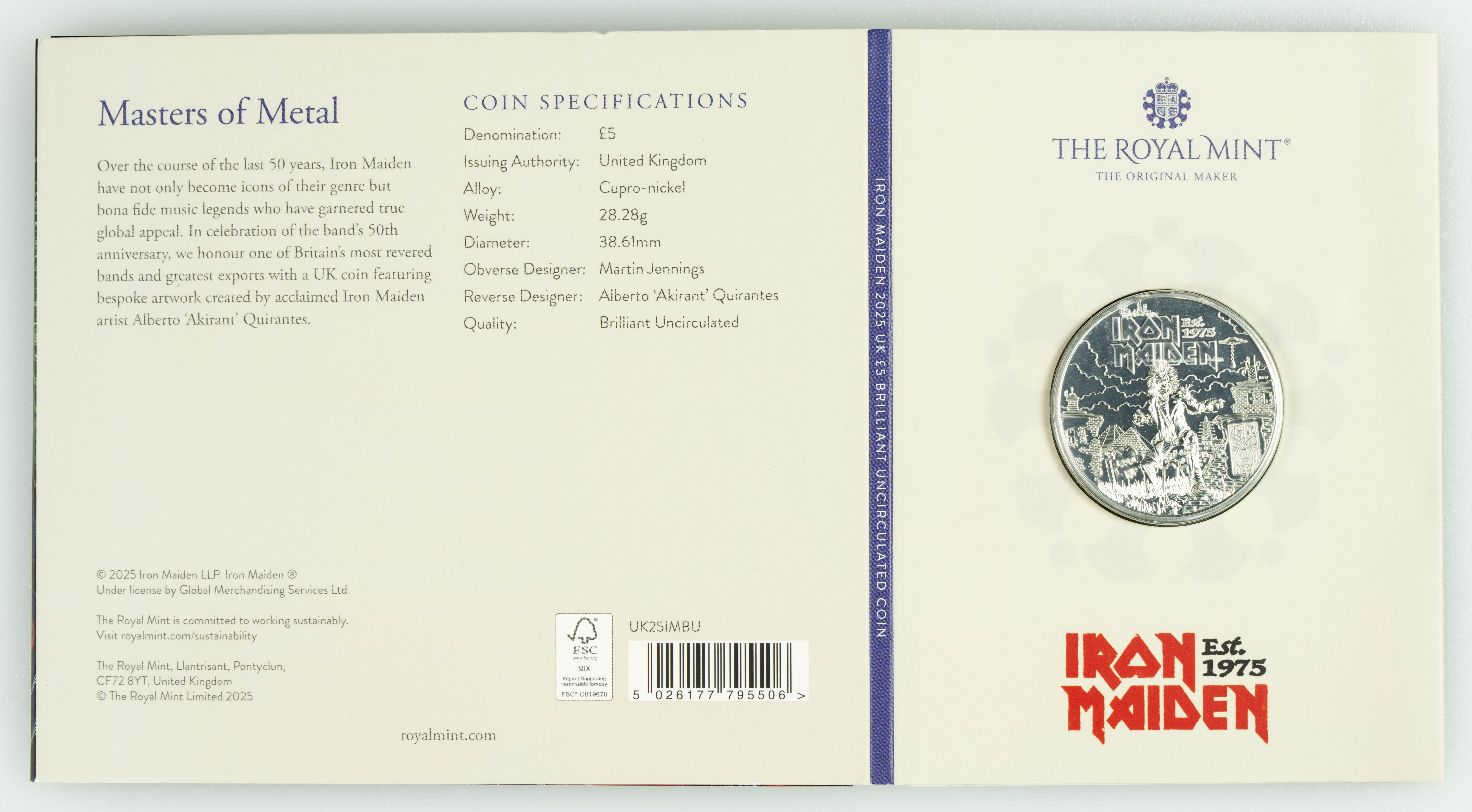 GRAN BRETAÑA. 5 Libras (Ae.Ni. 28,28g/39mm). 2025. Royal Mint. Iron Maiden. 50 Aniversario. Set completo.