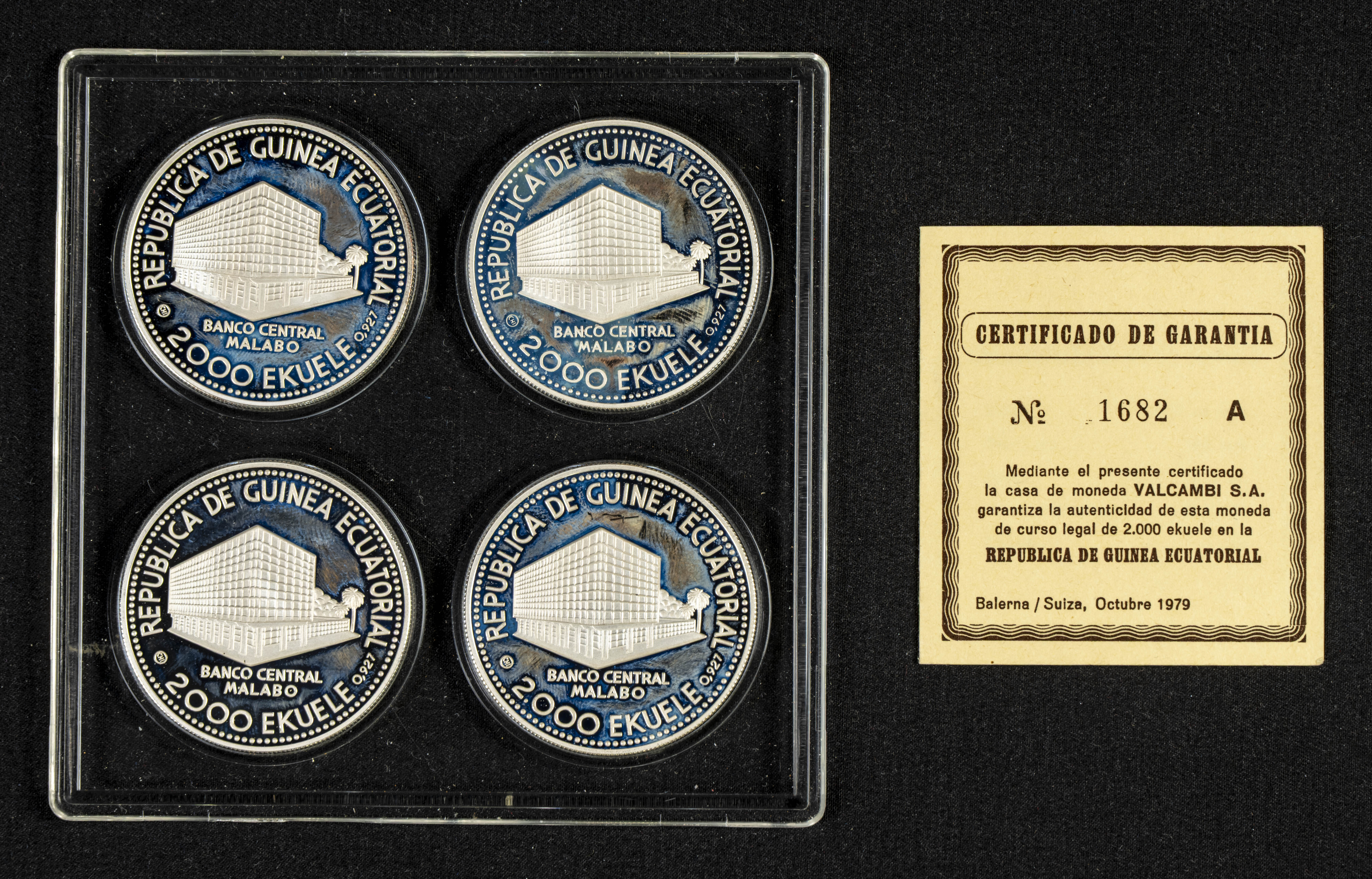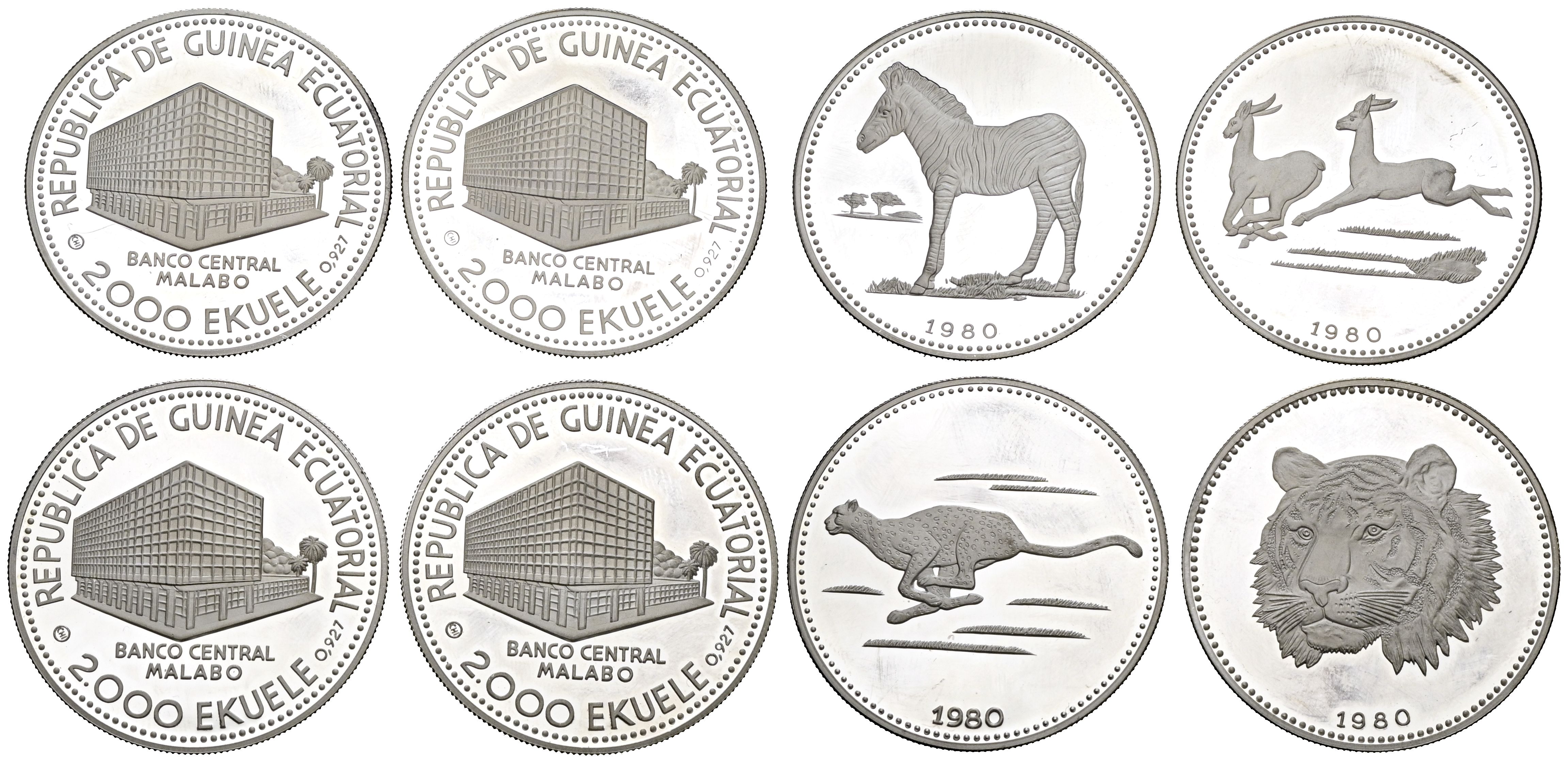 GUINEA ECUATORIAL. Conjunto de 4 monedas de 2000 Ekuele. 1980. Serie Animales. Acuñadas en Suiza por Valcambi. PROOF. Presentadas en estuche y con un certificado de autenticidad. Todas las piezas diferentes. Tiradas escasas.