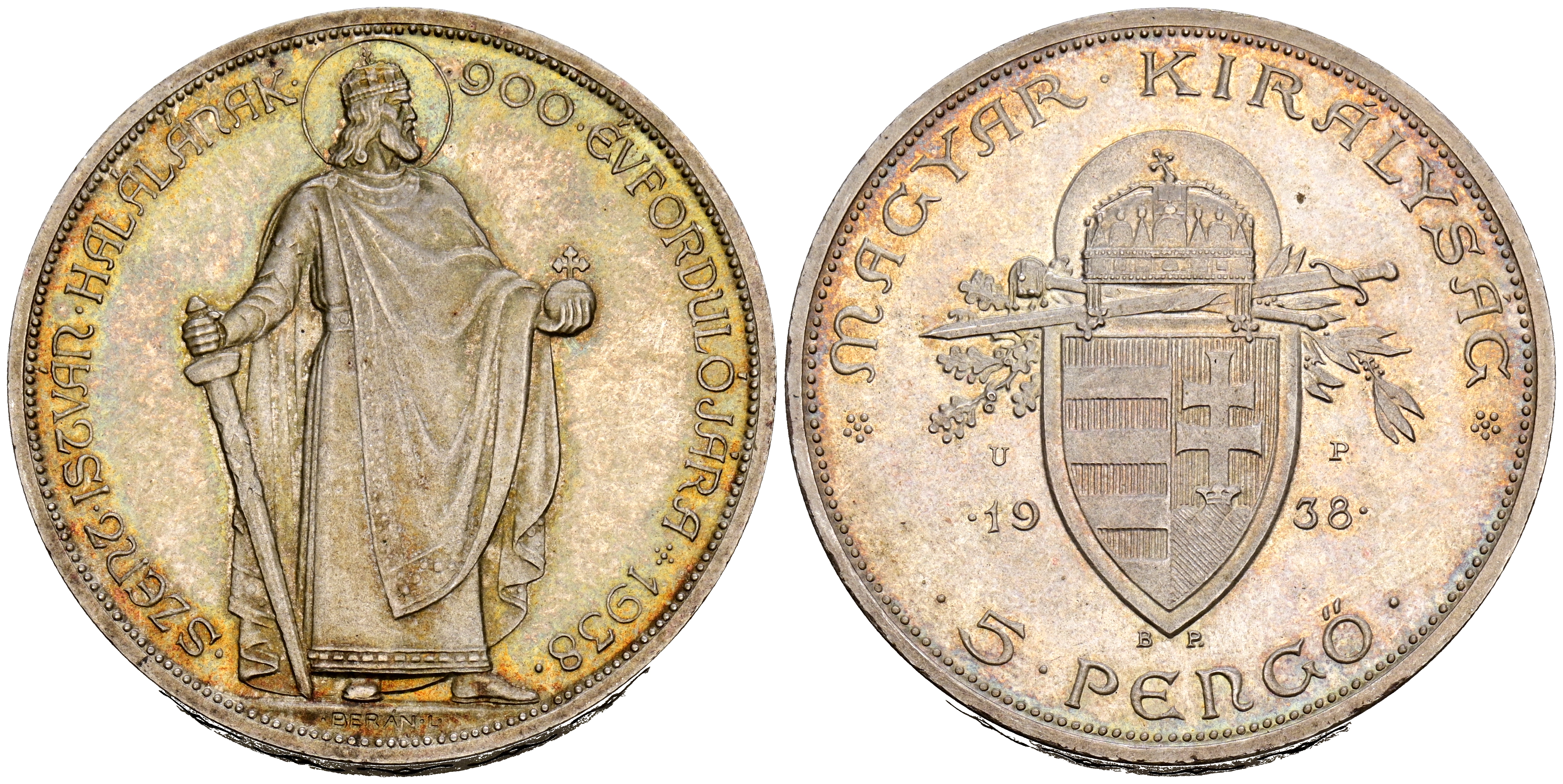HUNGRÍA. 5 Pengo. (Ar. 24,70g/36mm). 1938. 900º aniversario de la muerte de San Esteban. Reacuñación oficial (1960 ca.). (Km#X Pn 13.1). PROOF (UP). Preciosa tonalidad dorada. Escasa.