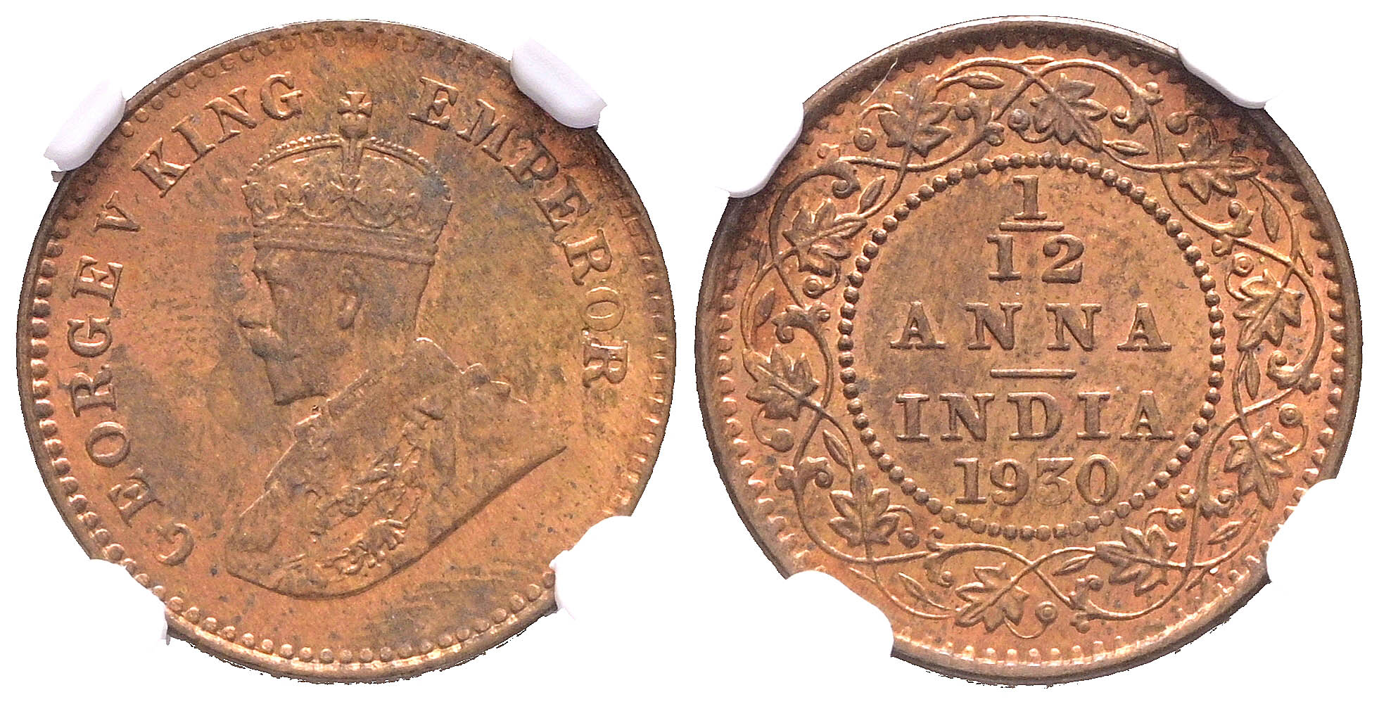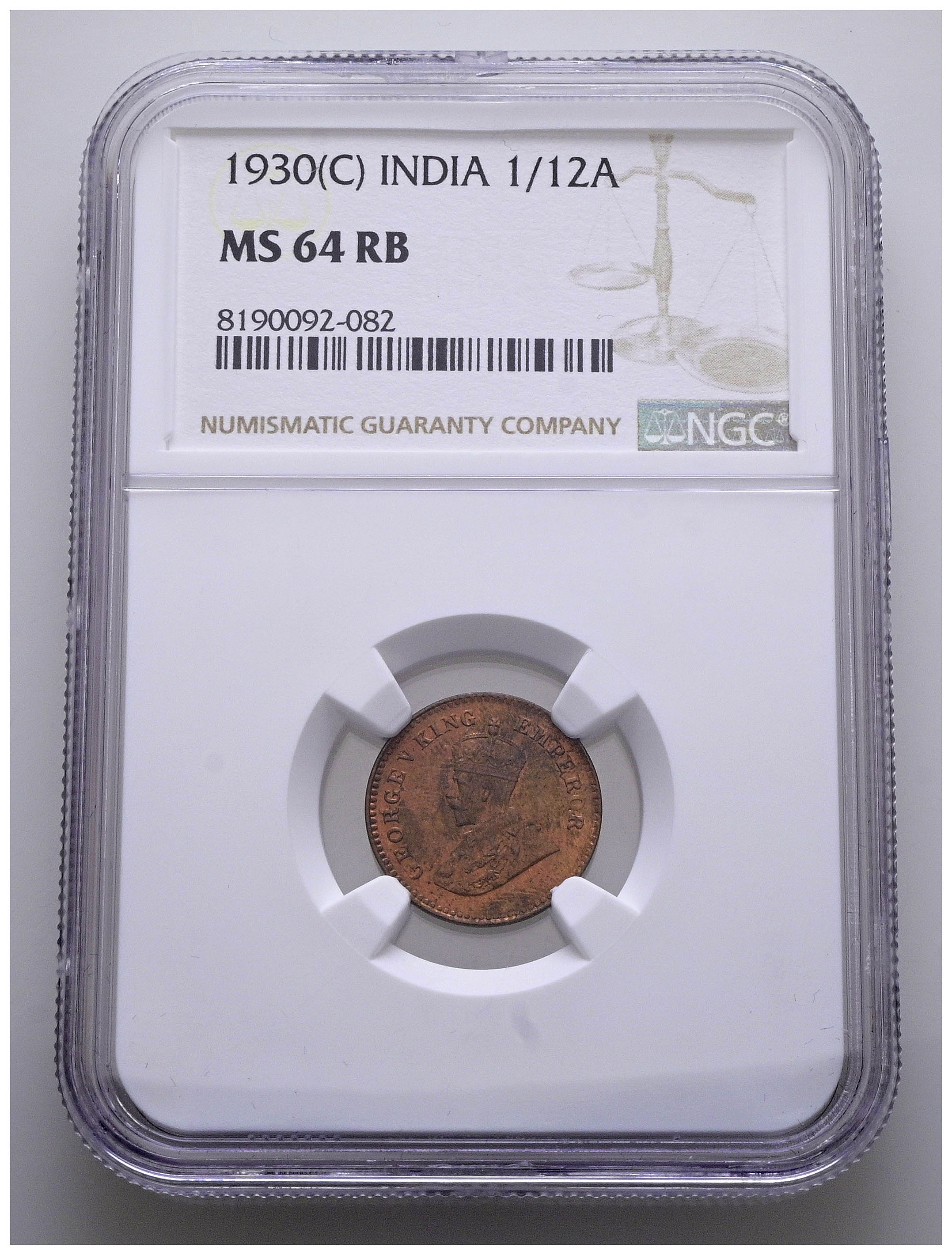 INDIA (BRITÁNICA), Jorge V. 1 1/12 Anna. (Ae. 1,60/17mm)*. 1930. (Km#509). Encapsulada por NGC MS 64 RB *Peso y medidas teóricos.