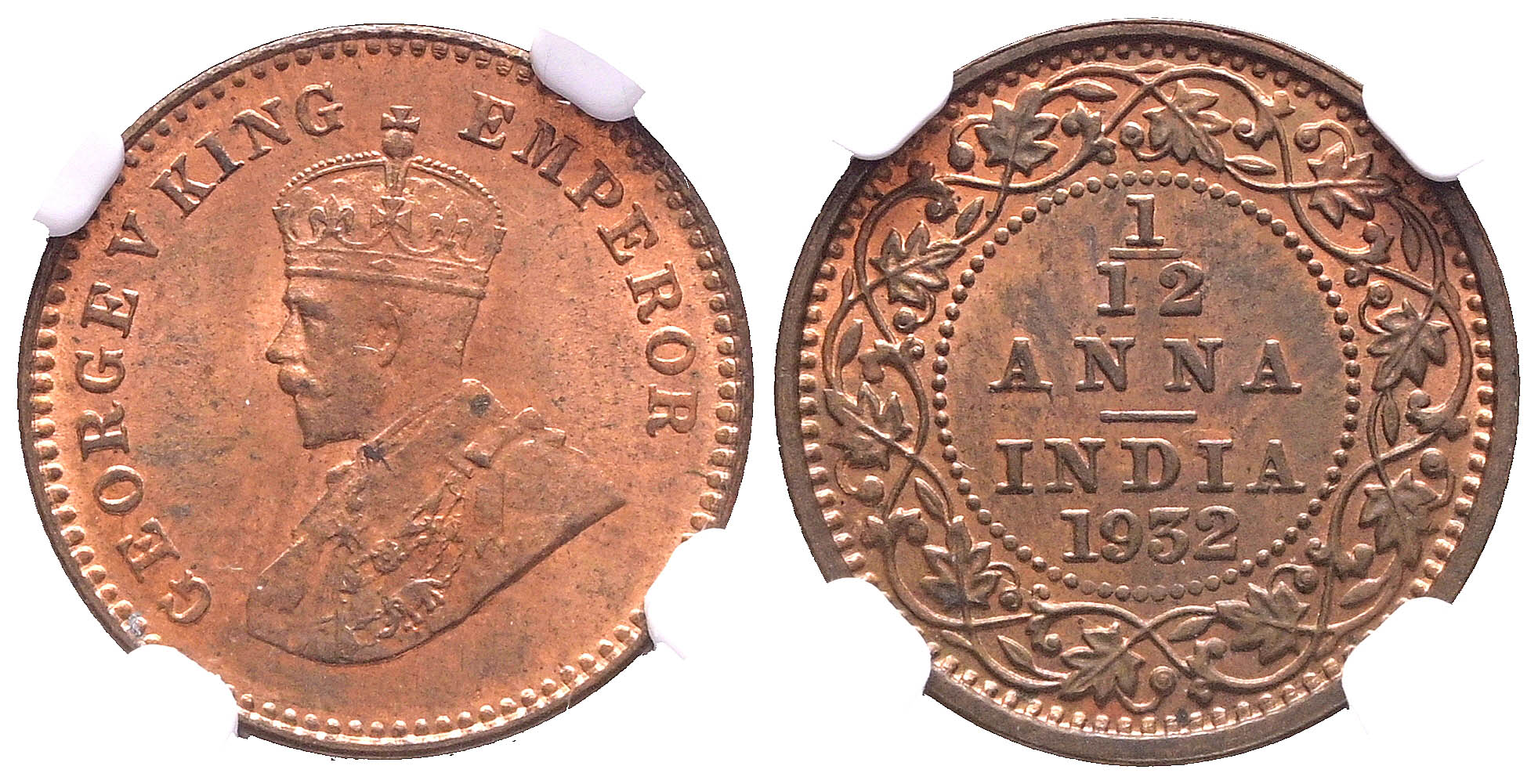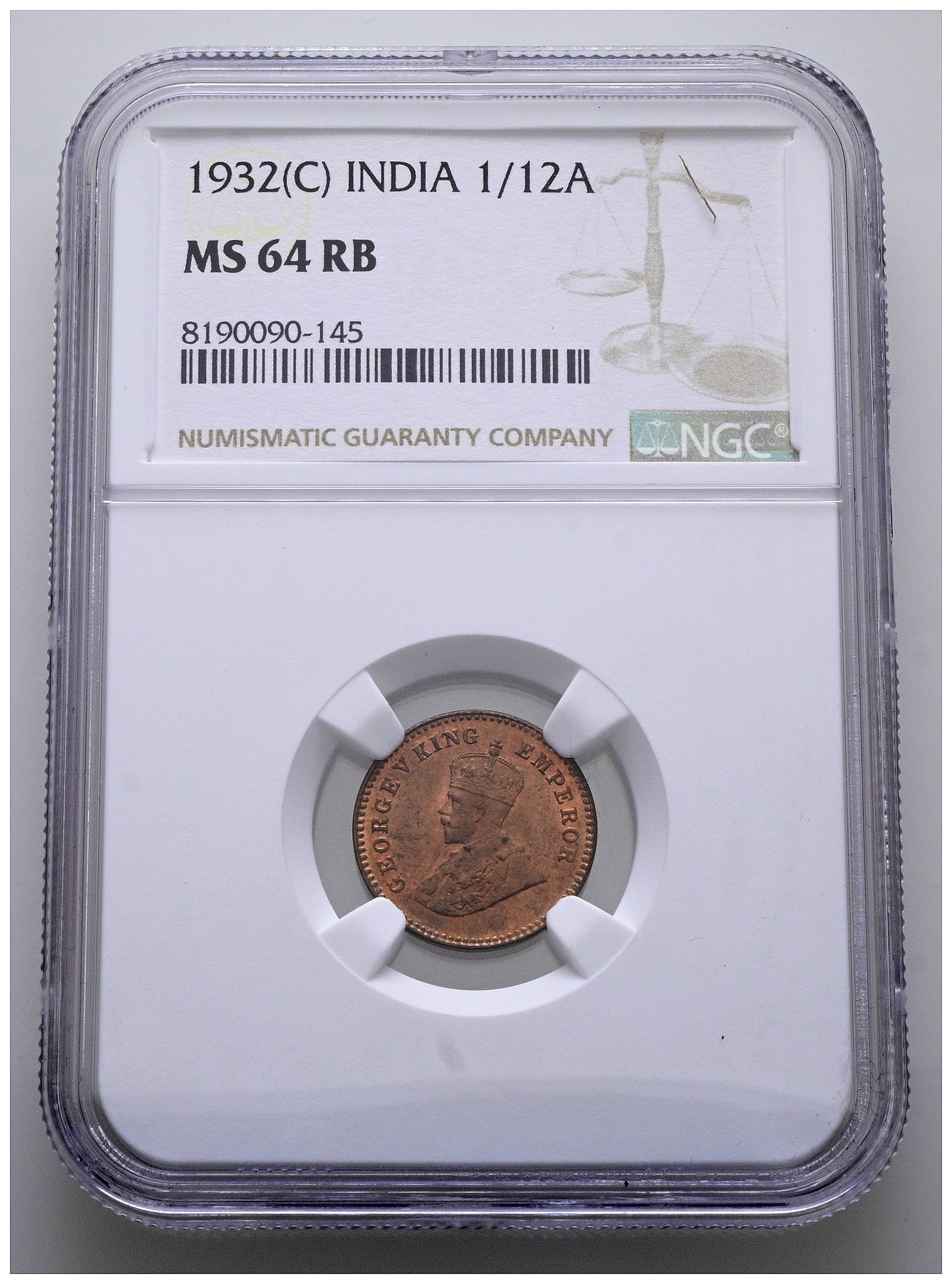 INDIA (BRITÁNICA), Jorge V. 1 1/12 Anna. (Ae. 1,60/17mm)*. 1932 C. (Km#509). Encapsulada por NGC MS 64 RB. *Peso y medidas teóricos.