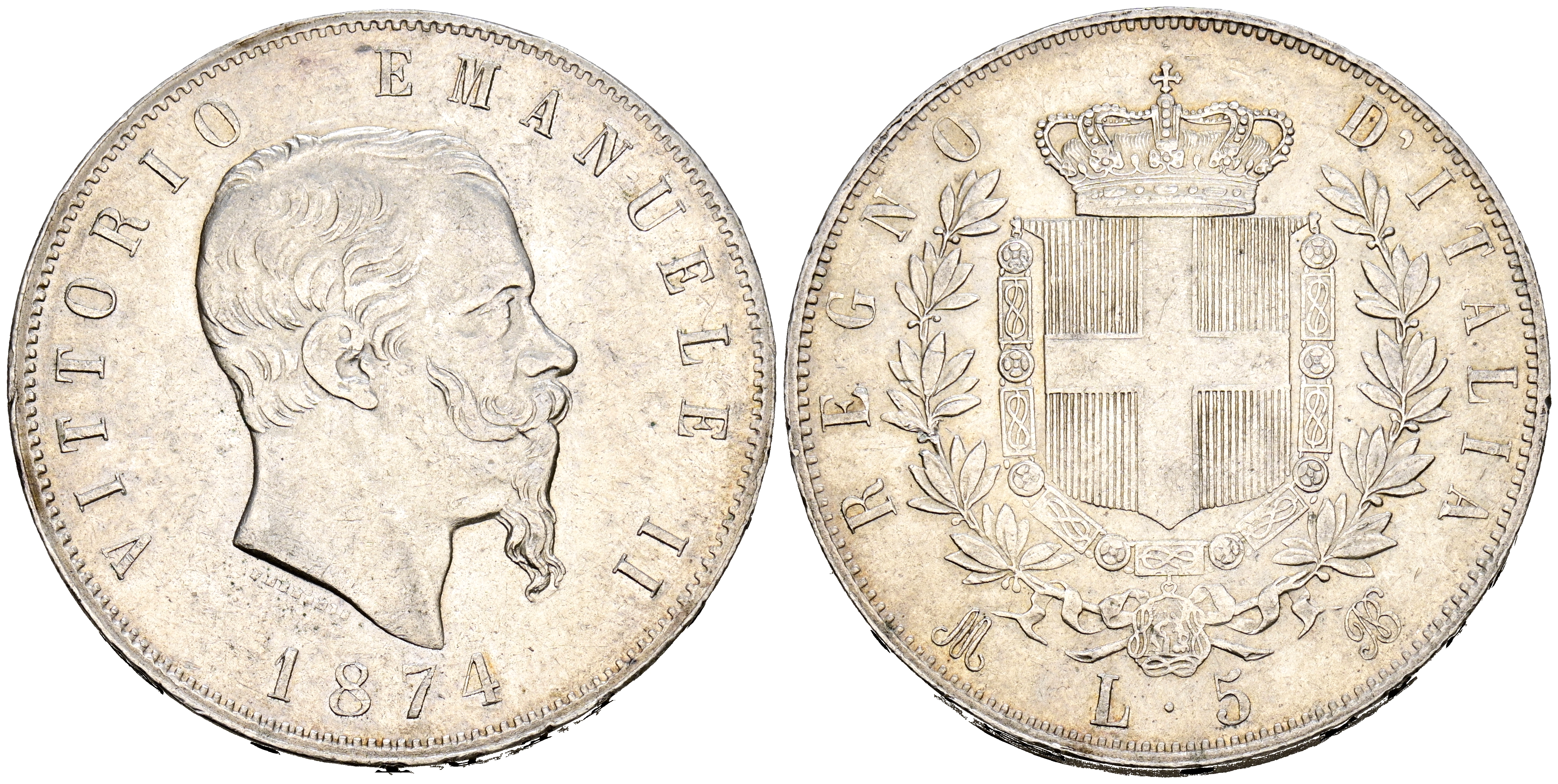 ITALIA, Victor Manuel II. 5 Liras. (Ar. 25,04g/37mm). 1874. Milán. (Km#8.3). EBC-. Buen ejemplar.