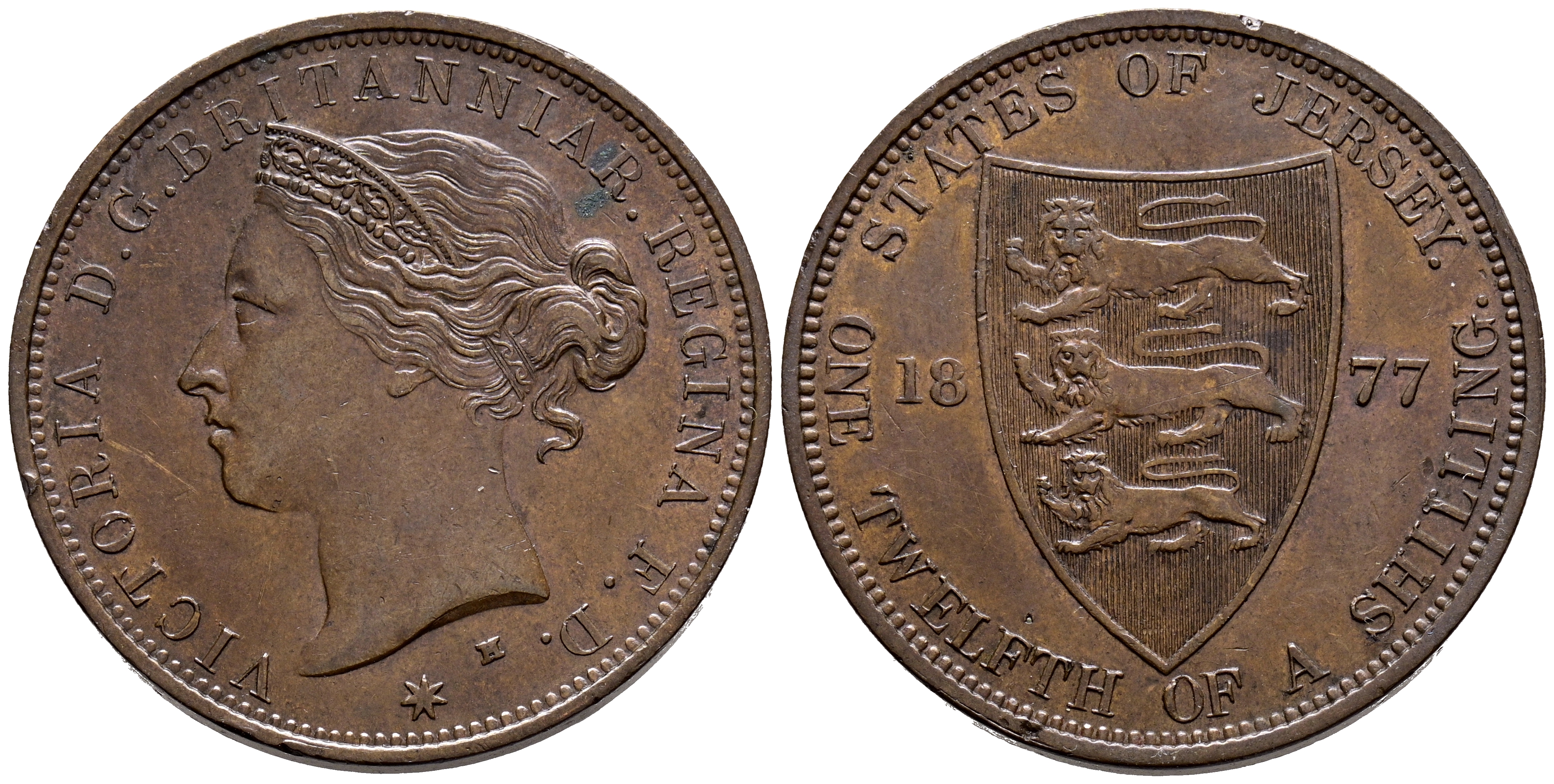 JERSEY. 1/12 Shilling. (Ae. 9,46g/30mm). 1877. Heaton H. (Km#8). EBC-.