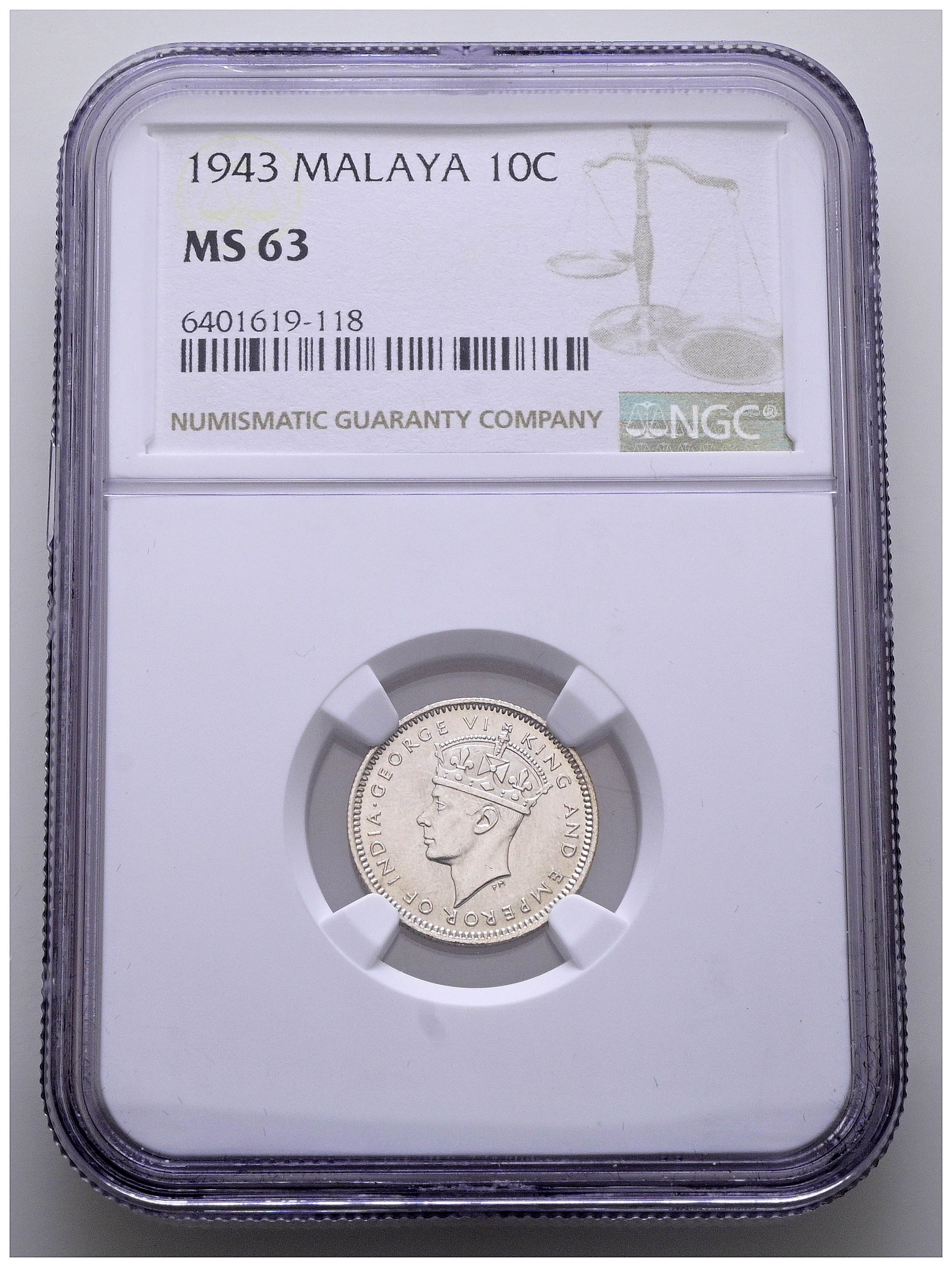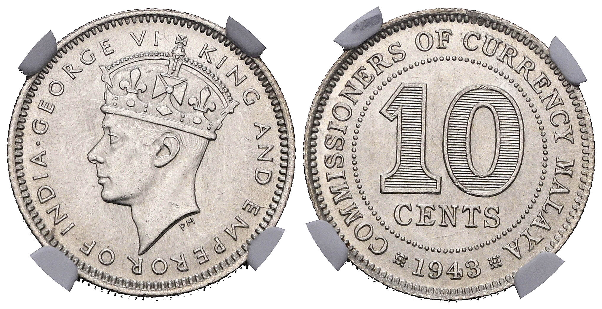 MALAYA, Jorge VI. 10 Cents. (Ar. 2,71g/18mm)*. 1943. (Km#4a). Encapsulado por NGC MS 63. *Peso y medida teóricos.