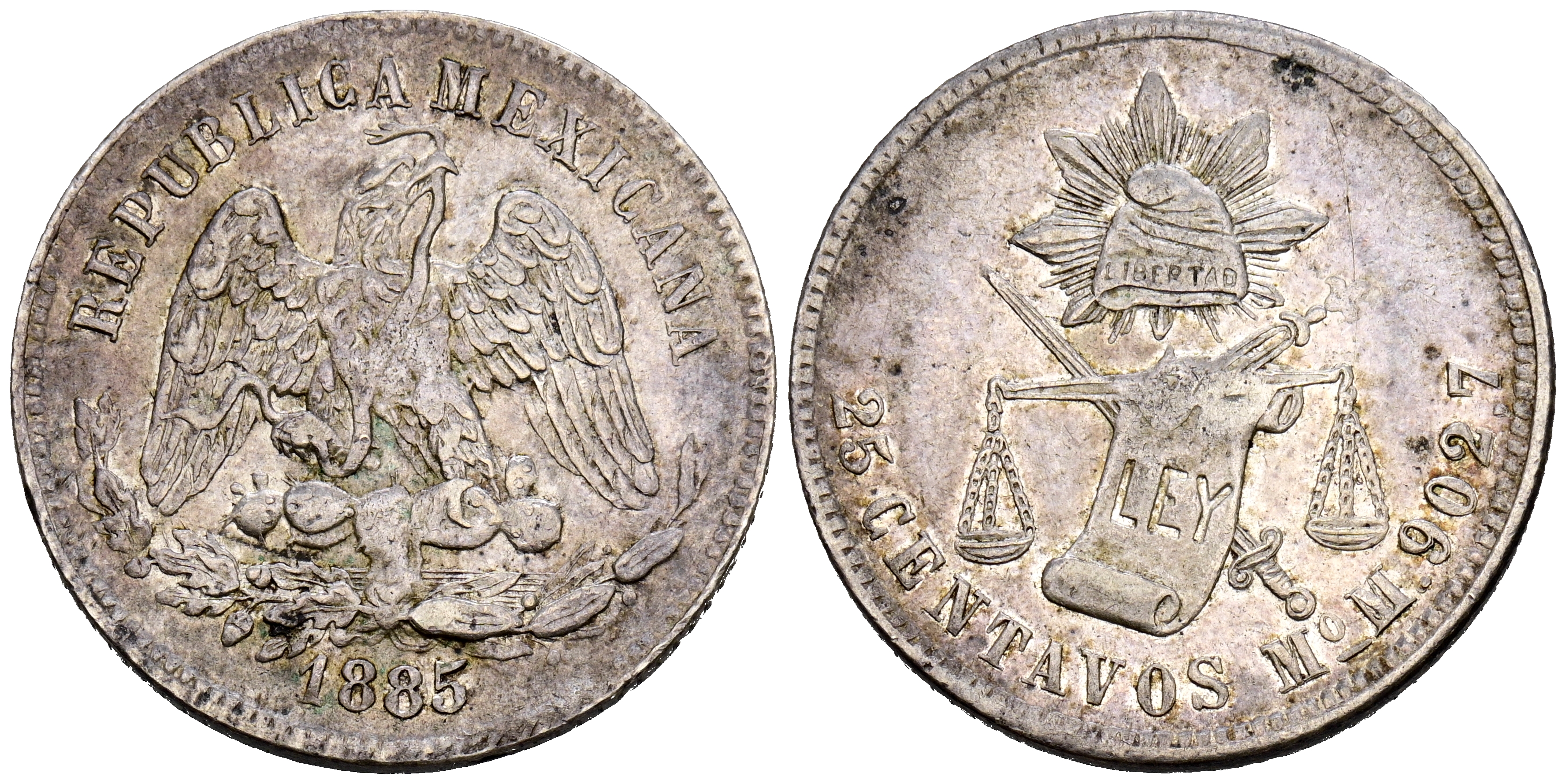 MÉXICO. 25 Centavos. (Ar. 6,55g/25mm). 1885. México M. (Km#406.7). MBC+. Restos de brillo original.