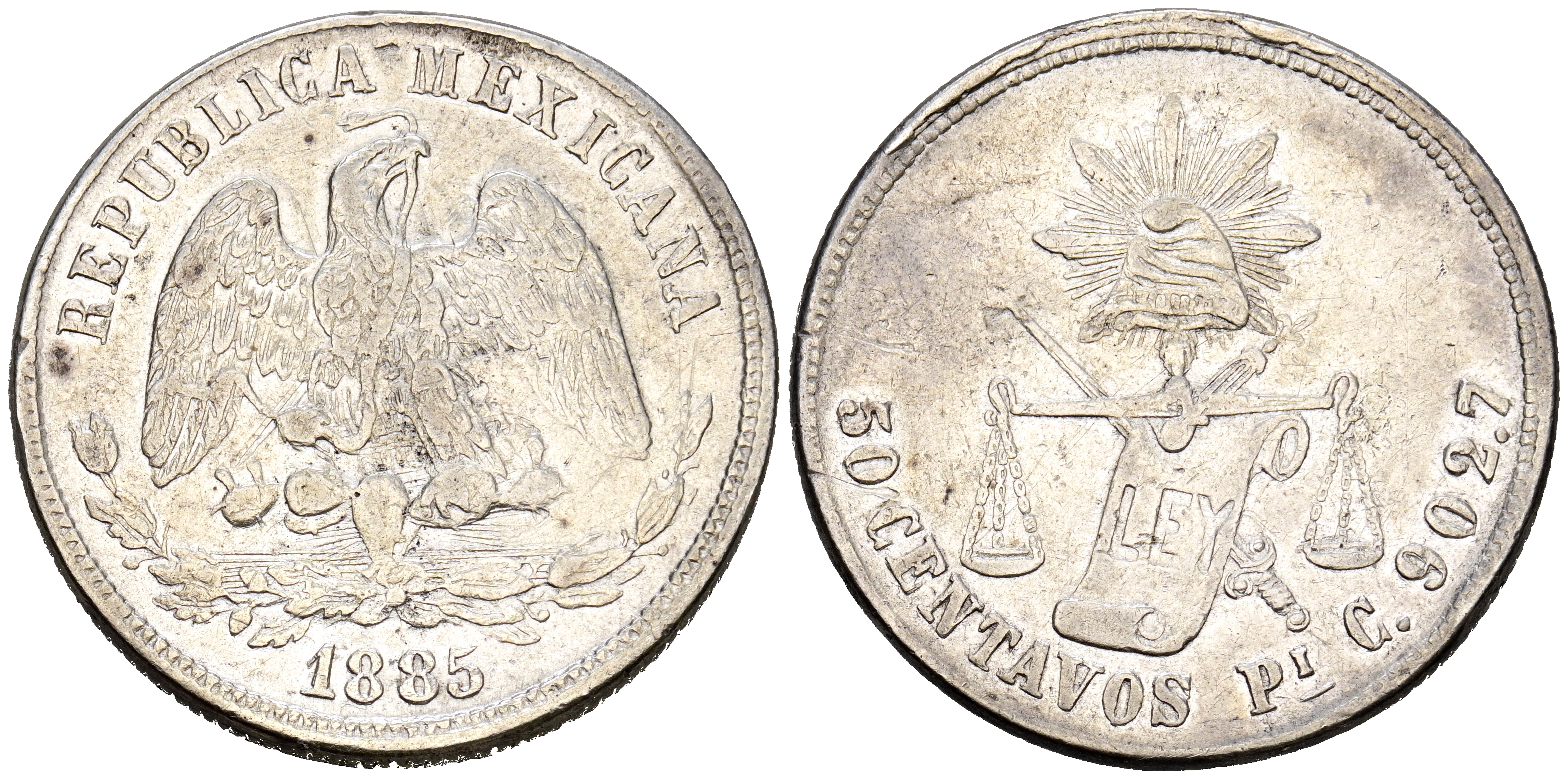 MÉXICO. 50 Centavos. (Ar. 13,45g/31mm). 1885. San Luis de Potosí C. (Km#407.7). MBC. Escasa.