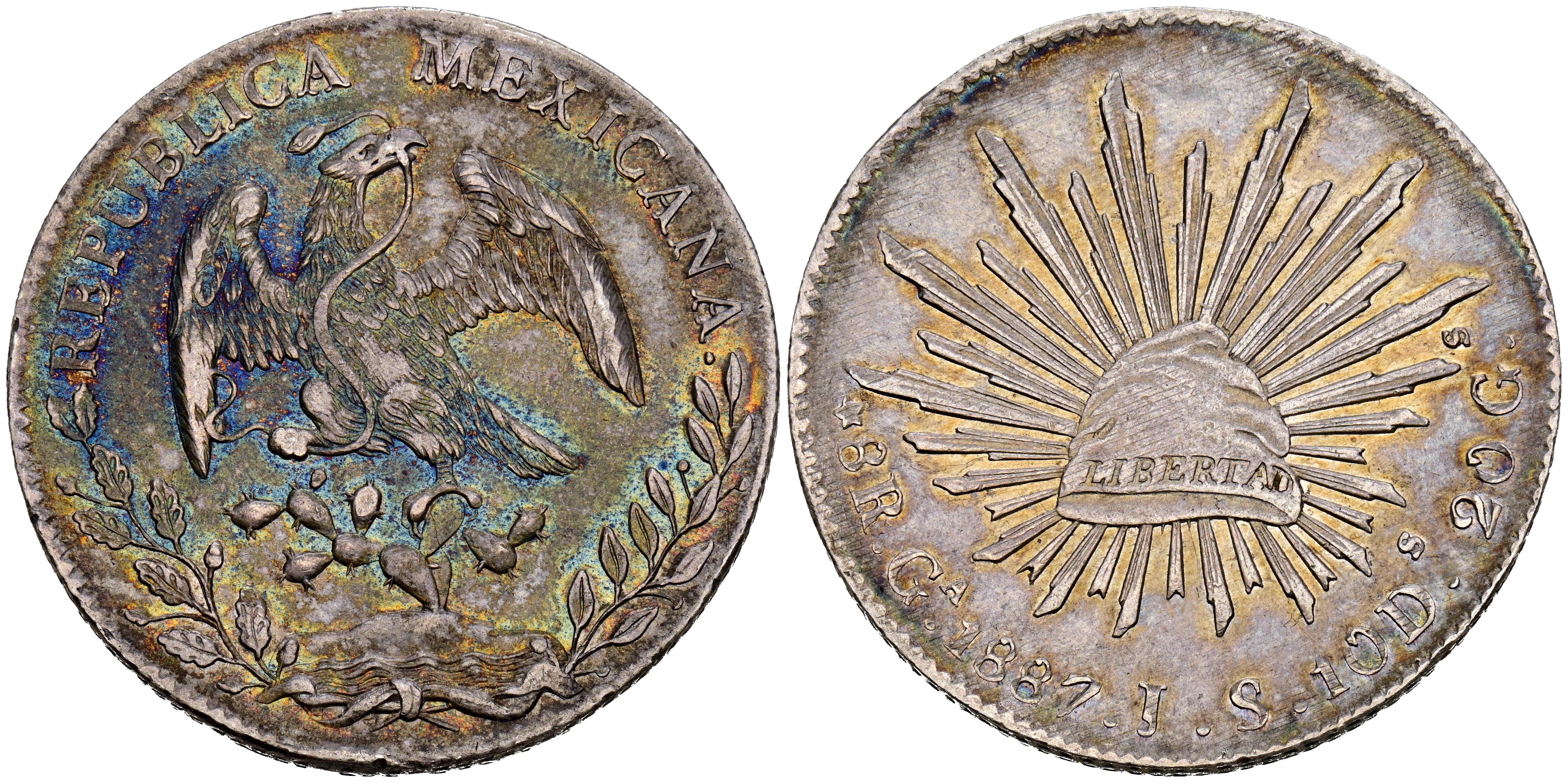 MÉXICO. 8 Reales. (Ar. 27,04g/39mm). 1887. Guadalajara JS. (Km#377.6). MBC+. Bonito tono irisado.