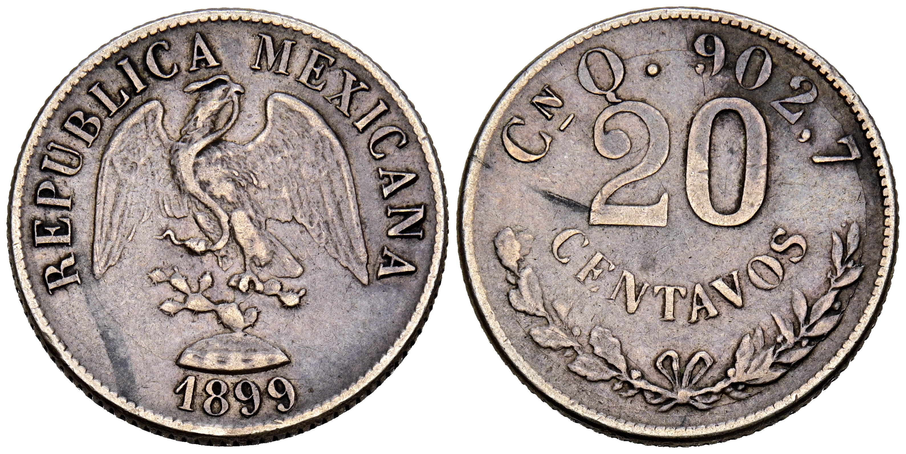 MÉXICO. 20 Centavos (Ar. 5,35g/22mm). 1899. Culiacán Q. (Km#405). MBC. Escasa.