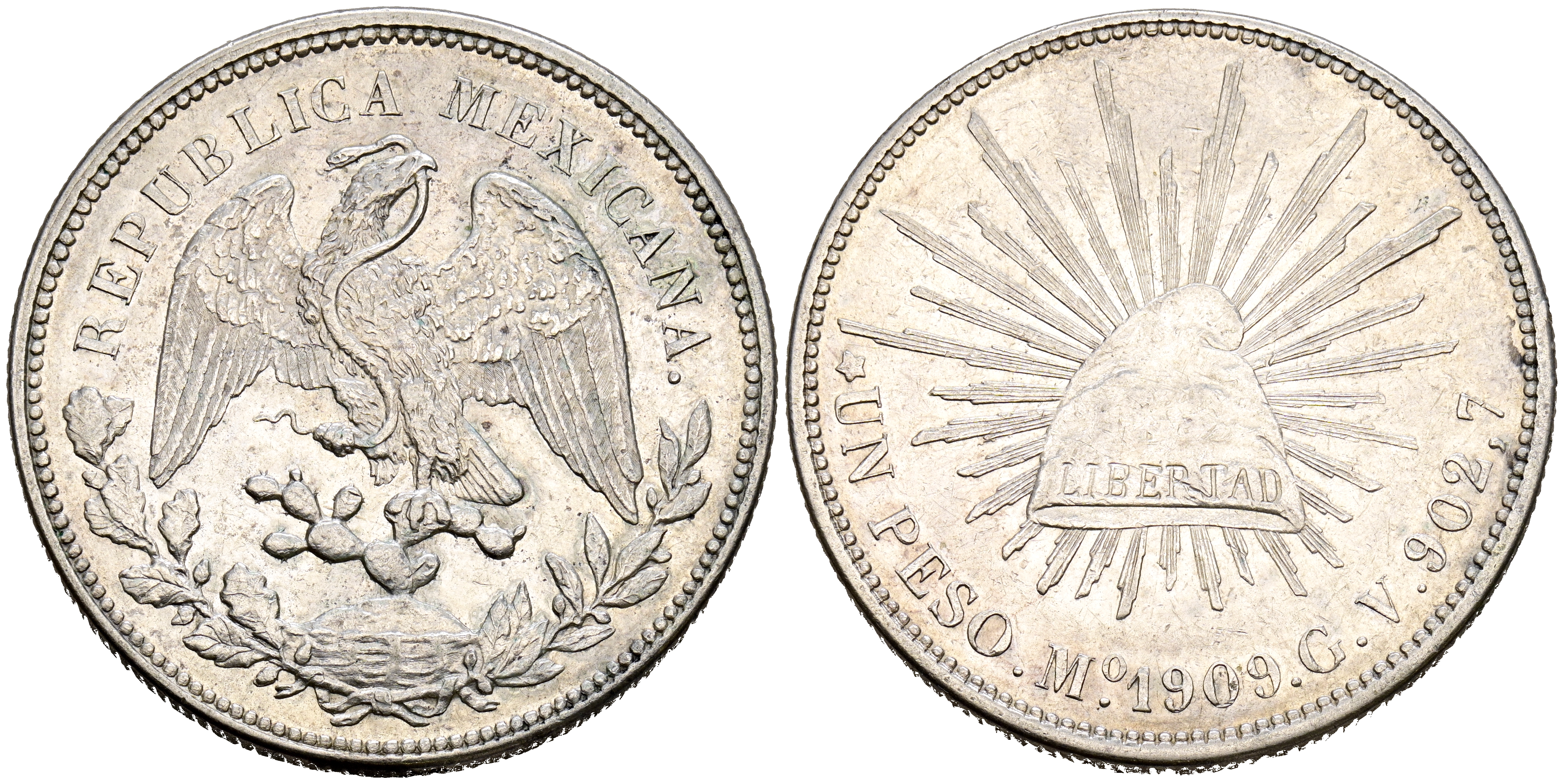 MÉXICO. 1 Peso (Ar. 27,07g/39mm). 1909. México GV. (Km#409.2). MBC+.