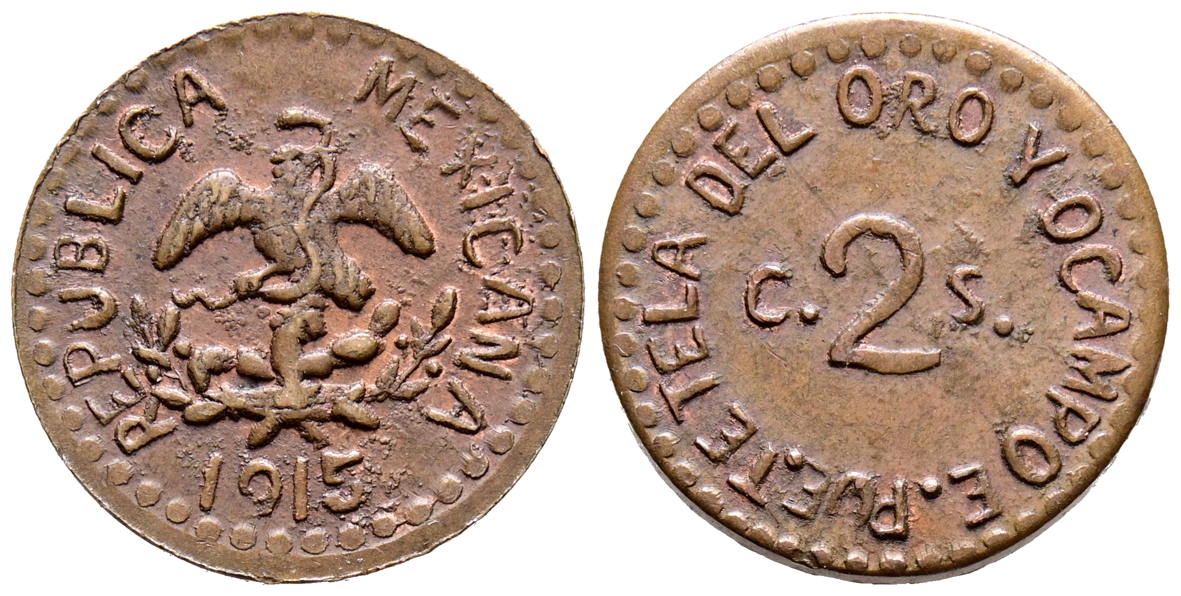 MÉXICO. 2 Centavos. (Ae. 1,58g/17mm). 1915. Tetela de Oro y Ocampo (Puebla). (Km#759). MBC+. Interesante acuñación revolucionaria.