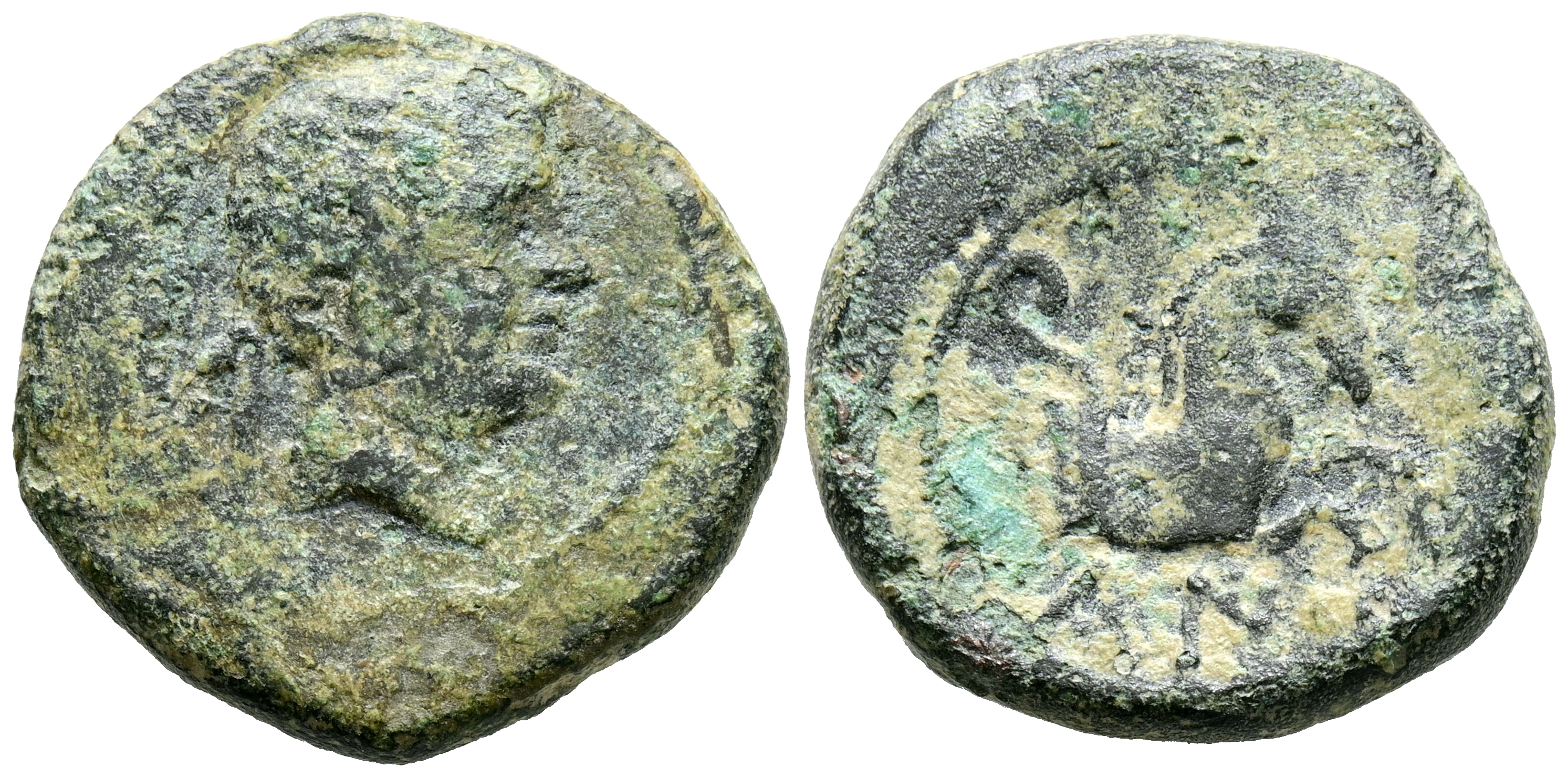 CAIO (zona de Cataluña). Cuadrante. (Ae. 6,66g/20mm). 120-80 a.C. (FAB-400). Anv: Cabeza masculina a derecha, detrás letra ibércia: Ca. Rev: Parte delantera de Pegaso a derecha, debajo: CaI. BC+. Muy raro ejemplar.