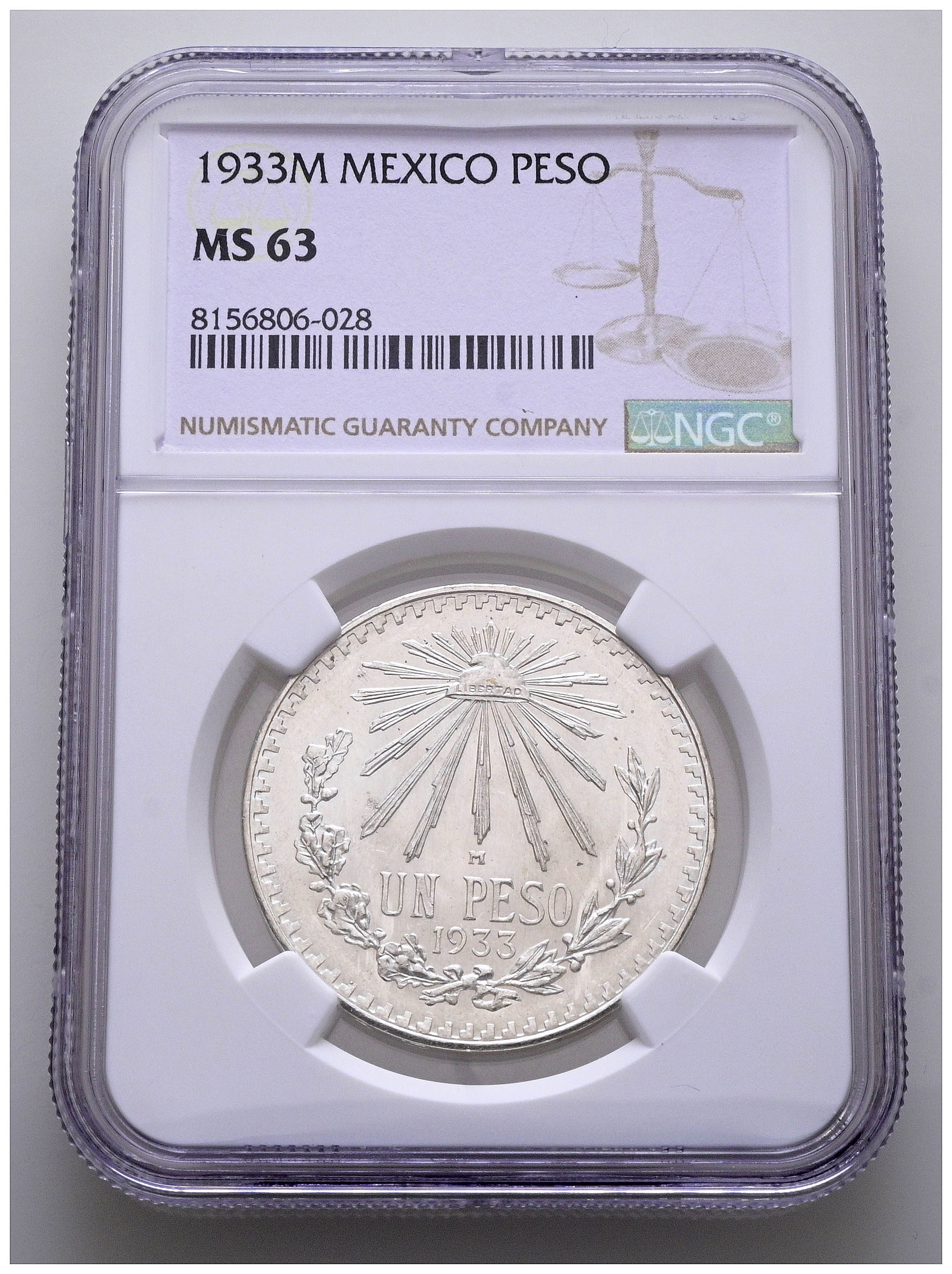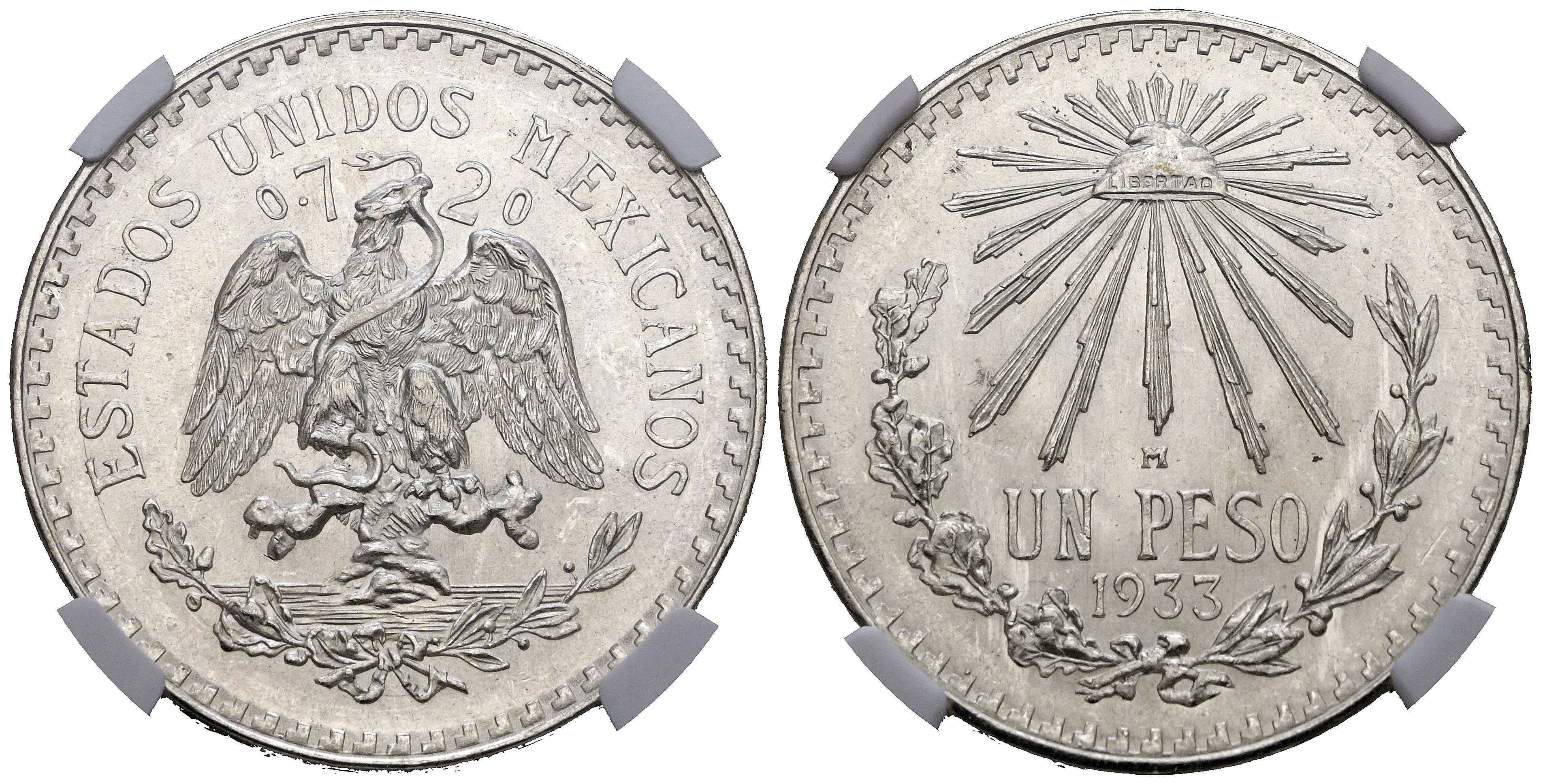 MÉXICO. 1 Peso. (Ar. 16,66g/34mm)*. 1933. (Km#455). Encapsulado por NGC MS 63. *Peso y medida teóricos.