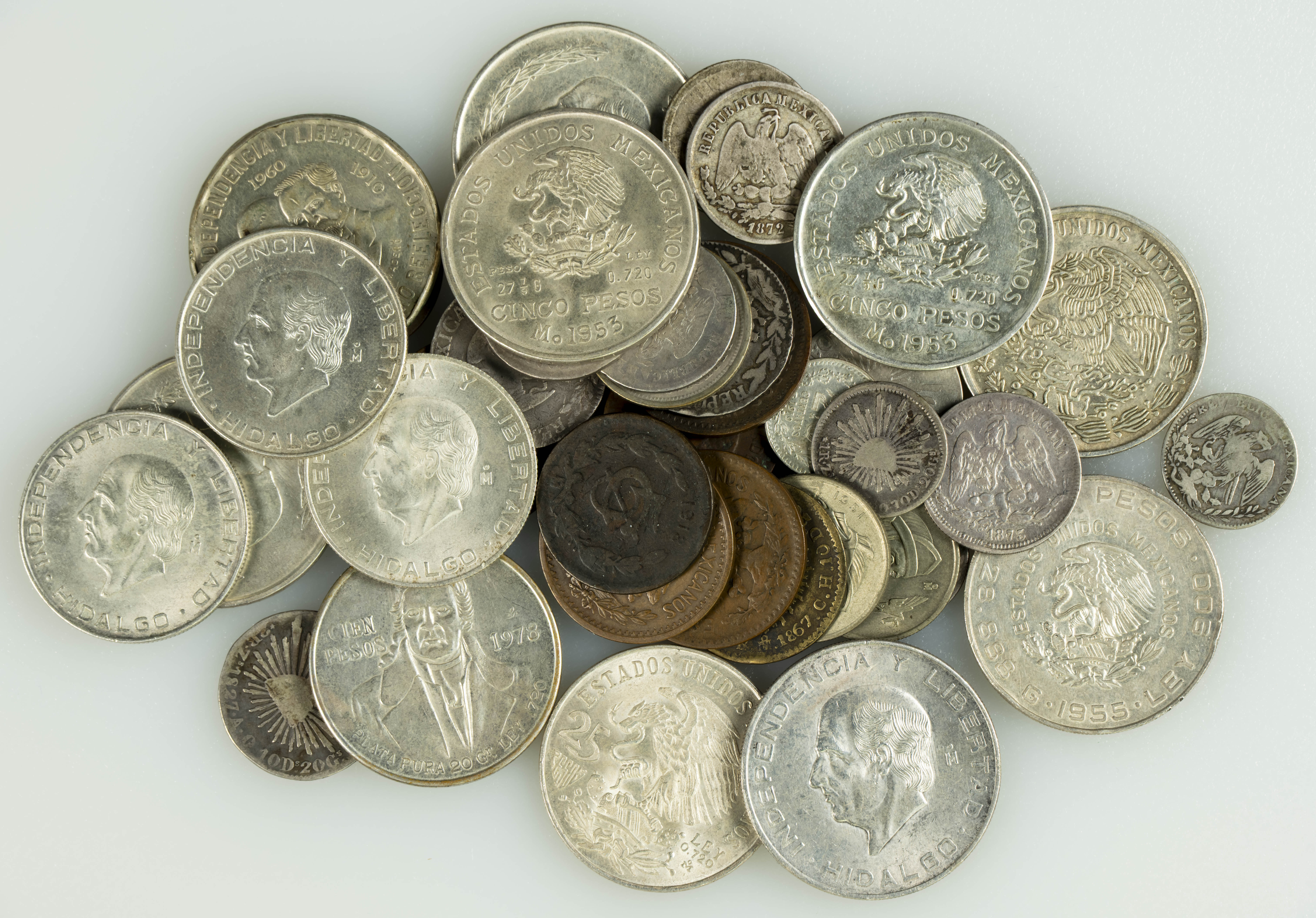 MÉXICO. Interesante resto de colección formado por alrededor de 500 piezas, con una gran cantidad de ellas en plata y con acuñaciones comprendidas entre 1826 y 1978. Incluye módulos de 1 y 2 Reales, Centavos y Pesos, con algunas piezas de escasa tirada. Diferentes estados de conservación. A EXAMINAR