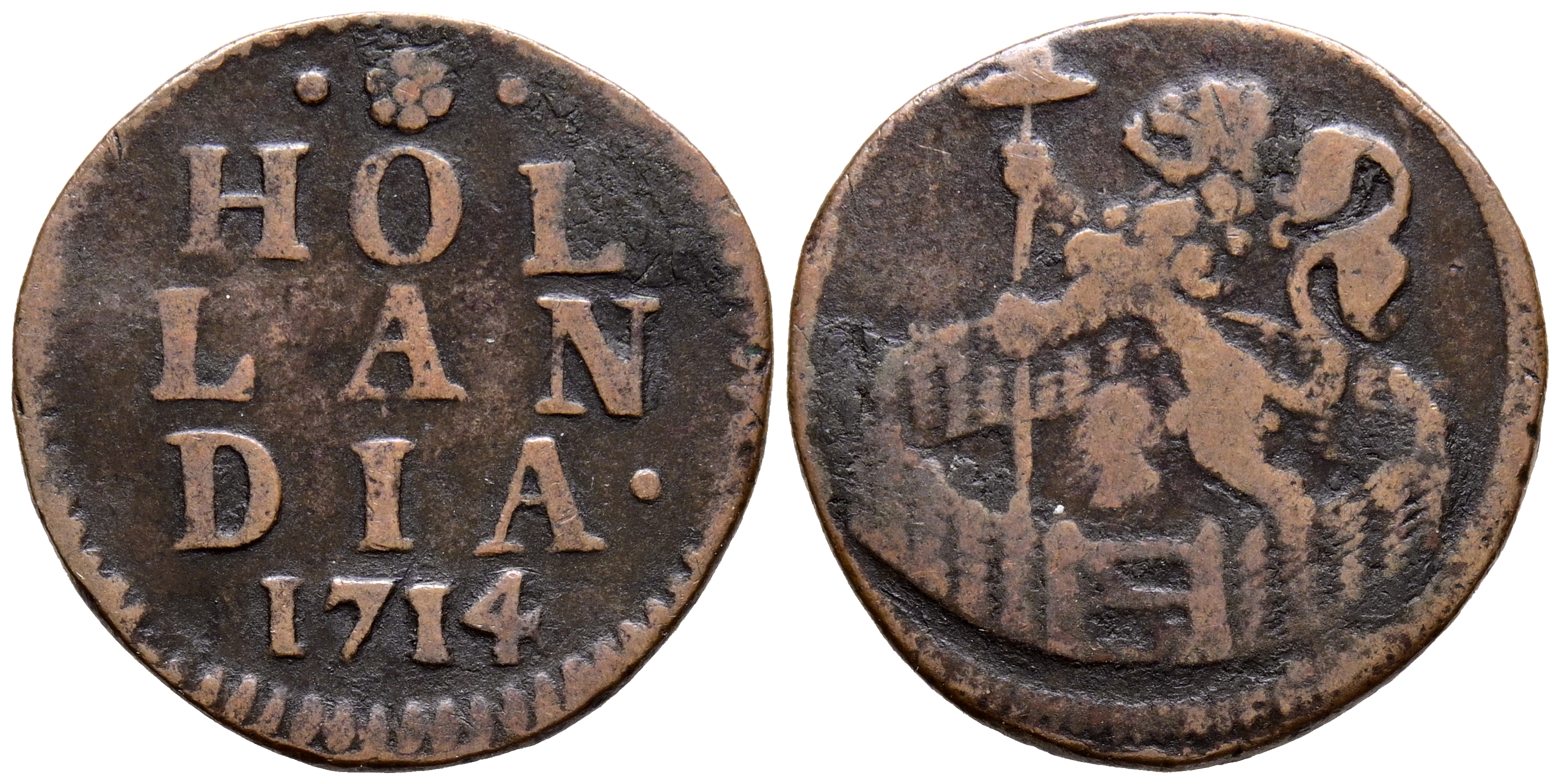 PAÍSES BAJOS. 1 Duit. (Ae. 3,01g/22mm). 1714. Provincia de Holanda. Dordrecht. (Km#80). MBC/MBC-.