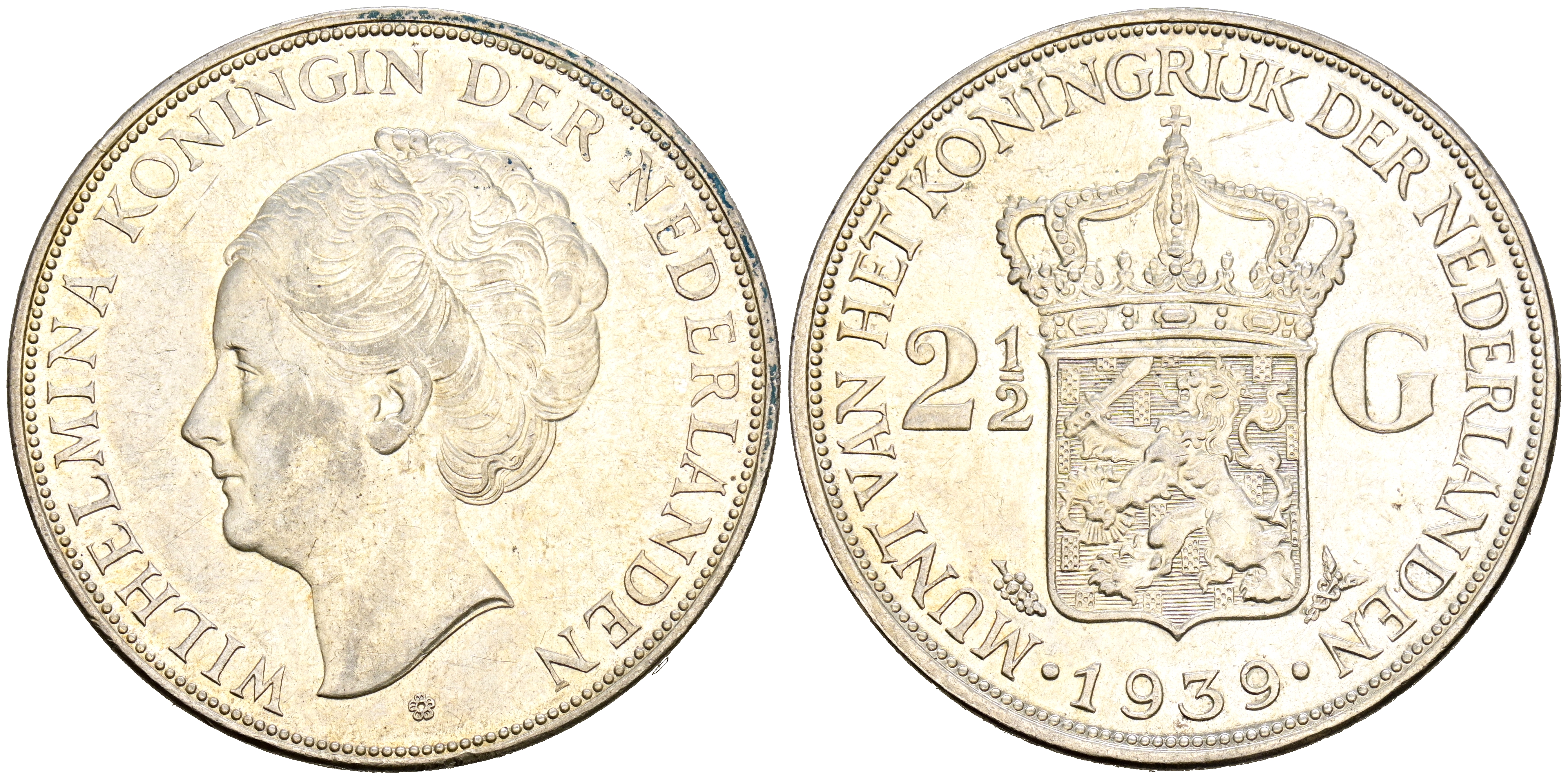 PAÍSES BAJOS, Guillermina. 2 1/2 Gulden. (Ar. 24,92g/38mm). 1939. (Km#165). EBC. Brillo original. Marquitas.