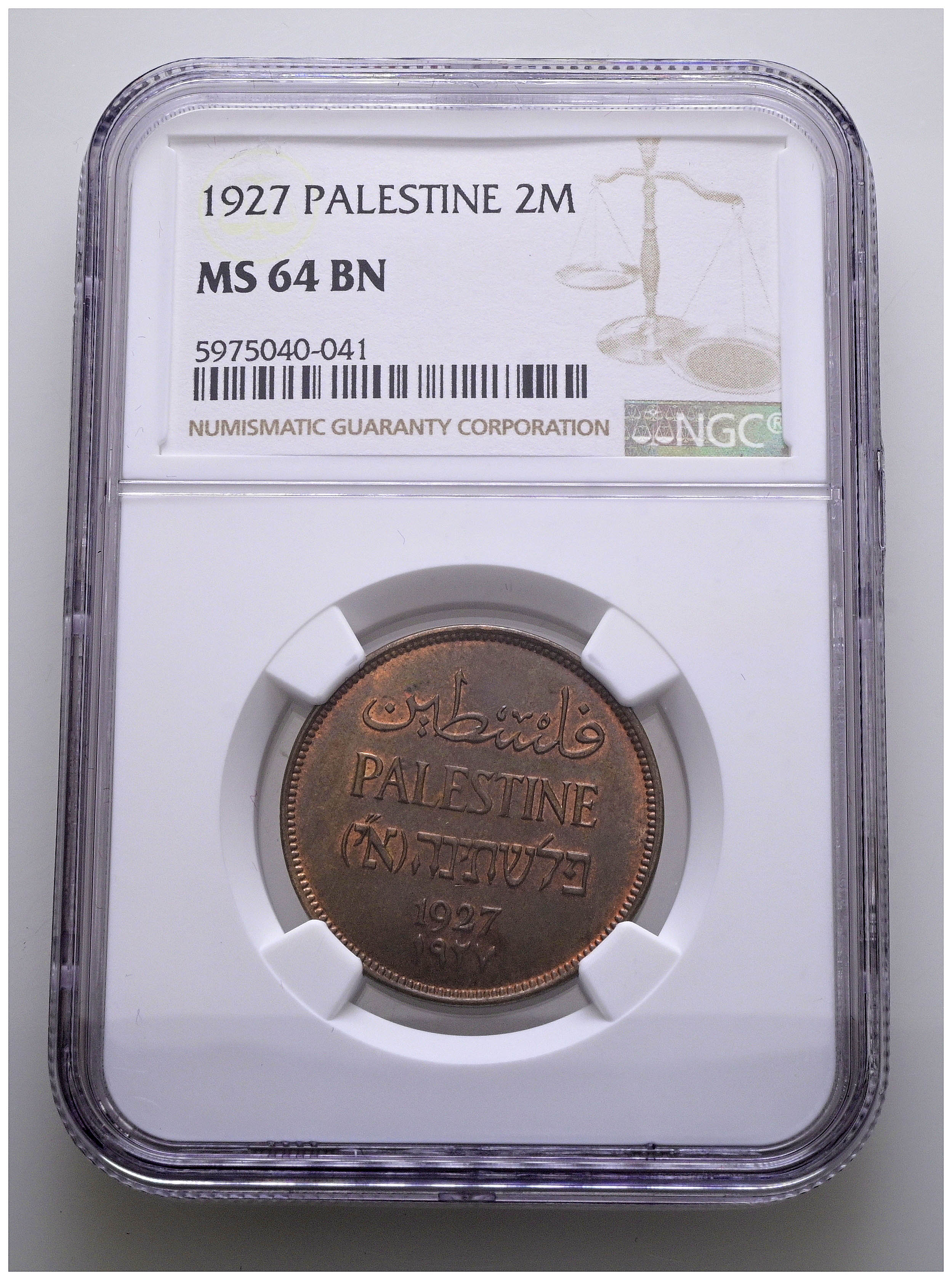 PALESTINA, Administración Británica. 2 Mils. (Ae. 7,80g/28mm)*. 1927. (Km#2). Encapsulado por NGC MS 64 BN. *Peso y medidas teóricos.
