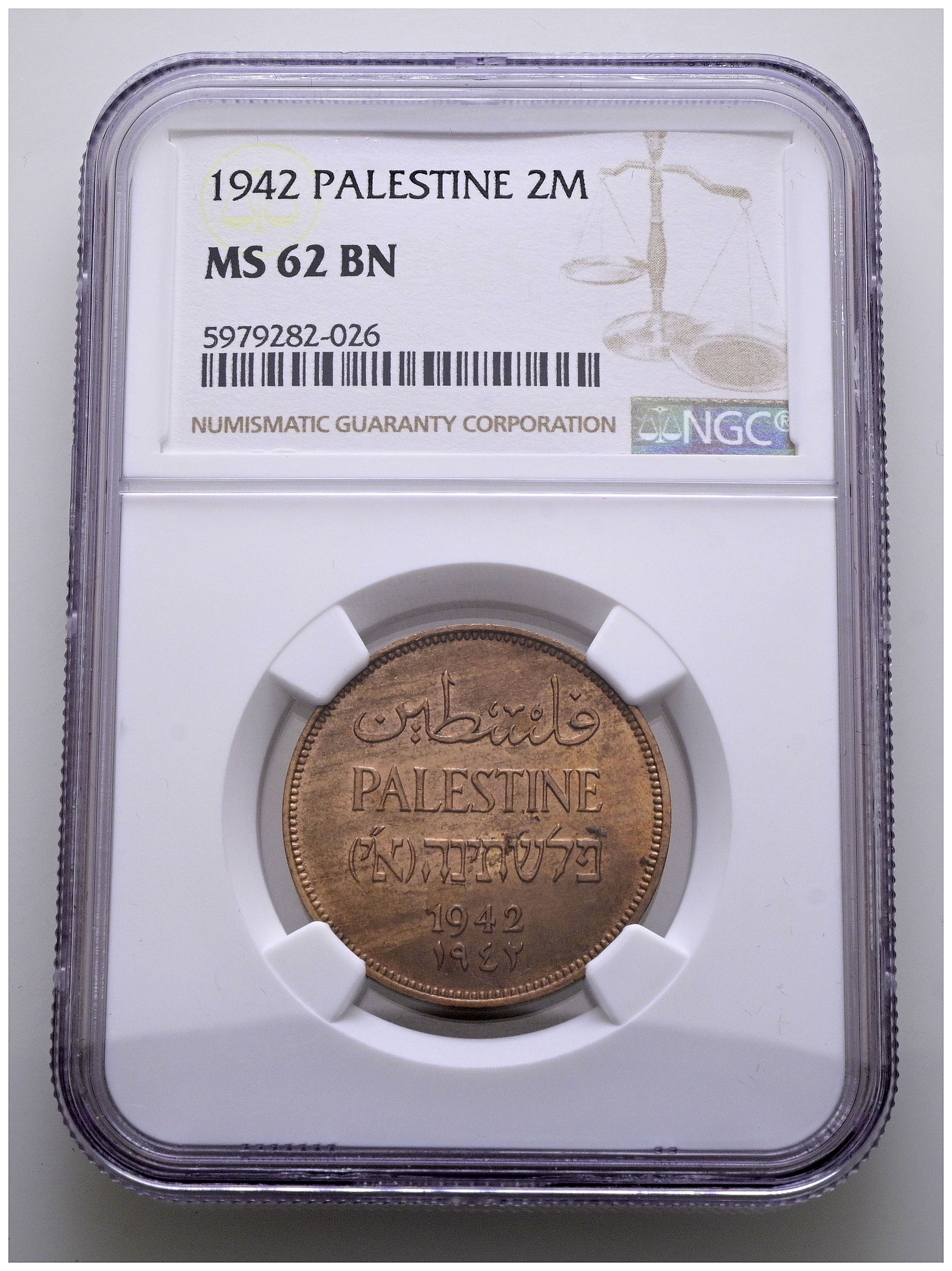 PALESTINA, Administración Británica. 2 Mils (Ae. 7,80g/28mm)*. 1942. (Km#2). Encapsulado por NGC MS 62 BN. *Peso y medidas teóricos.
