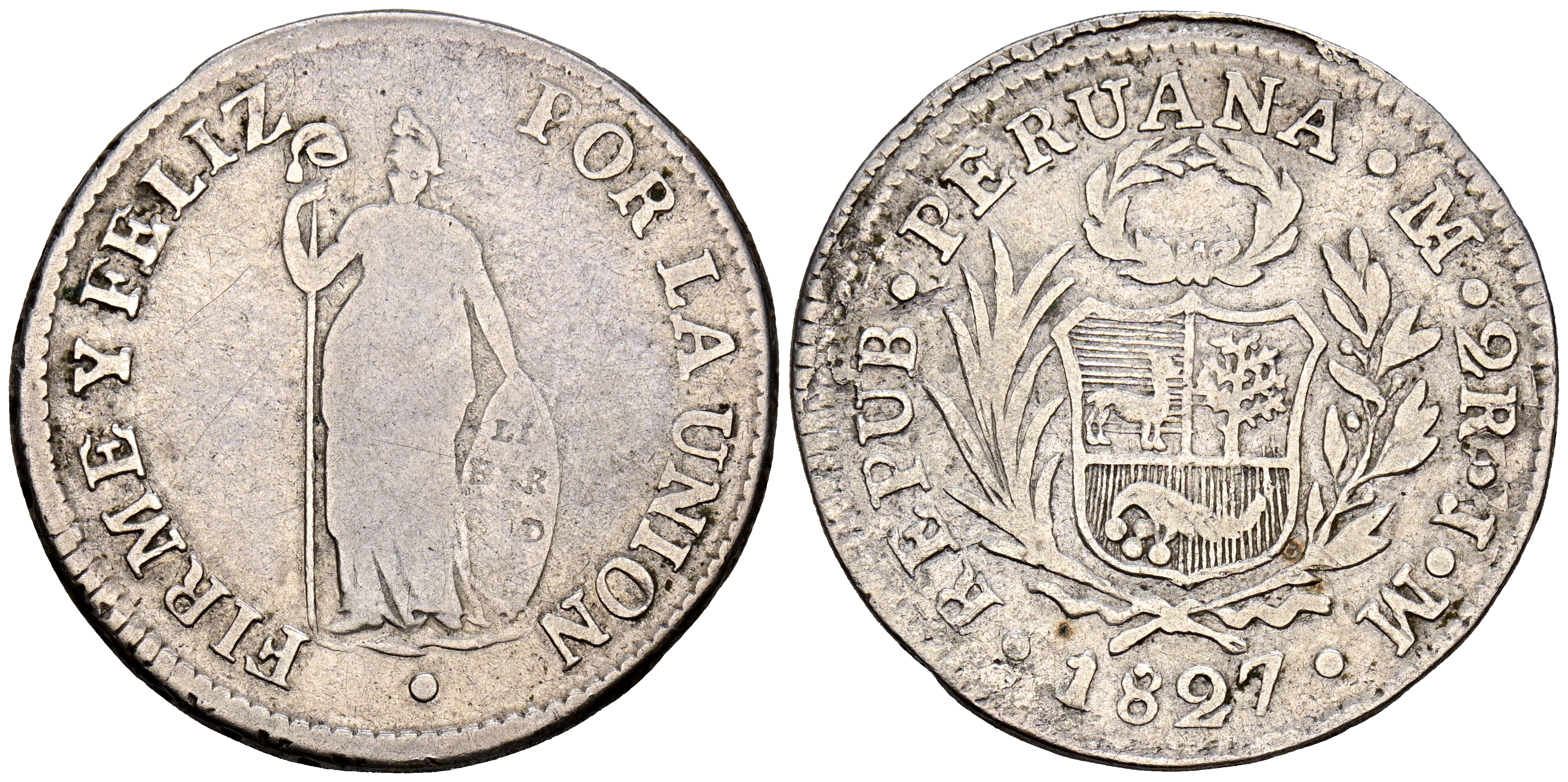 PERÚ. 2 Reales. (Ar. 6,45g/28mm). 1827. Lima JM. (Km#141.1). MBC/MBC-.