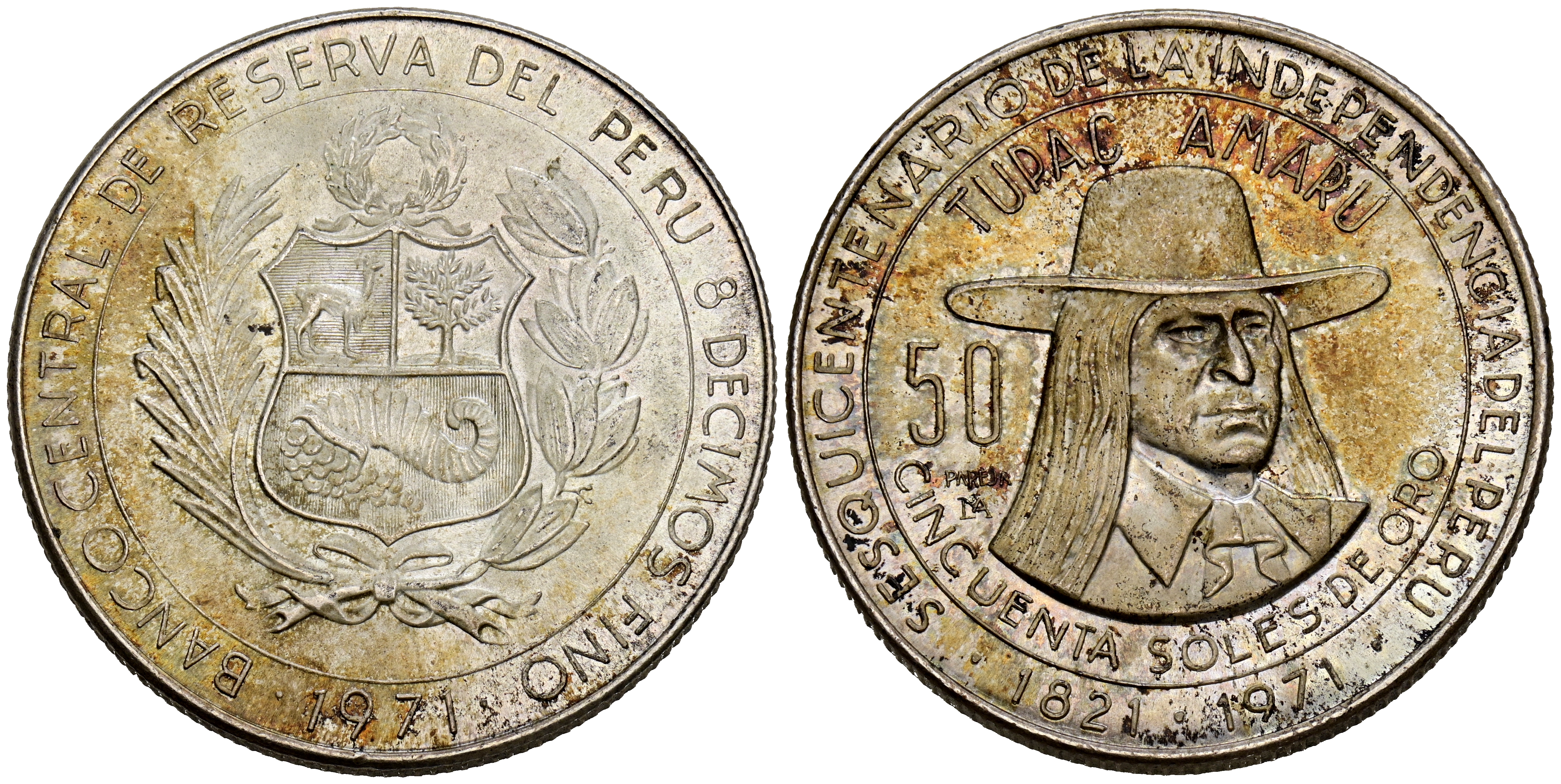 PERÚ. 50 Soles. (Ar. 21,44g/37mm). 1971. 150 Aniversario de la Independencia. (Km#256). EBC/EBC-. Oxidaciones especialmente en reverso.