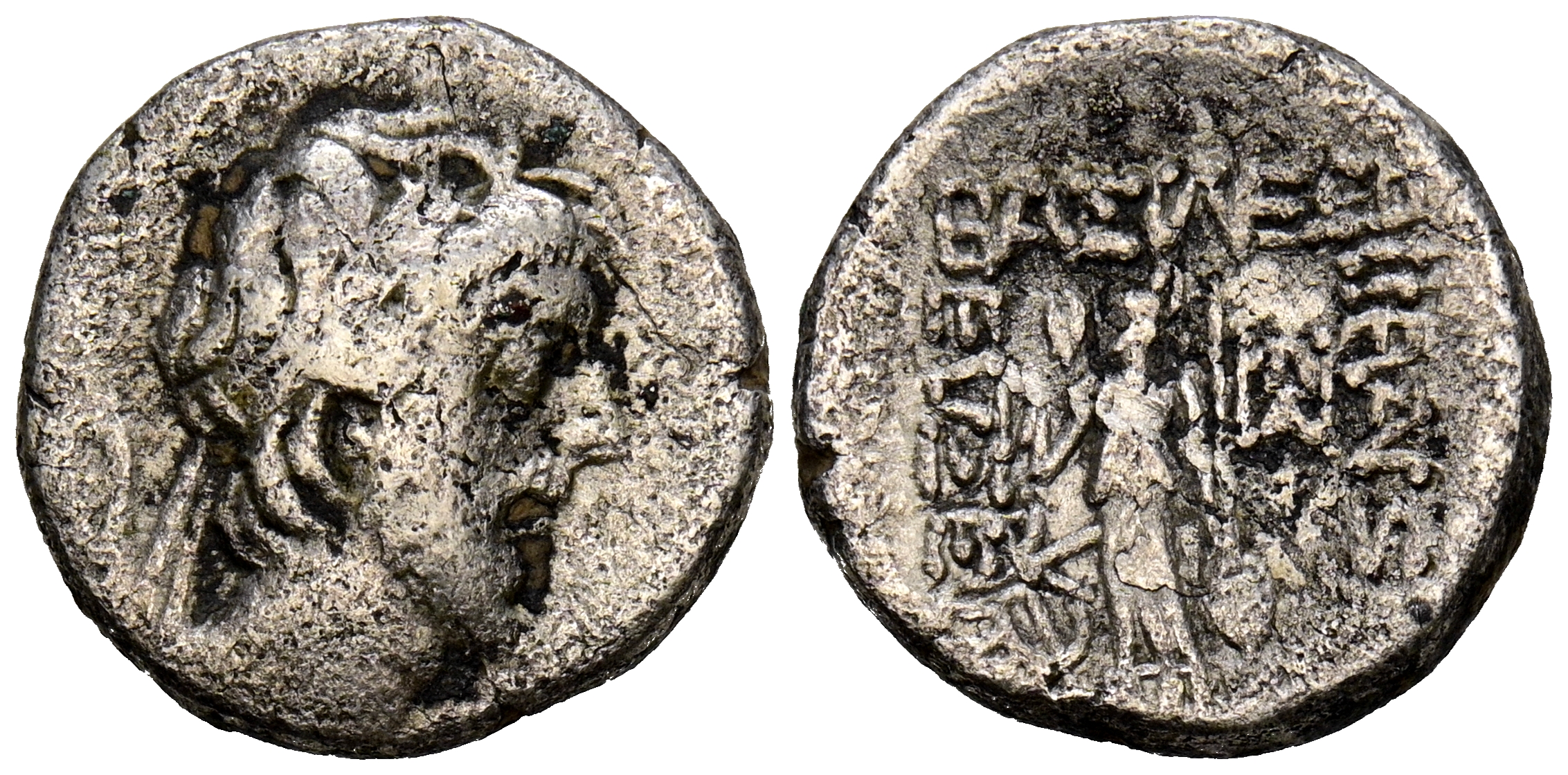 REYES DE CAPADOCIA, Ariobarzanes III Eusebes Philoromaios. Dracma. (Ar. 3,40g/15mm). 52-42 a.C. (HGC 7, 853). Anv: Cabeza laureada a derecha. Rev: Atenas portando Nike con corona de laurel y lanza, detrás escudo, delante estrella y creciente, detrás monograma griego, alrededor leyenda griega: ΒΑΣΙΛΕΩΣ ΑΡΙΟΒΑΡΖΑΝΟΥ ΕΥΣΕΒΟΥΣ ΚΑΙ ΦΙΛΟΡΩΜΑΙΟΥ. MBC-.