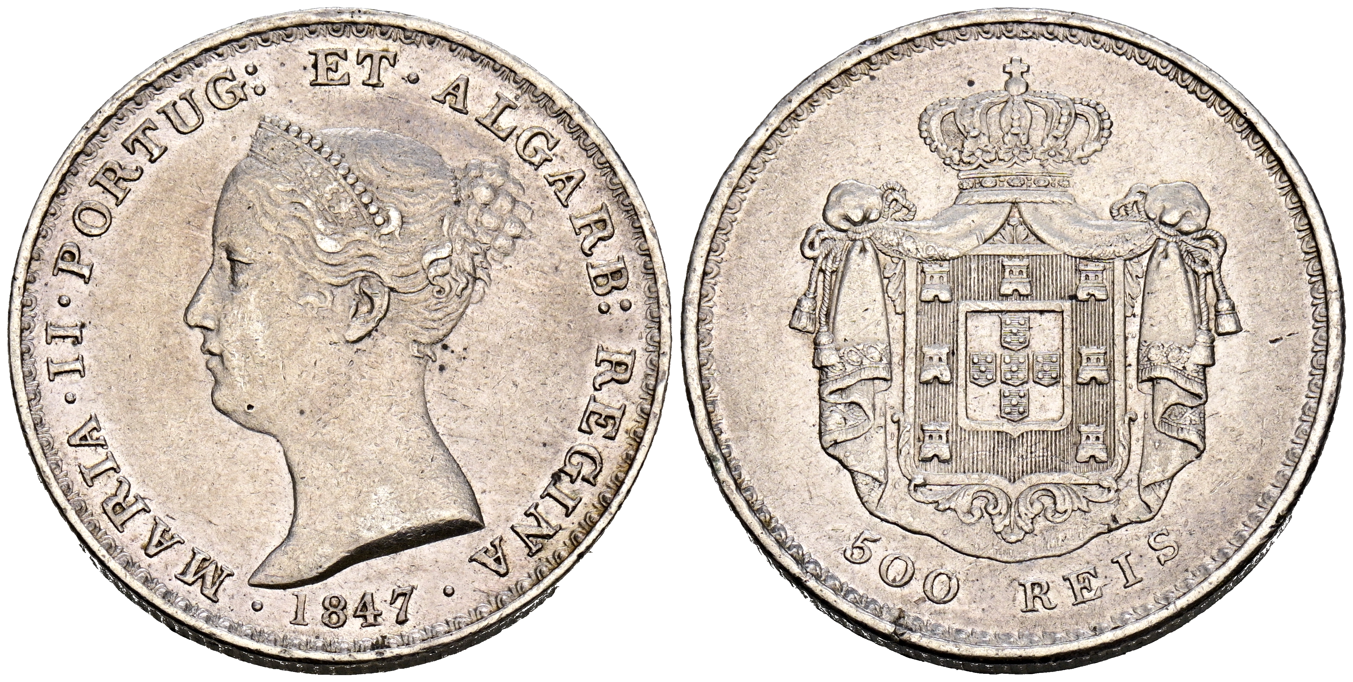 PORTUGAL, María II. 500 Reis. (Ar. 14,67g/30mm). 1847. (Gomes 39.13). MBC+.