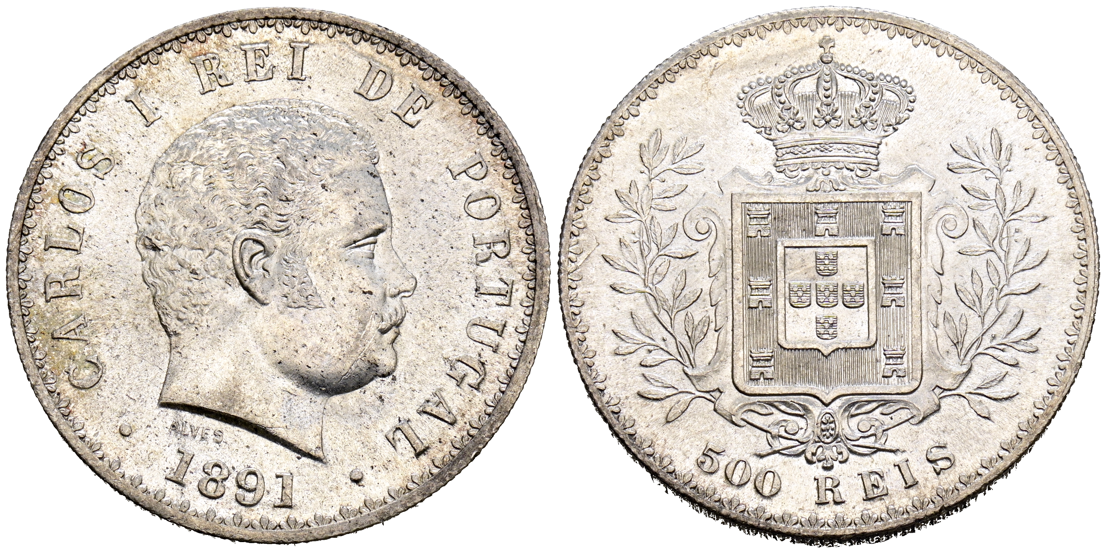 PORTUGAL, Carlos I. 500 Reis. (Ar. 12,76g/31mm). 1891. (Gomes 11.01). SC-.