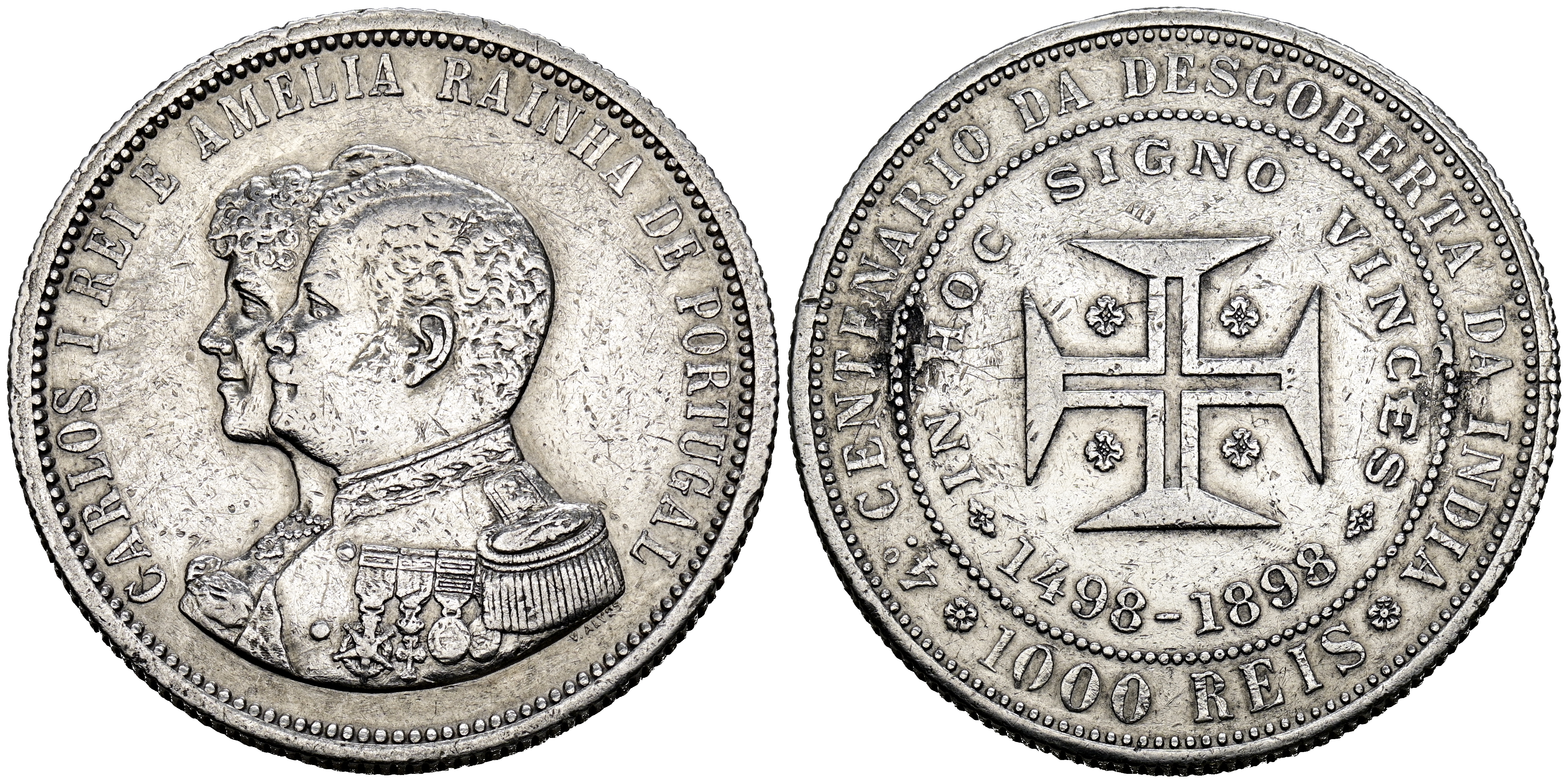 PORTUGAL, Carlos I. 1000 Reis. (Ar. 24,92g/37mm). 1898. IV Centenario del Descubrimiento de la India. (Km#539). MBC. Escasa.