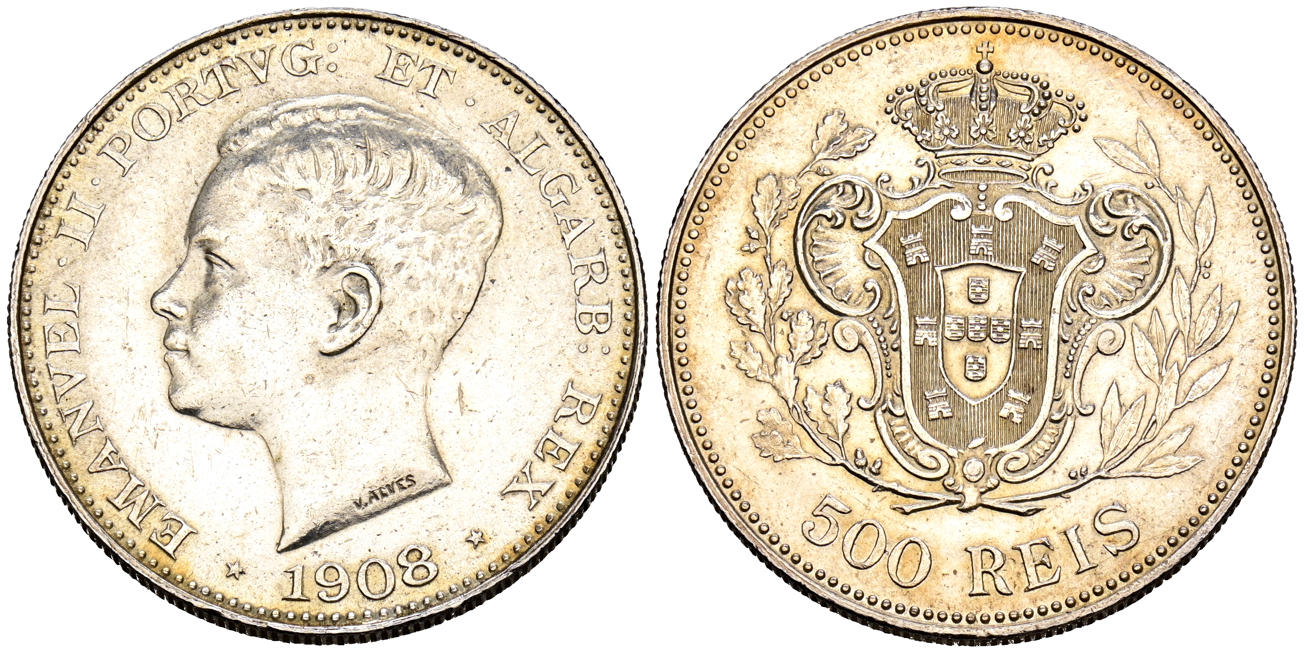 PORTUGAL, Carlos I. 500 Reis. (Ar. 12,57g/31mm). 1908. (Gomes 11.20). EBC. Limpiada.