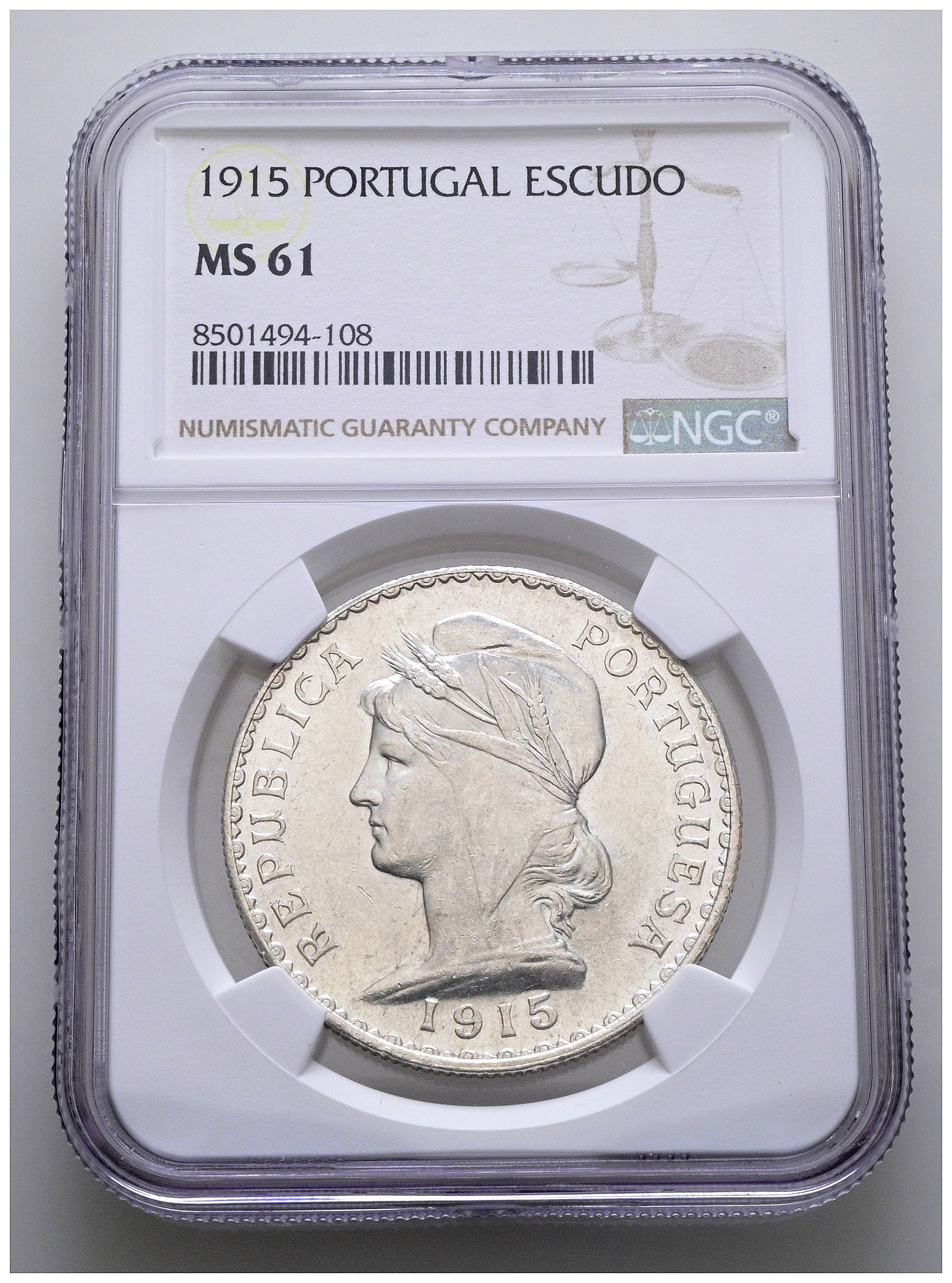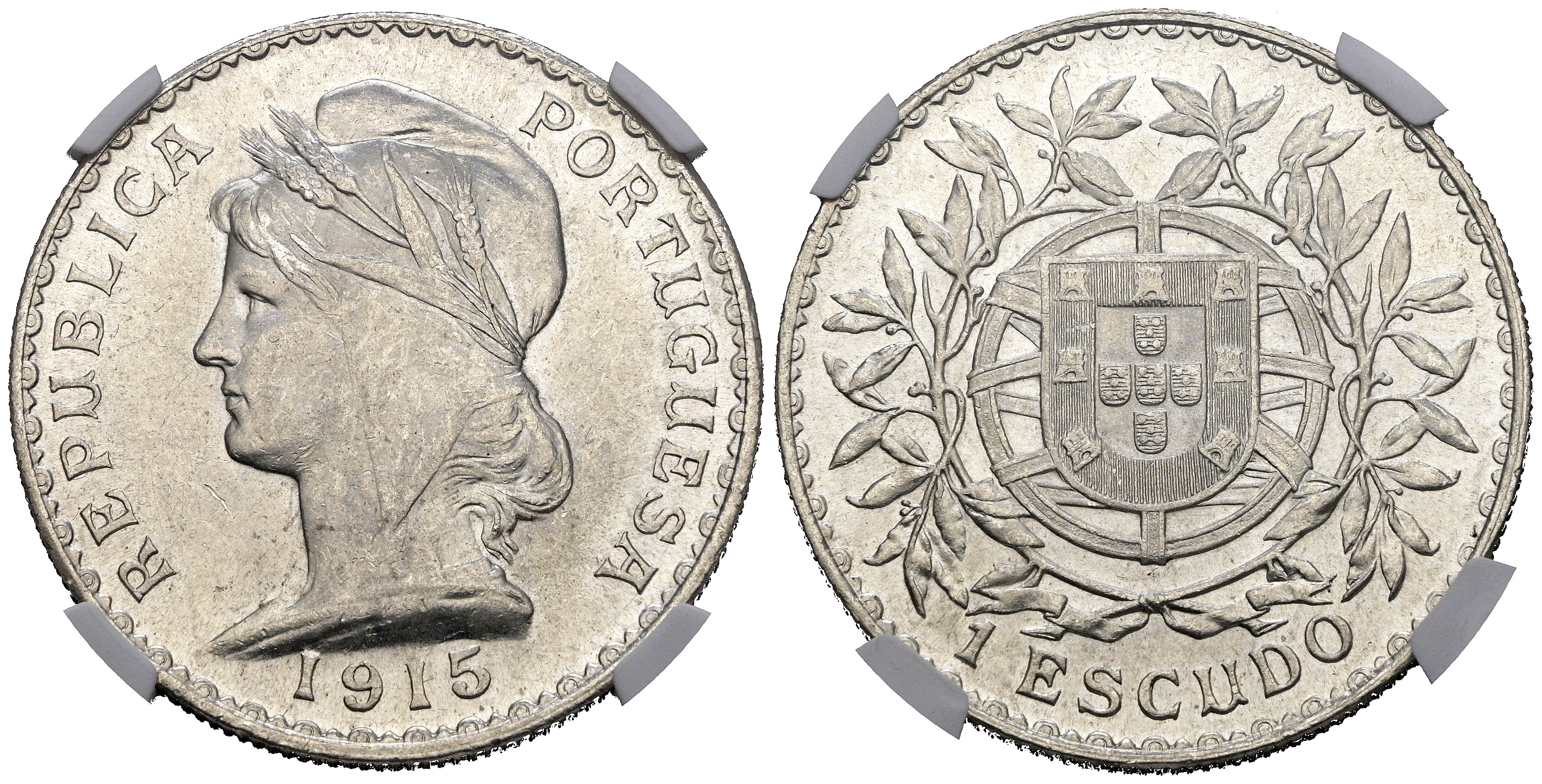 PORTUGAL. 1 Escudo. (Ar. 25,00g/37mm)*. 1915. (Gomes 23.01). Encapsulada por NGC MS 61. Peso y medidas teóricos.