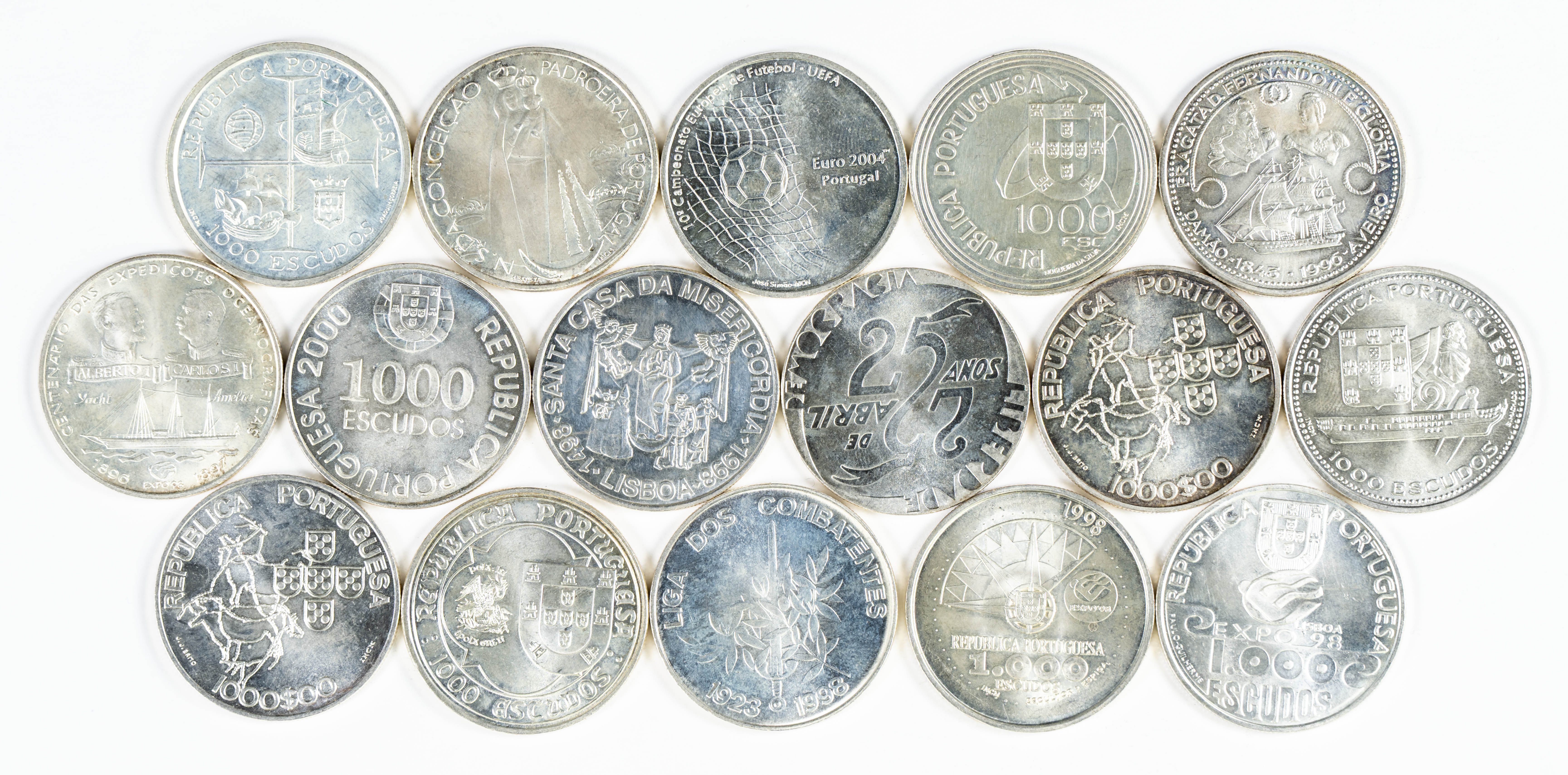 PORTUGAL. Conjunto de 16 monedas de plata con módulo de 1000 Escudos. Ninguna pieza repetida. Excelente estado de conservación general. A EXAMINAR.